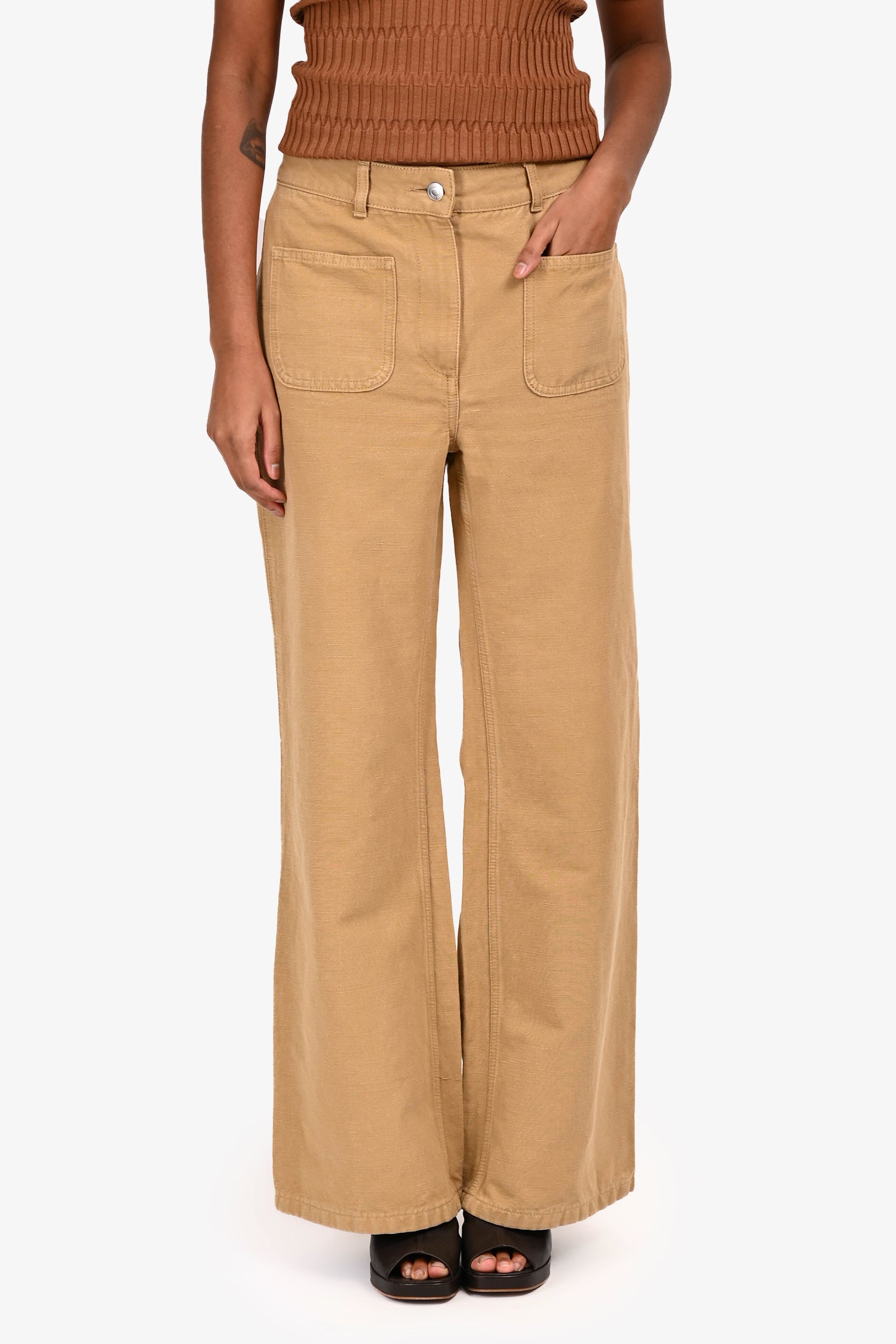 Refresh availabilityLoro Piana Brown Denim Wide Legged Jeans. Pull-on. Front zip with button closure. Waistband belt loops. 4 exterior pockets; 2 front slip, 2 rear slip. Silver-tone hardware. Tonal stitching.