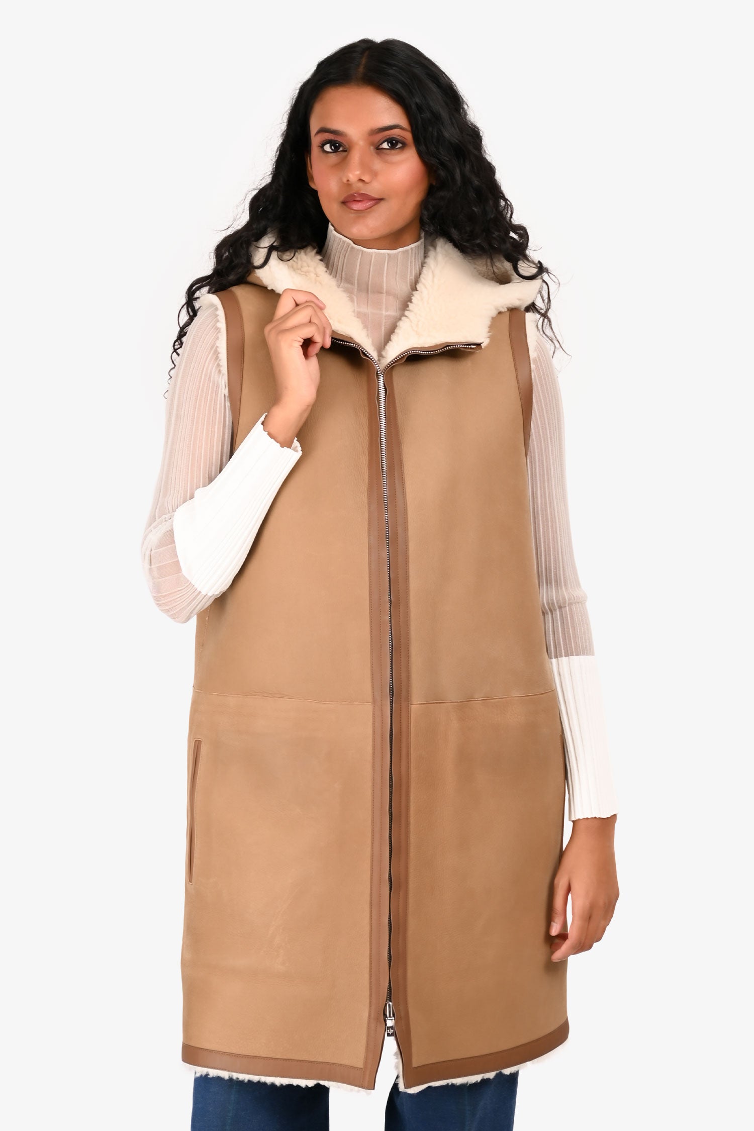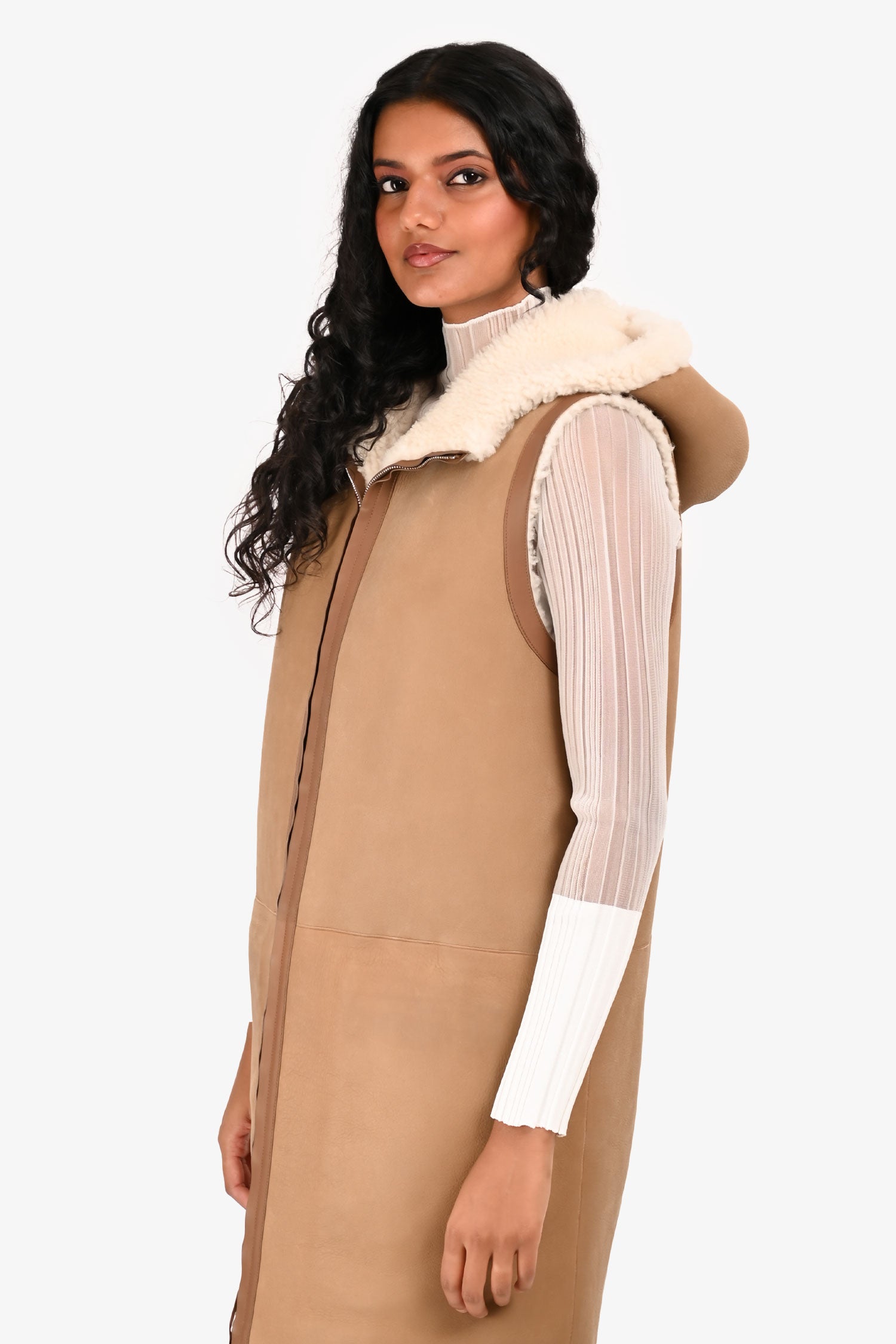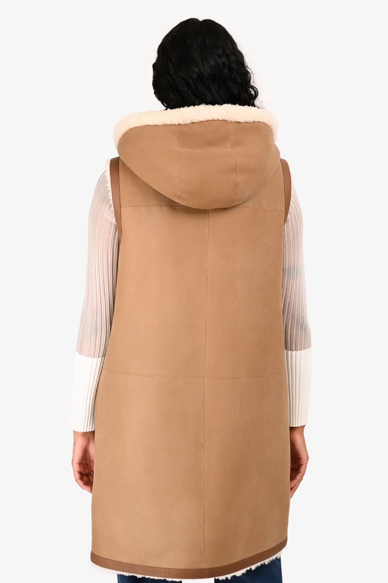Refresh availabilityLoro Piana Brown Leather/Shearling Long Hooded Reversible Vest. Front zip closure. Front pockets.