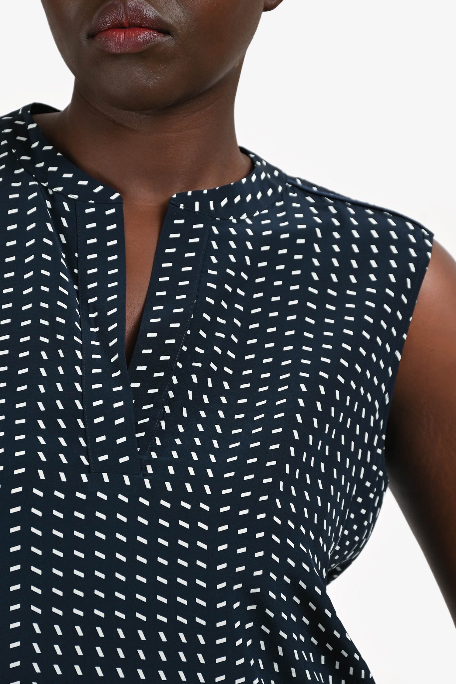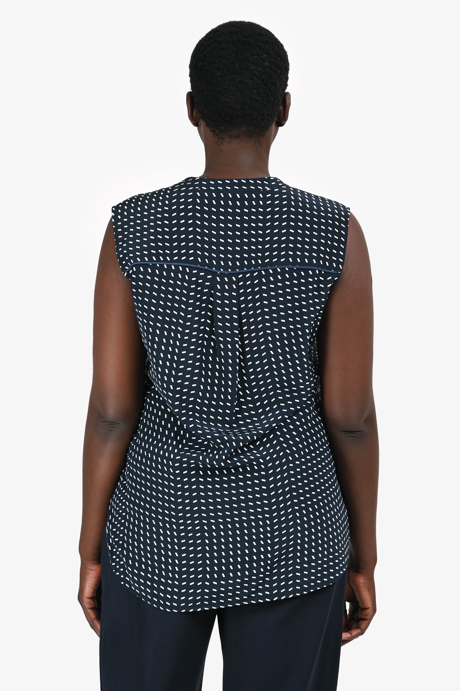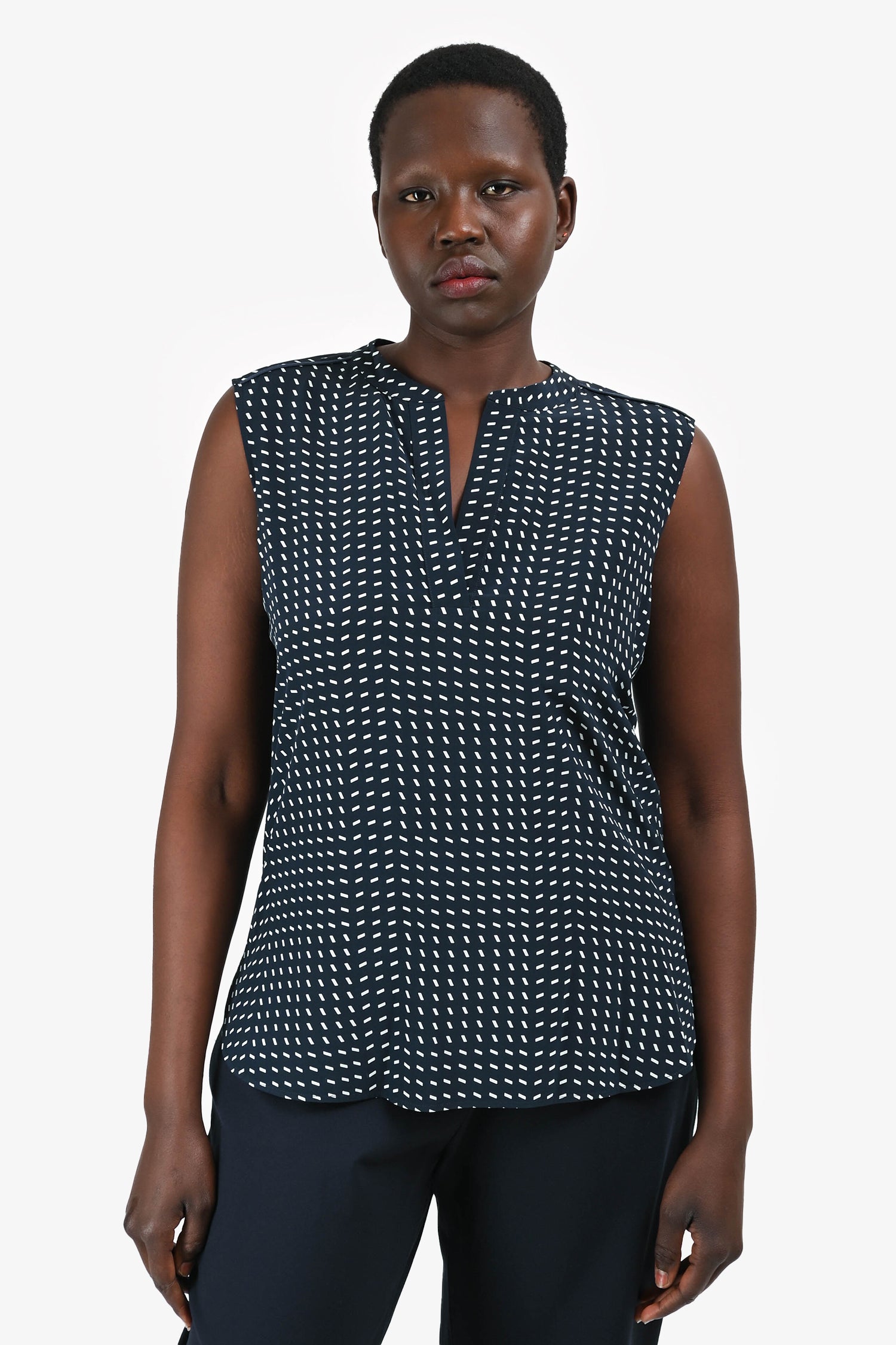 Refresh availabilityLoro Piana Navy/White Silk Printed Sleeveless Top. Split V-neckline. Sleeveless design. Pull-on style. Tonal stitching.