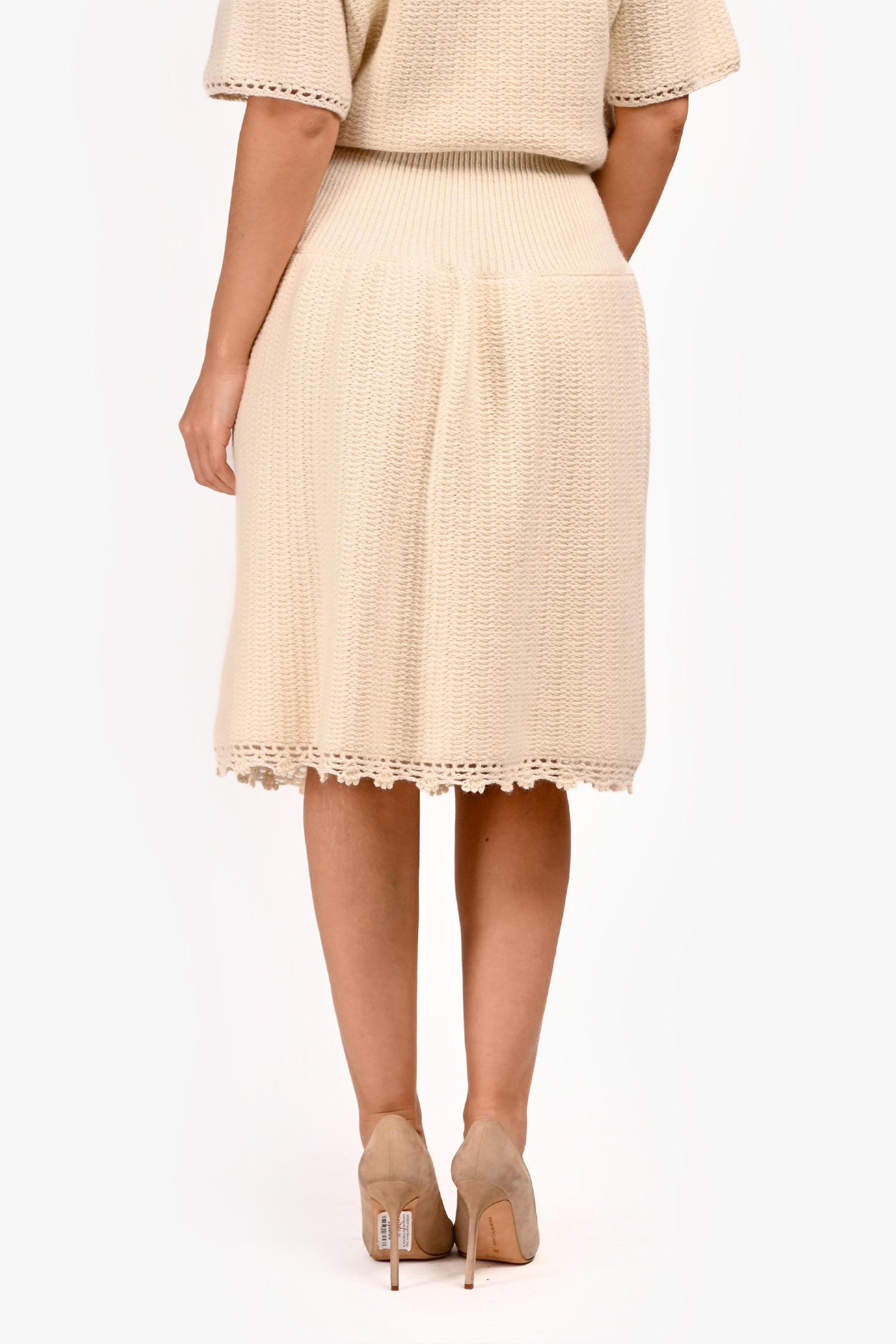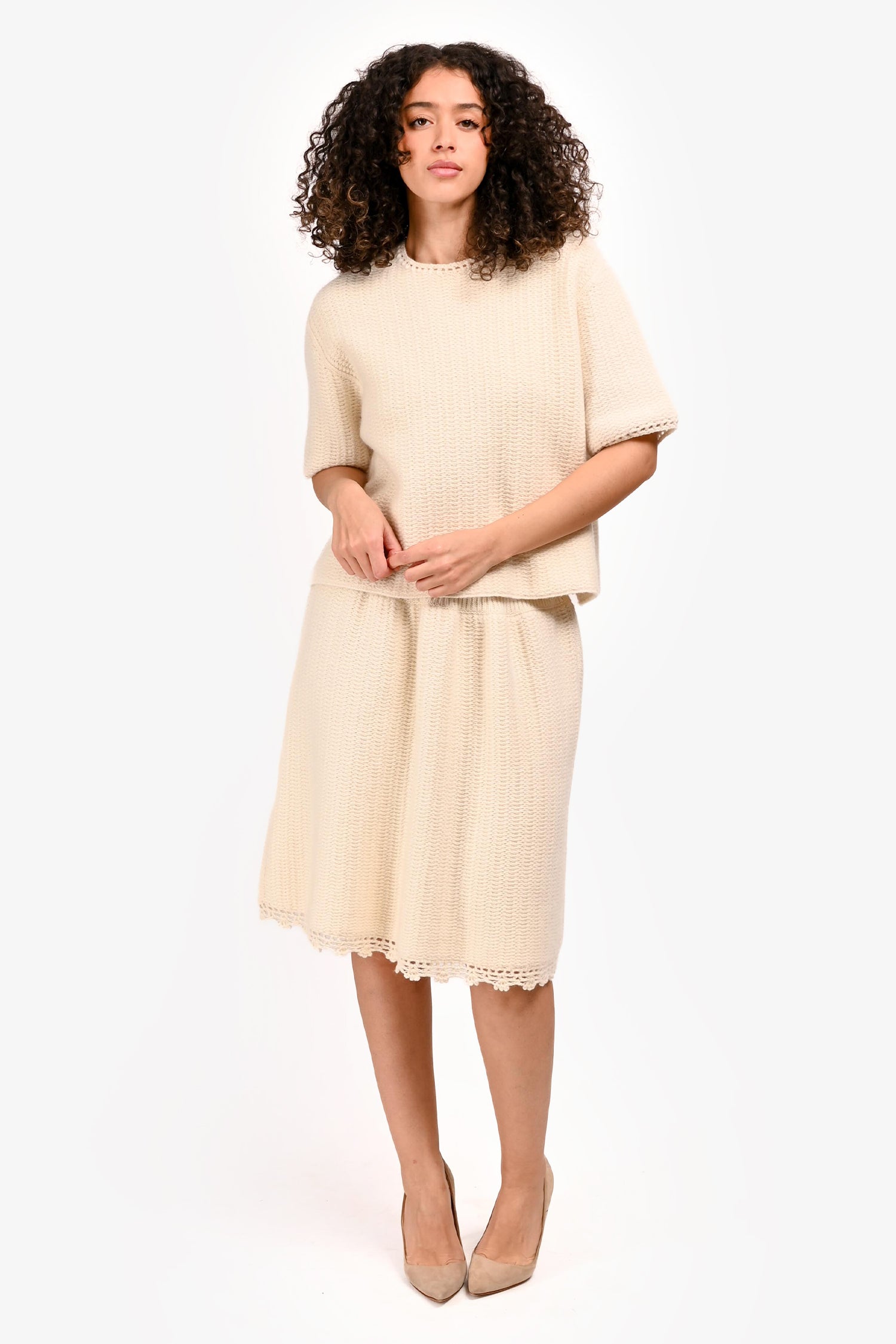 Refresh availabilityLoro Piana White Cashmere/Mohair Fervento Midi Skirt. Pull-on style with ribbed high waistband and flared silhouette. Scalloped hem detail. Unlined. Tonal stitching.