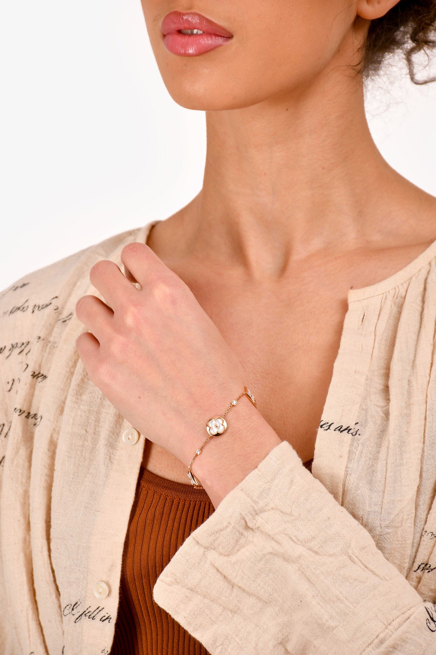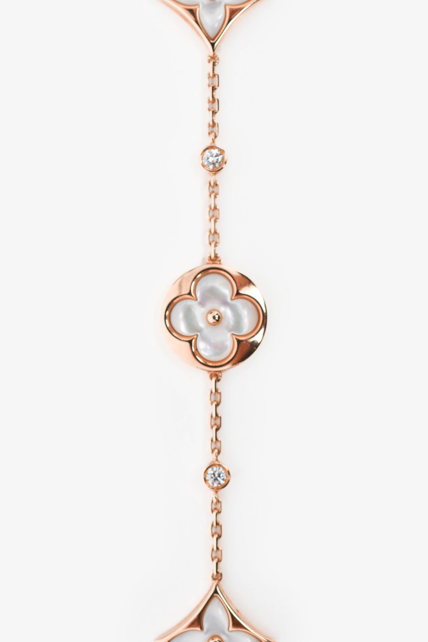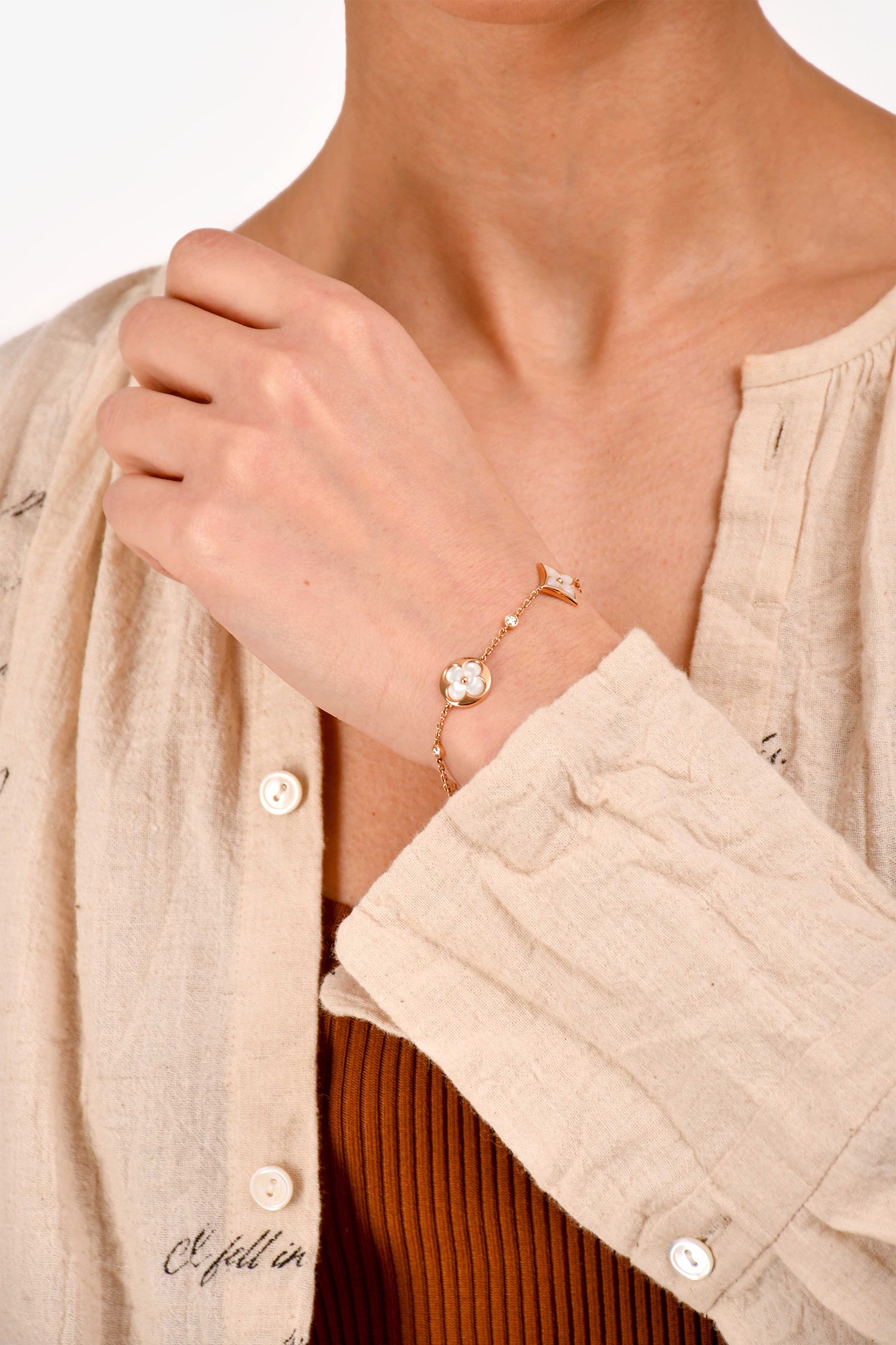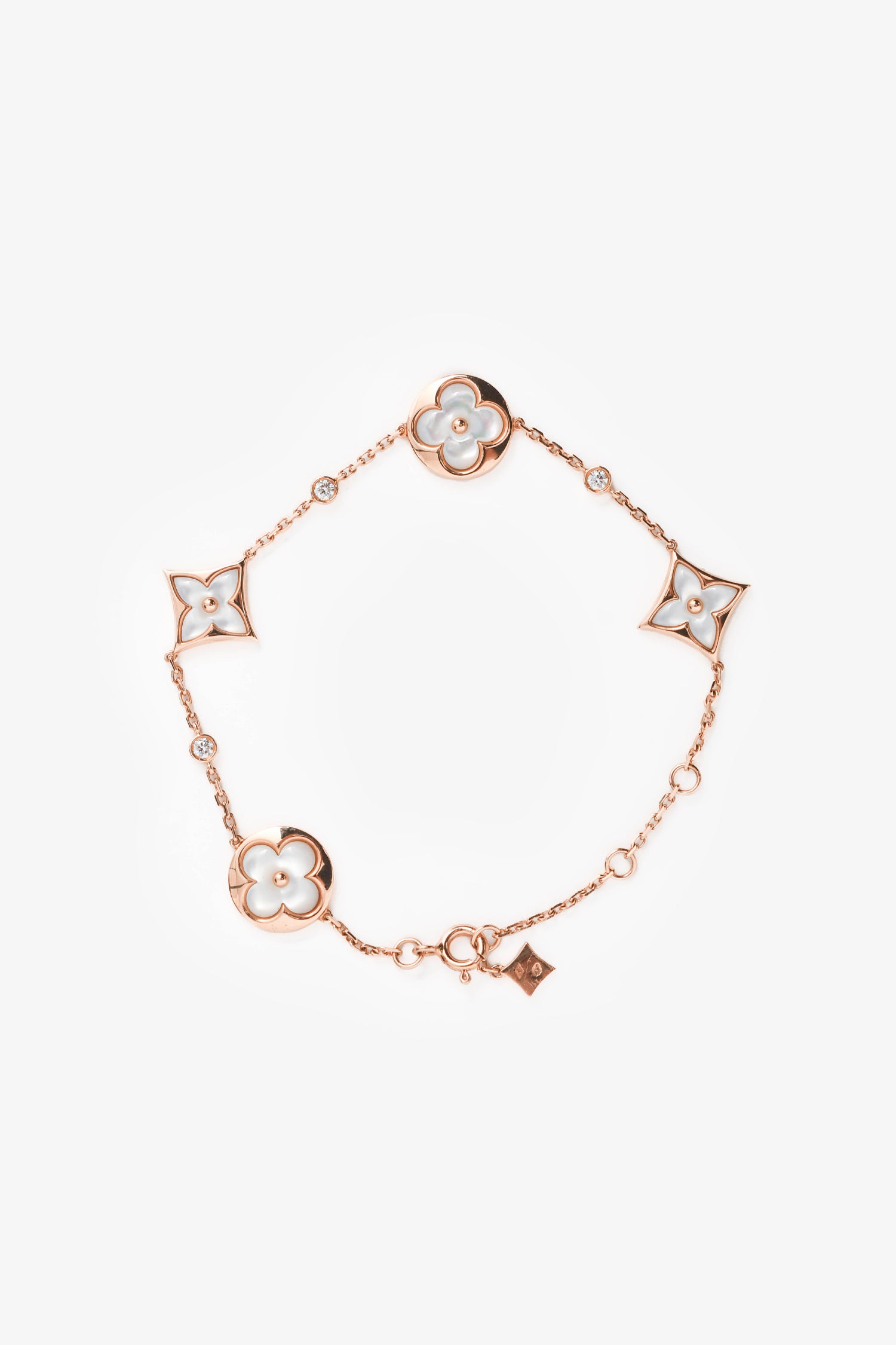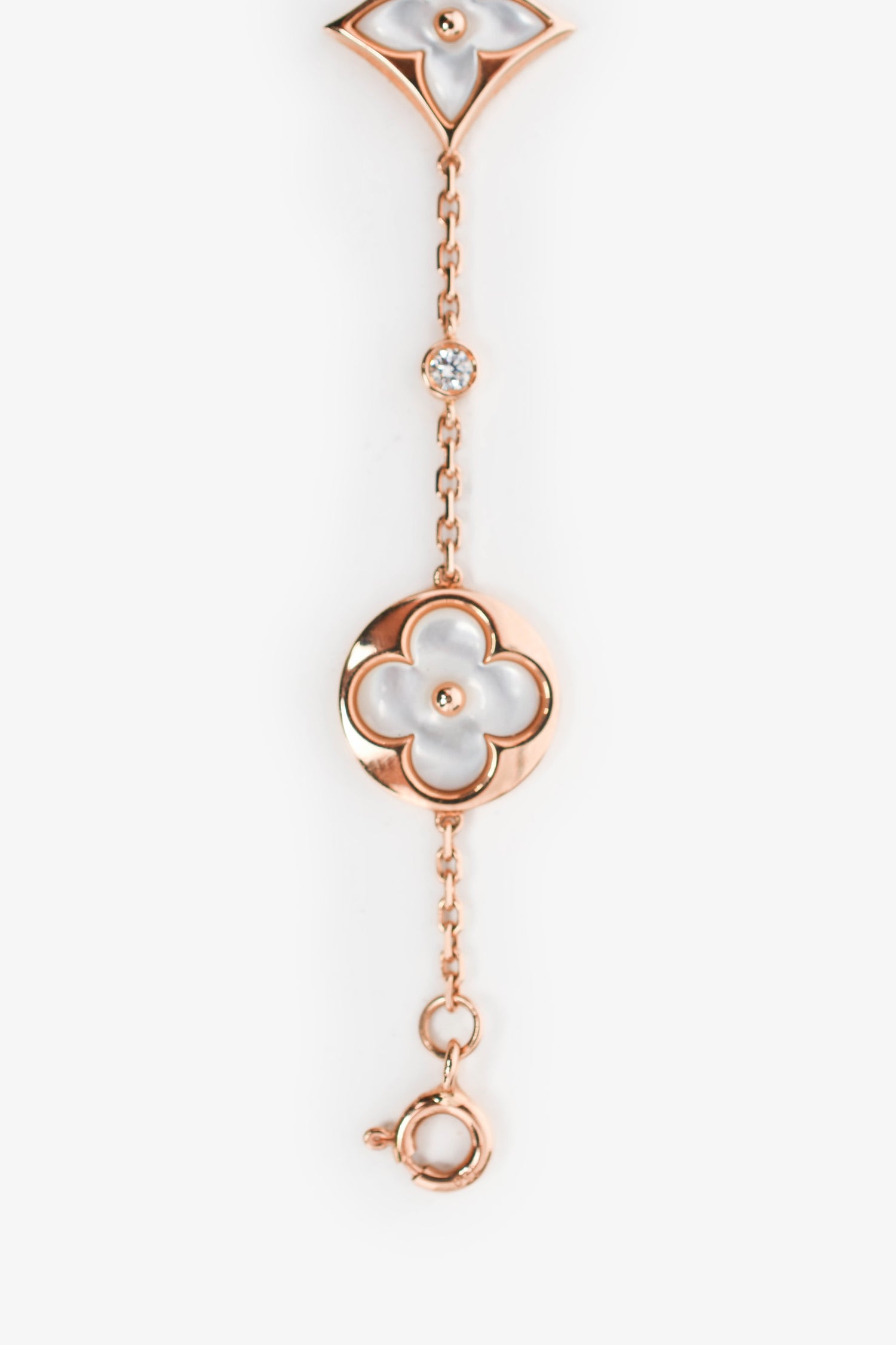Refresh availabilityLouis Vuitton 18K Rose Gold/Mother of Pearl Diamond Set Blossom Bracelet. Lobster claw closure. Rose gold hardware. Pearl and diamond detailing.