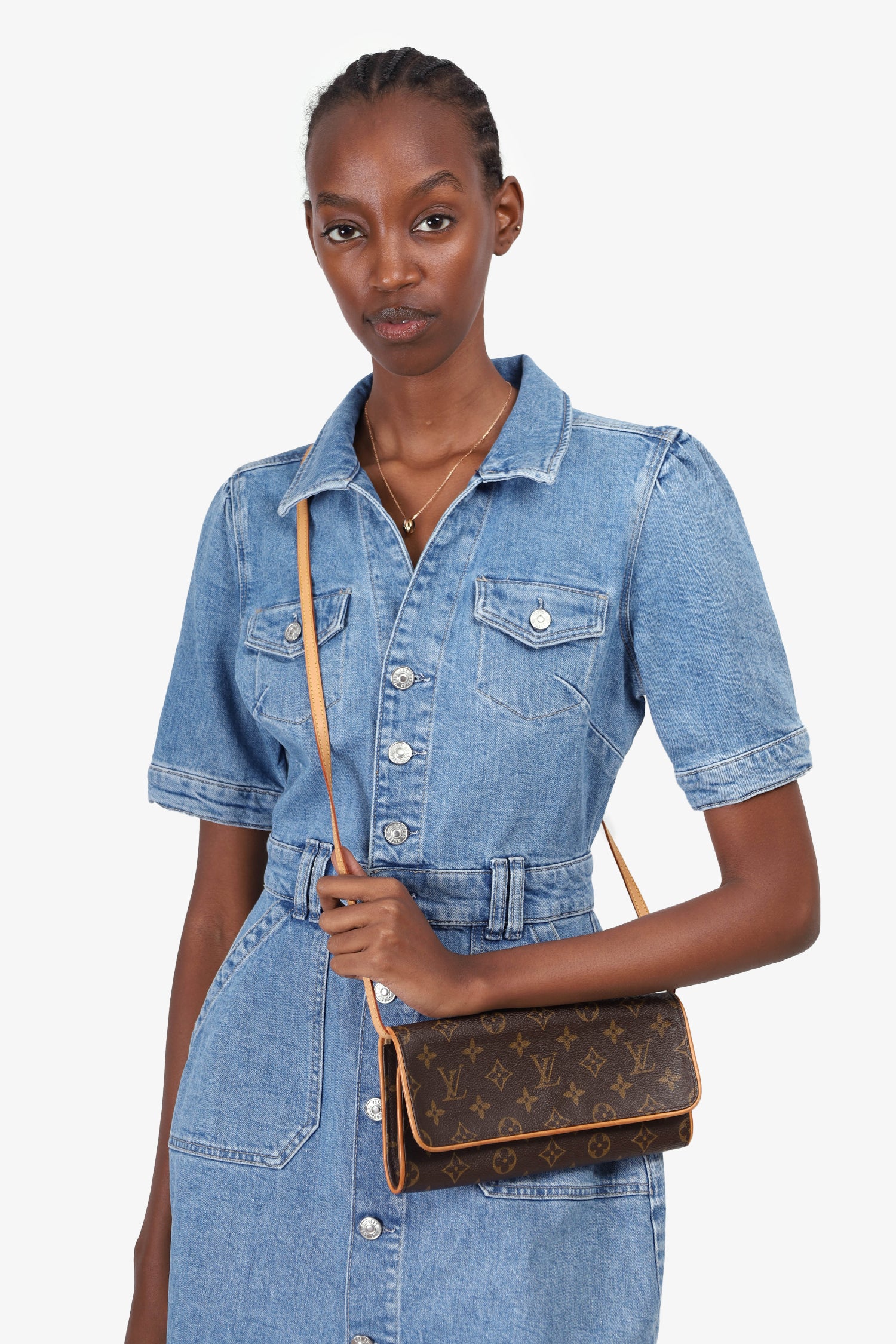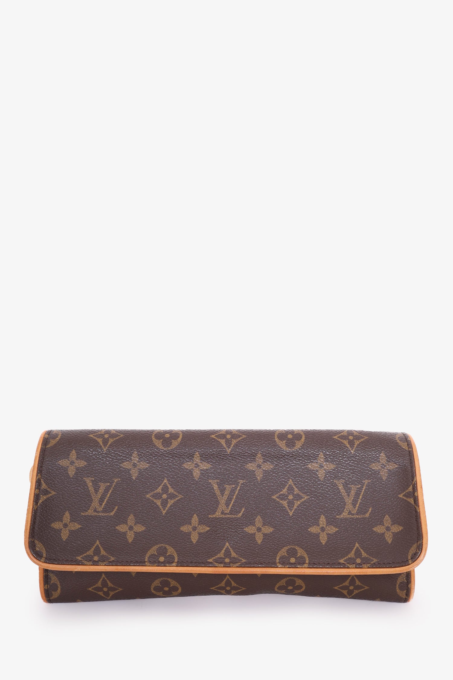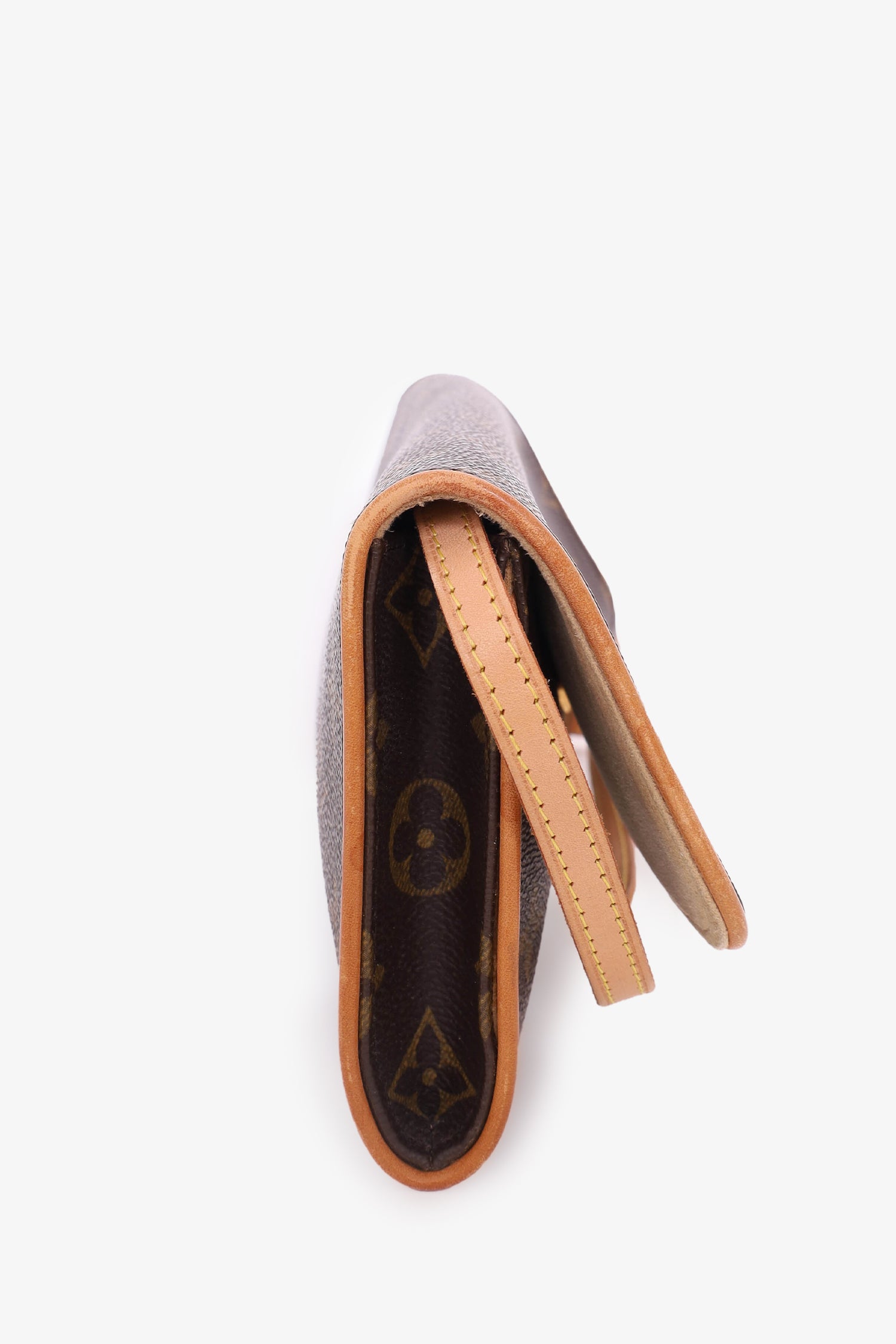 Refresh availabilityLouis Vuitton 2001 Brown Monogram Pochette Twin GM Shoulder Bag. Front fold over flap with magnetic button closure. Single interior wall slip pocket. Suede interior lining. Detachable / adjustable shoulder strap. Tonal stitching.