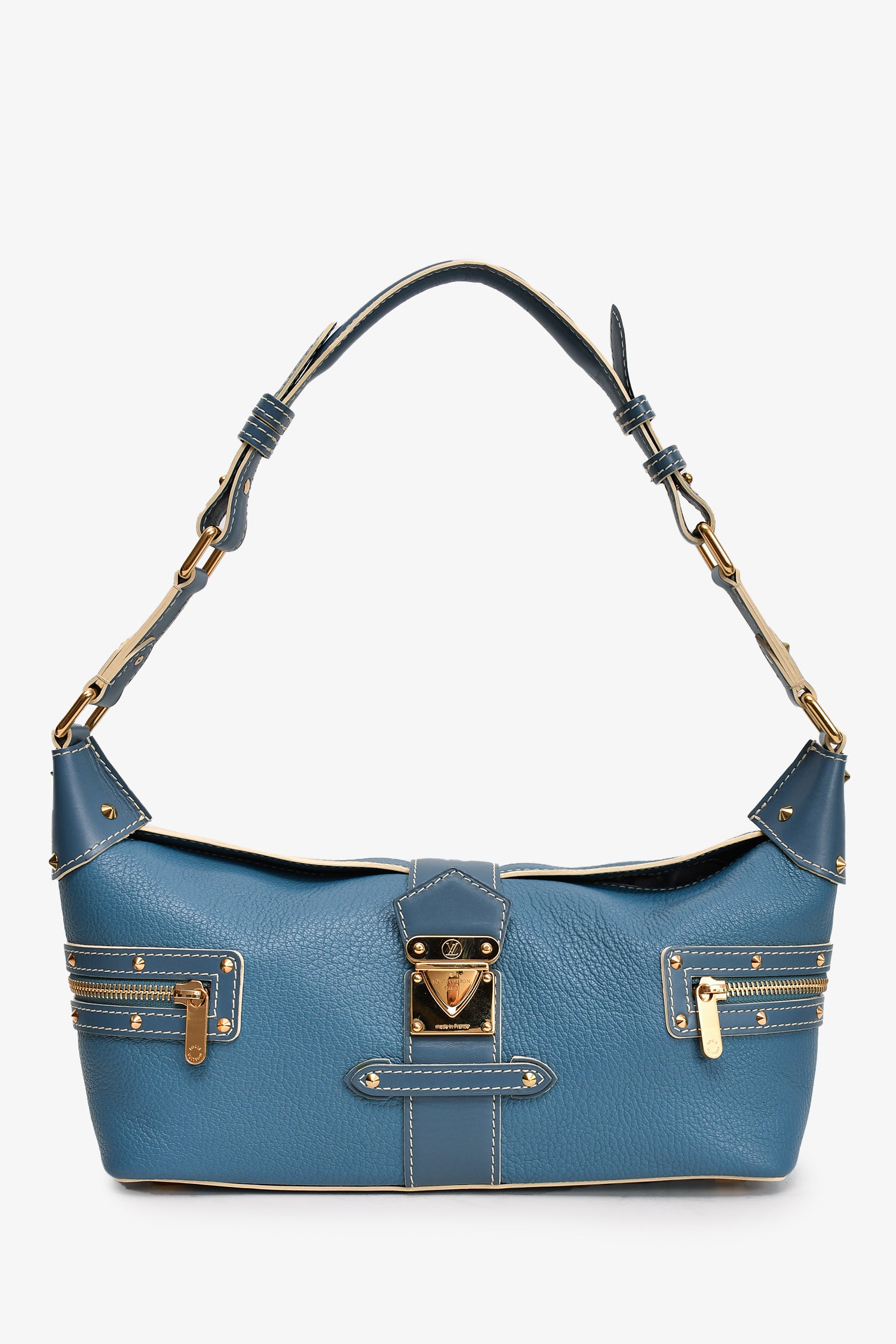 Refresh availabilityLouis Vuitton 2005 Blue Leather Shauli L'impetueux Shoulder Bag. Front fold-over strap with push-lock closure. Grey textile monogram interior lining. Single interior wall slip pocket. Gold-tone hardware. Protective metal bottom.