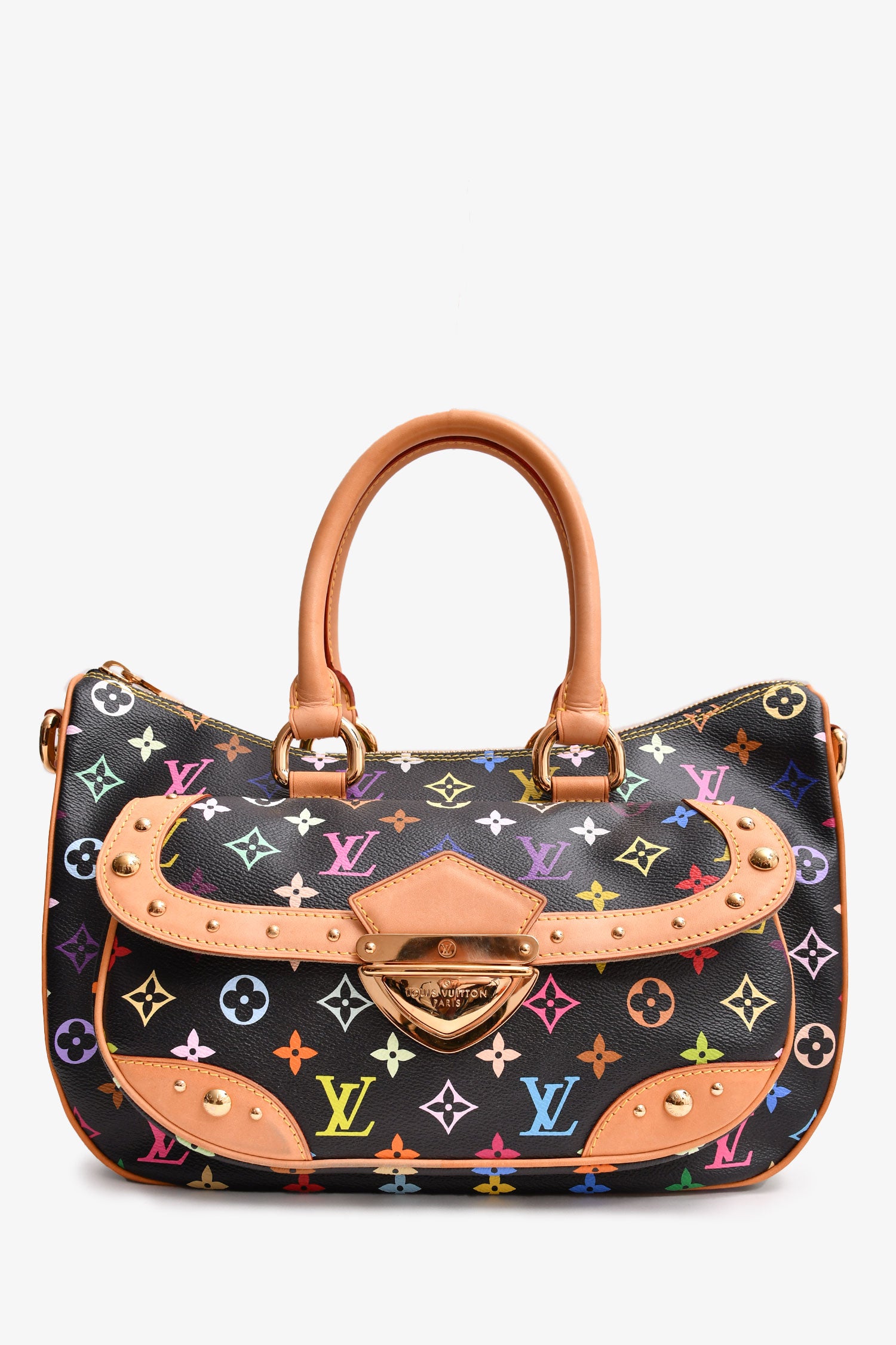 Refresh availabilityLouis Vuitton 2007 Black Multicolore Rita Satchel with Strap. 2 exterior pockets; front pocket with push-lock closure and zip pocket on reverse. Adjustable and removable strap. Top zip closure. Taupe suede interior lining. 2 interior slip pockets. Yellow stitching.