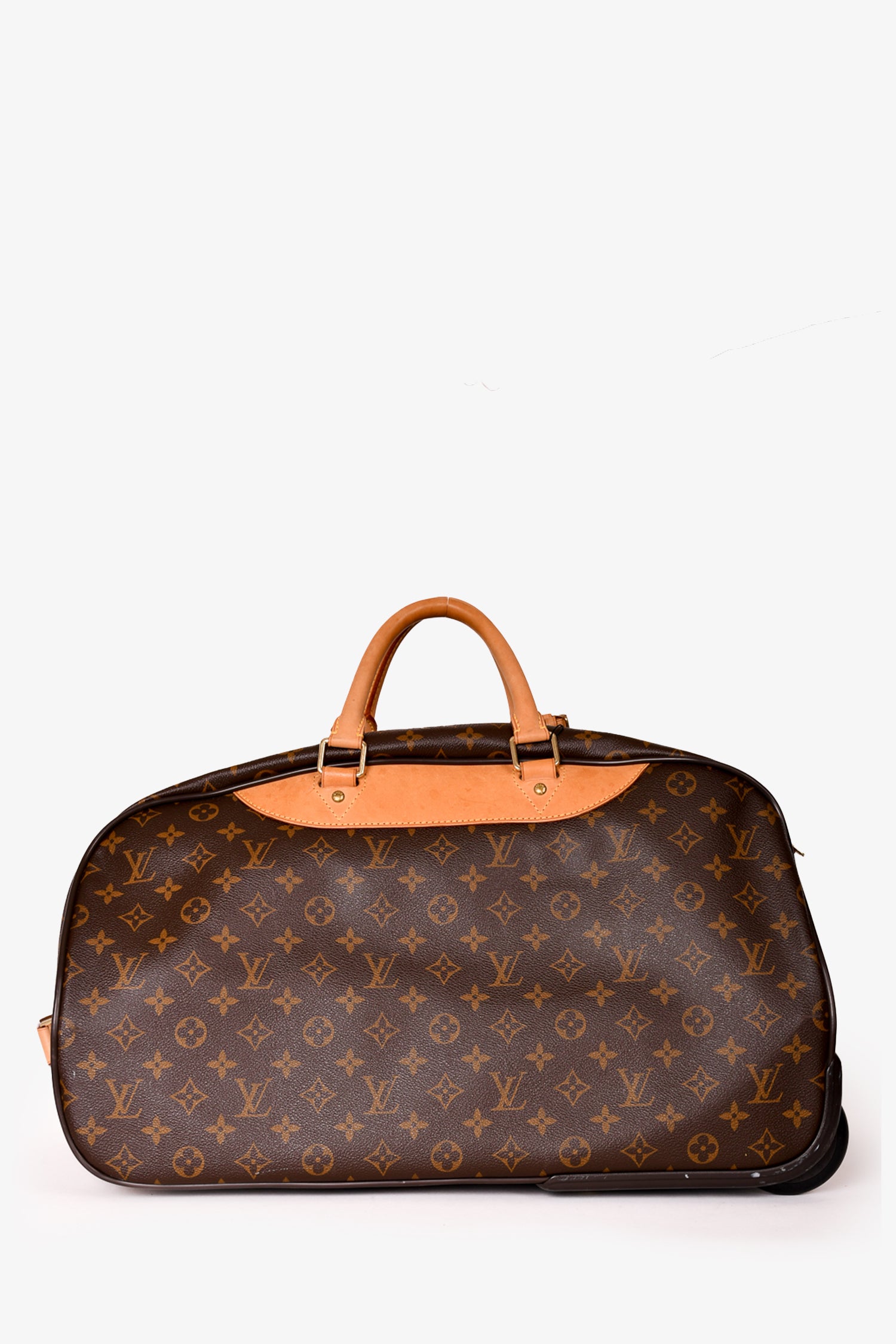 Refresh availabilityLouis Vuitton 2008 Brown Monogram Eole 50 Luggage. Dual rolled handles. Top two-way zip closure. Front pocket with two-way zip closure. Tonal textile interior lining. 2 interior wall slip pockets. Top handle. Extendable luggage handle with zippered compartment. Gold-tone hardware. 2 wheels. Tonal stitching. Comes with signature LV lock and key.