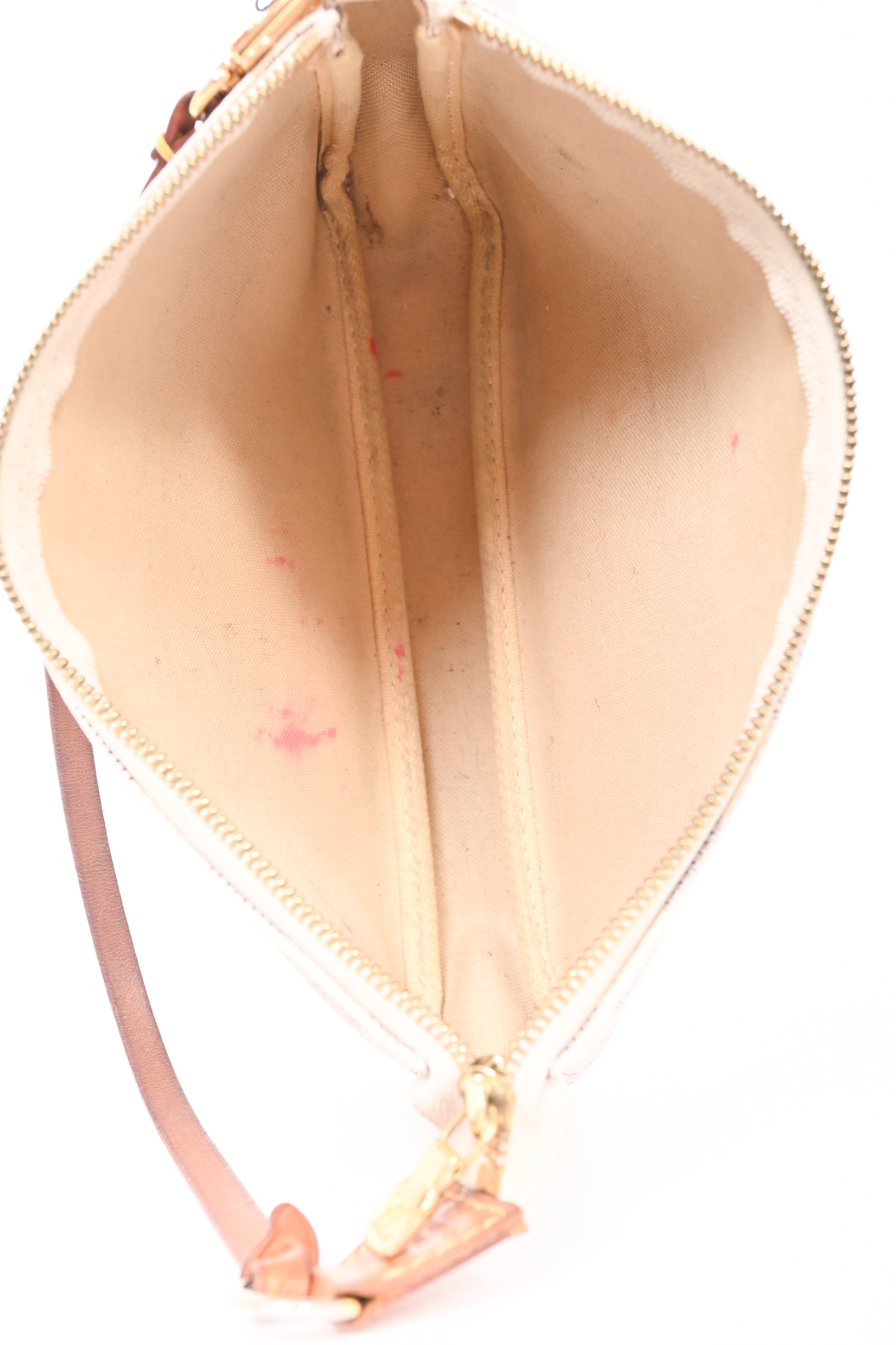Louis Vuitton 2010 Damier Azur Pochette Shoulder Bag. Gold-tone hardware Top zip closure. Cream textile interior lining. Open interior. Tonal stitching.