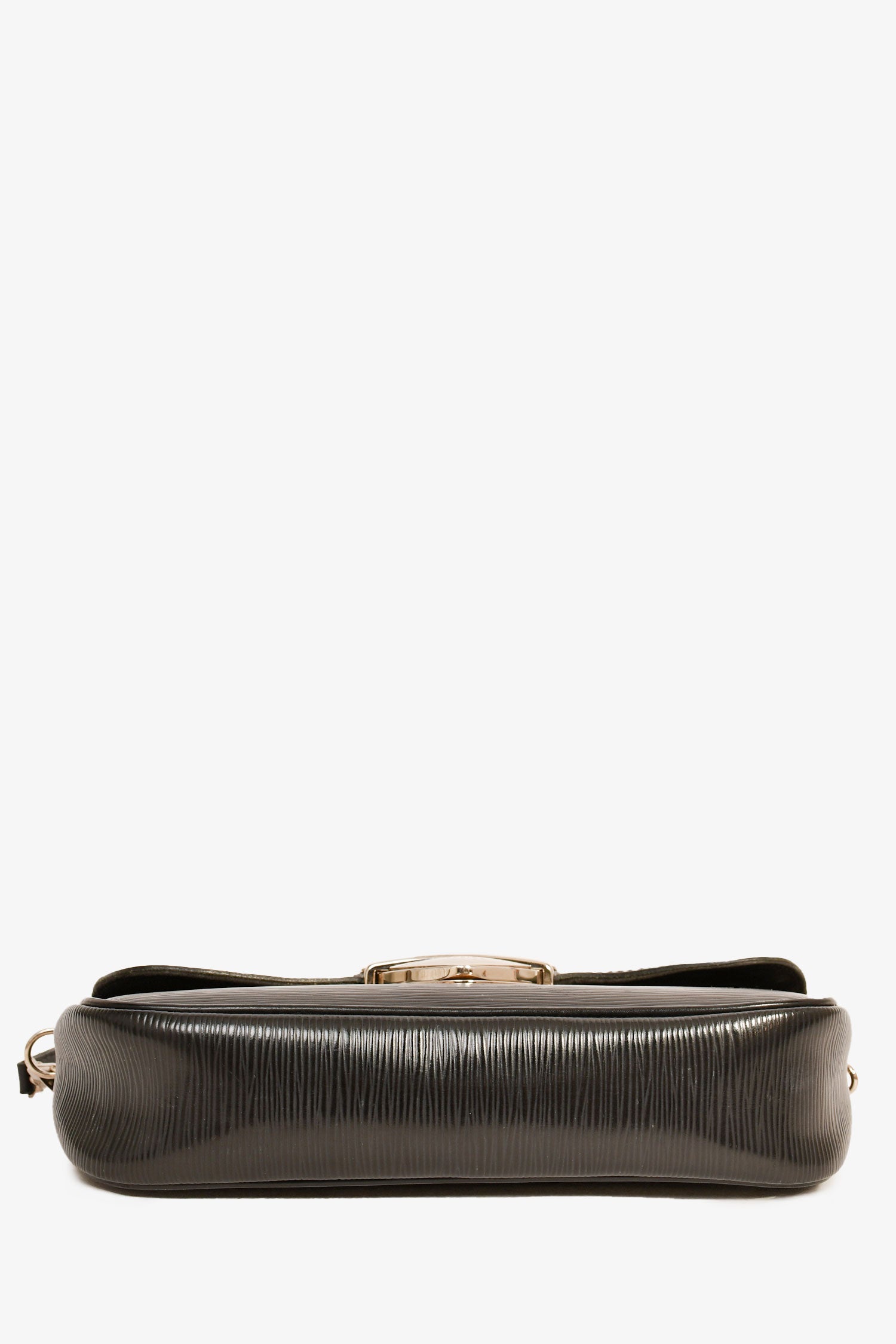 Refresh availabilityLouis Vuitton 2011 Black Epi Leather Montaigne Pochette Shoulder Bag. Silver-tone hardware. Fold-over flap with a push lock closure. Single shoulder strap. Lined suede interior with a slip card compartment. Tonal stitching.