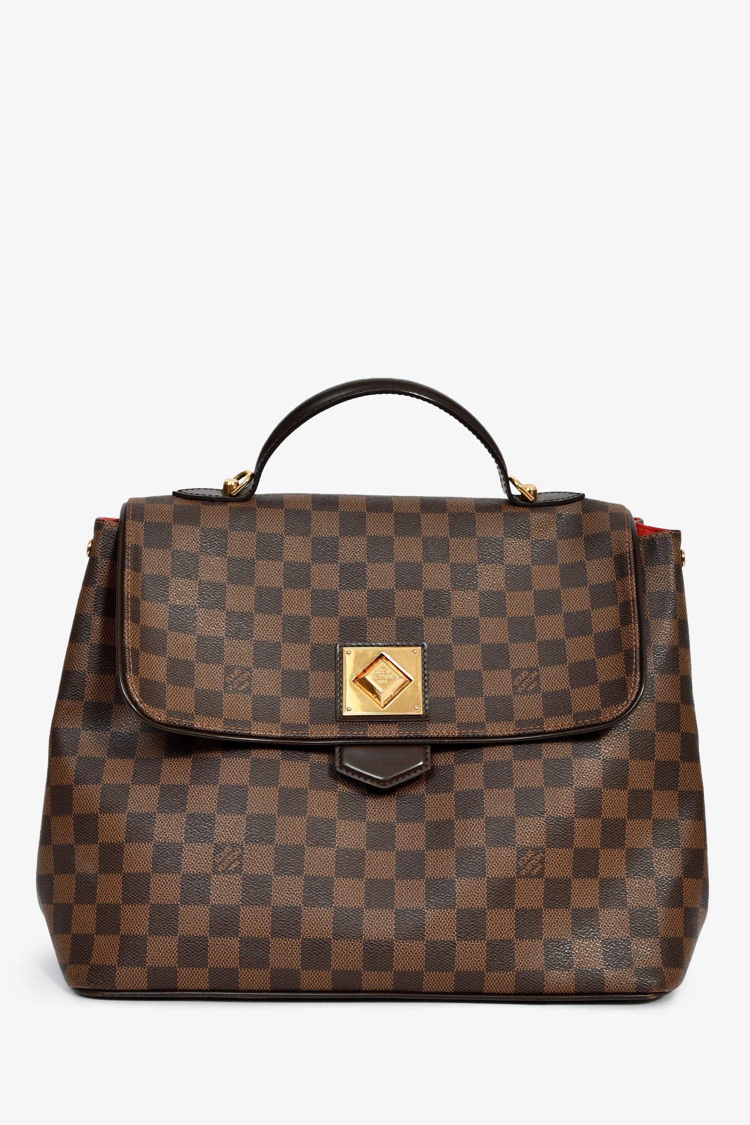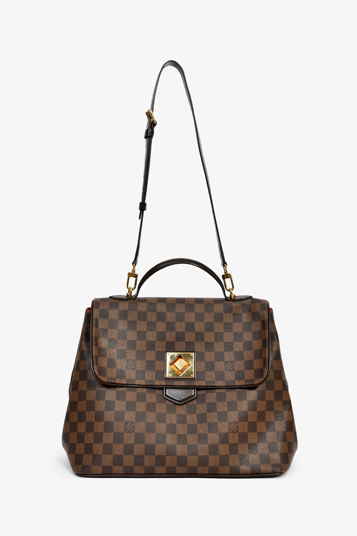 Refresh availabilityLouis Vuitton 2011 Brown Canvas Damier Ebene GM Bergamo Tote. Front fold-over flap with turn-lock closure. Top handle. Detachable and adjustable strap. Suede-lined interior. 3 interior wall pockets; 2 slip, 1 with zip closure. Gold-tone hardware. Tonal stitching.