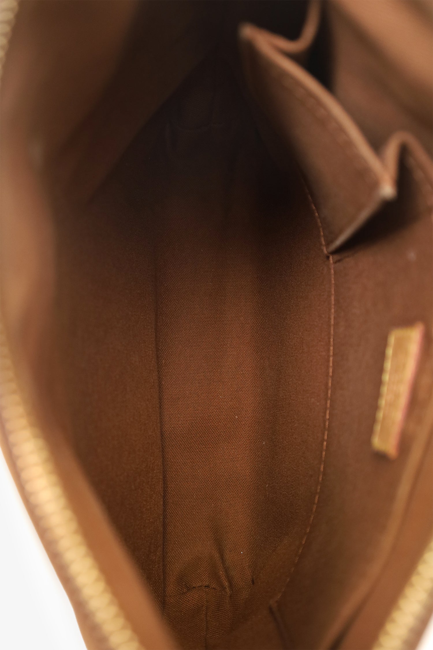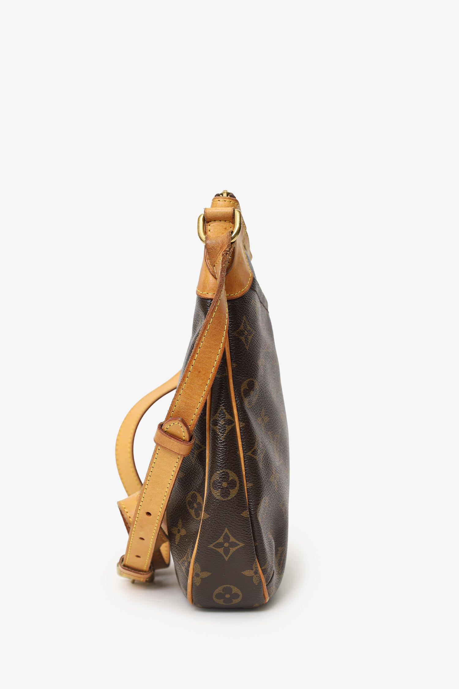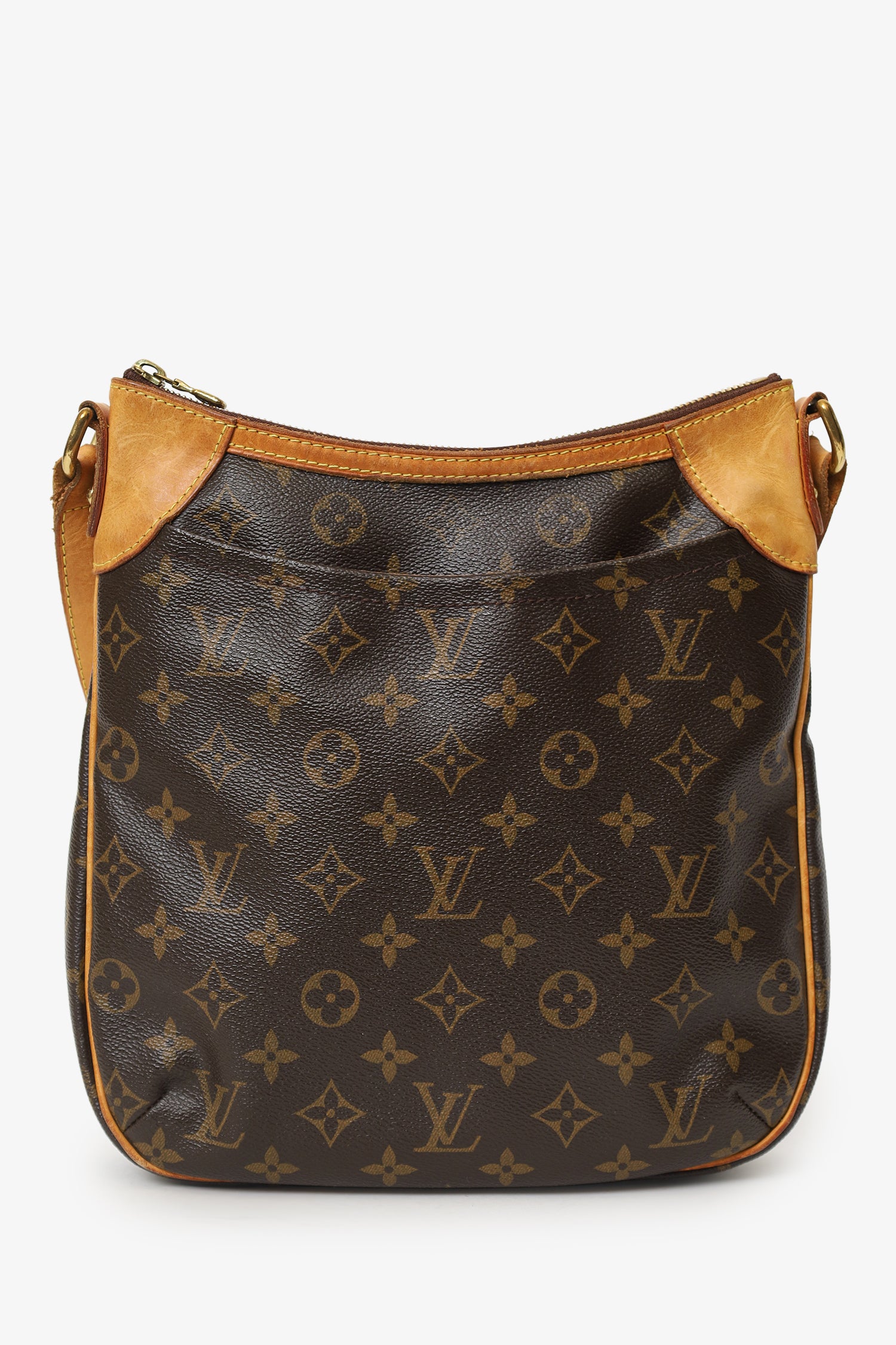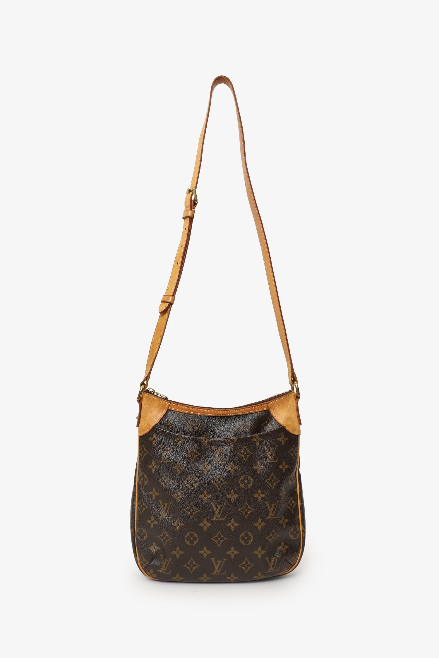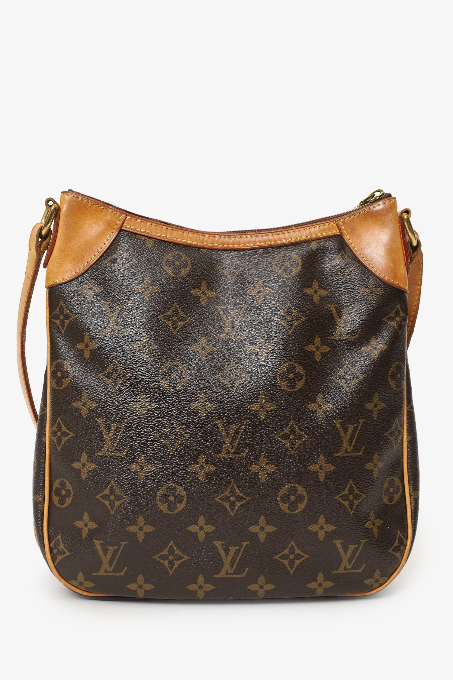 Refresh availabilityLouis Vuitton 2011 Brown Monogram Odeon Crossbody Bag. Top zip closure. Adjustable pull through crossbody strap. Front exterior slip pocket. Fabric lined interior. 3 interior compartments; front compartment with 1 large open pocket. 2 interior wall slip pockets. Gold-tone hardware. Tonal stitching.