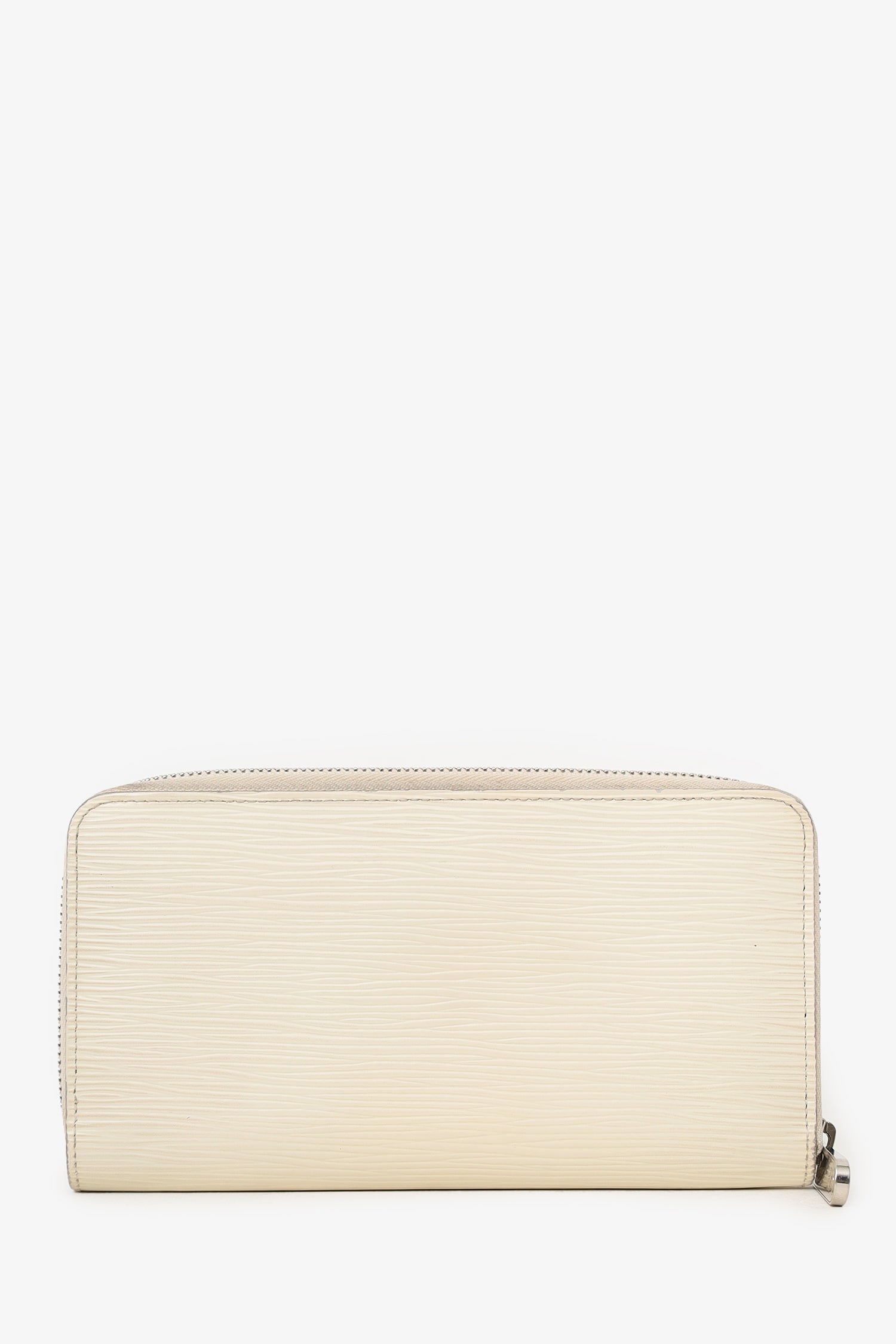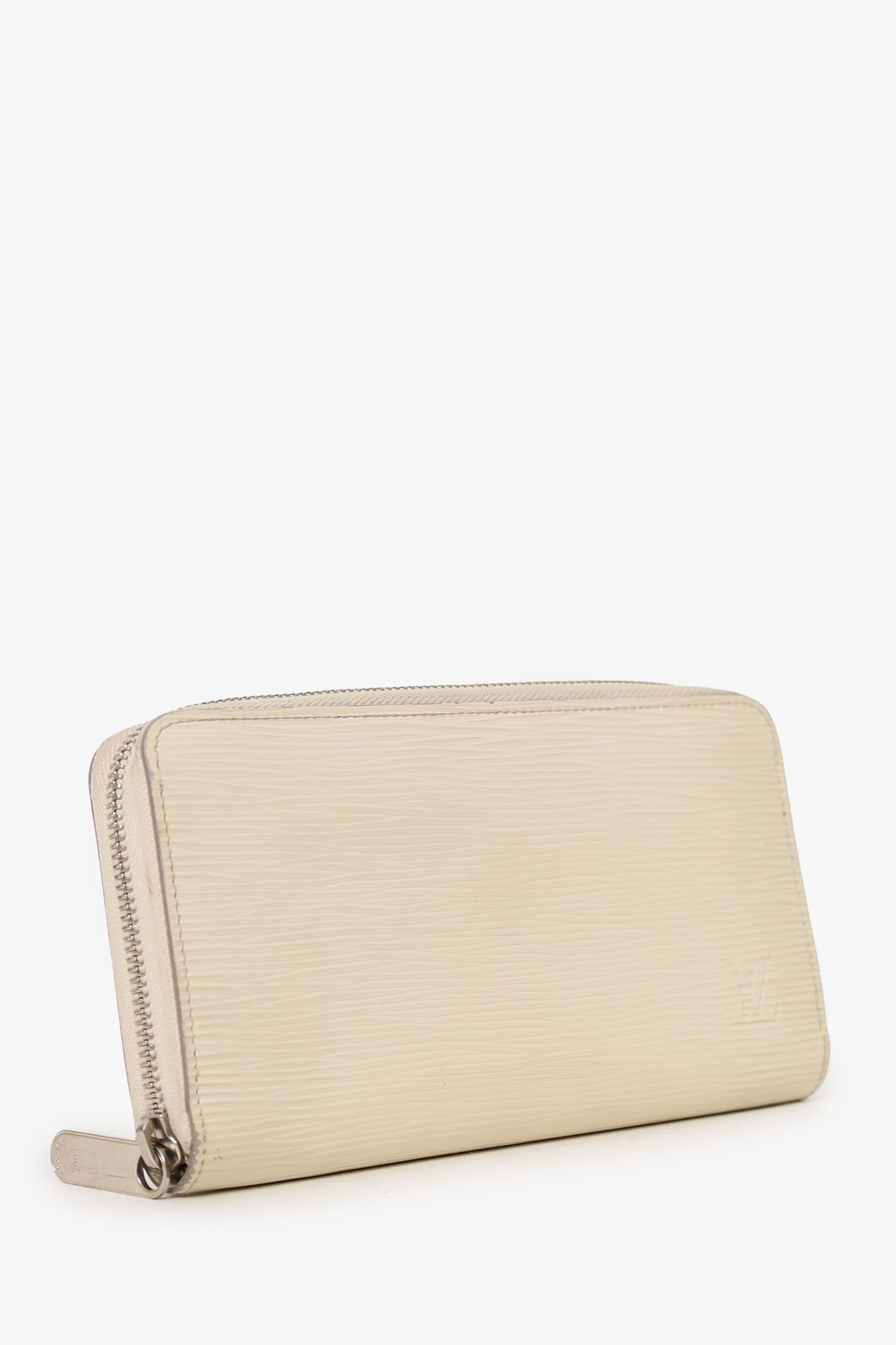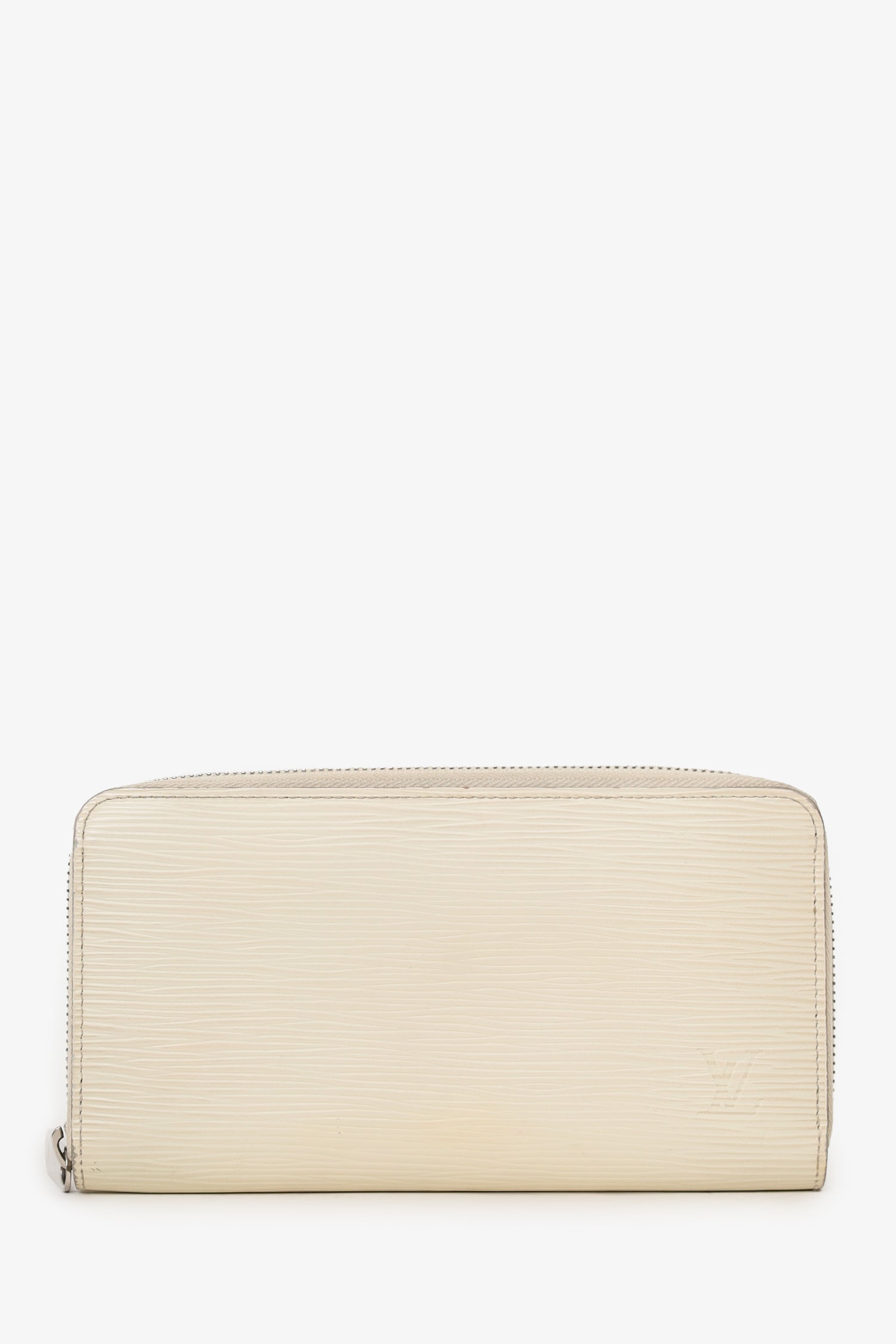 Refresh availabilityLouis Vuitton 2012 Cream Epi Leather Zippy Wallet. Top 3/4 zip closure. Lined interior. 4 main interior compartments, 3 slip and 1 zip. 1 bill slot and 4 card slots on each interior wall. Silver-tone hardware. Tonal stitching.
