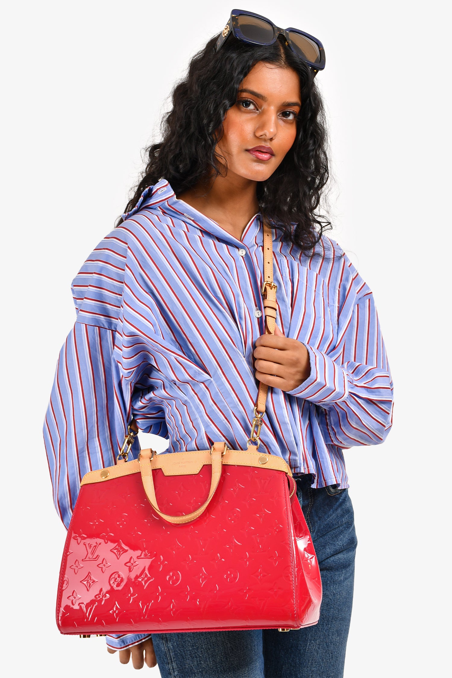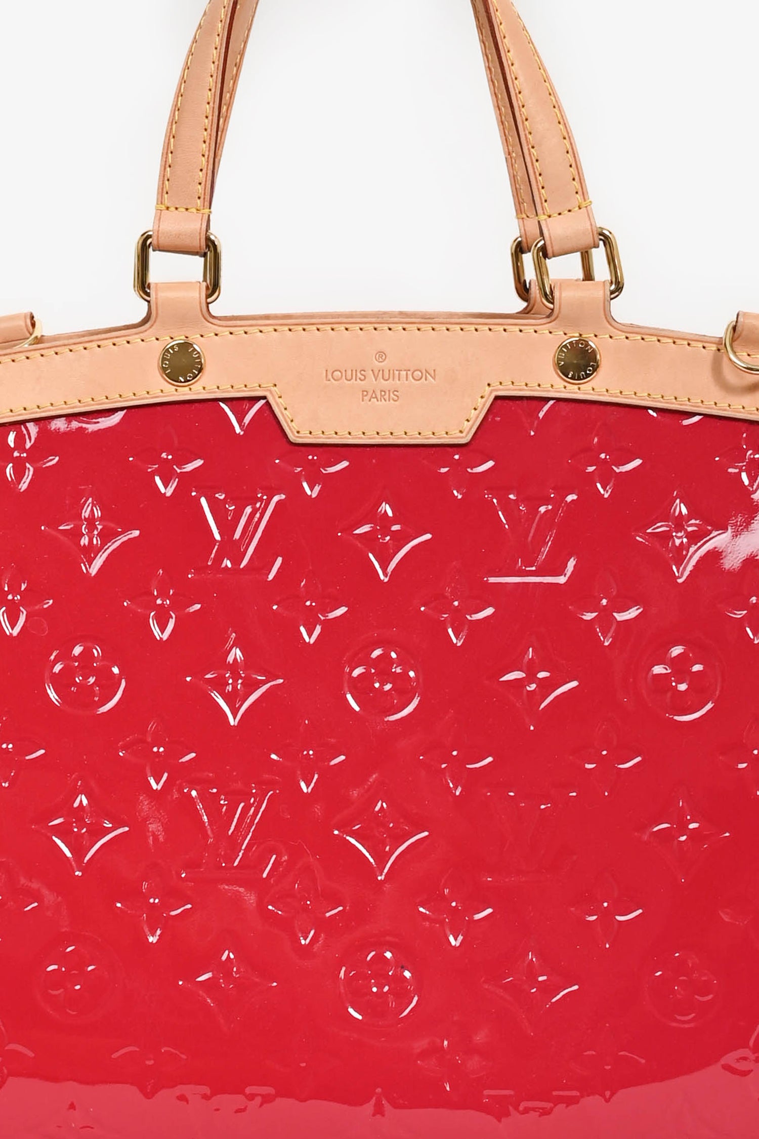 Louis Vuitton 2012 Magenta Vernis Monogram Brea MM Top Handle with Strap. Top zip closure. Single compartment with a wall zip pocket and two wall slip pockets. Adjustable and detachable studs. Bottom protective studs. Tonal textile lining. Gold-tone hardware. Tonal stitching.