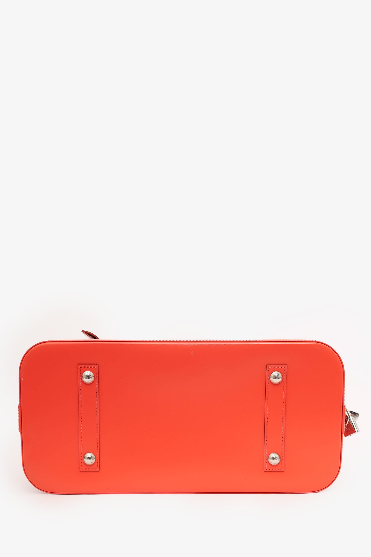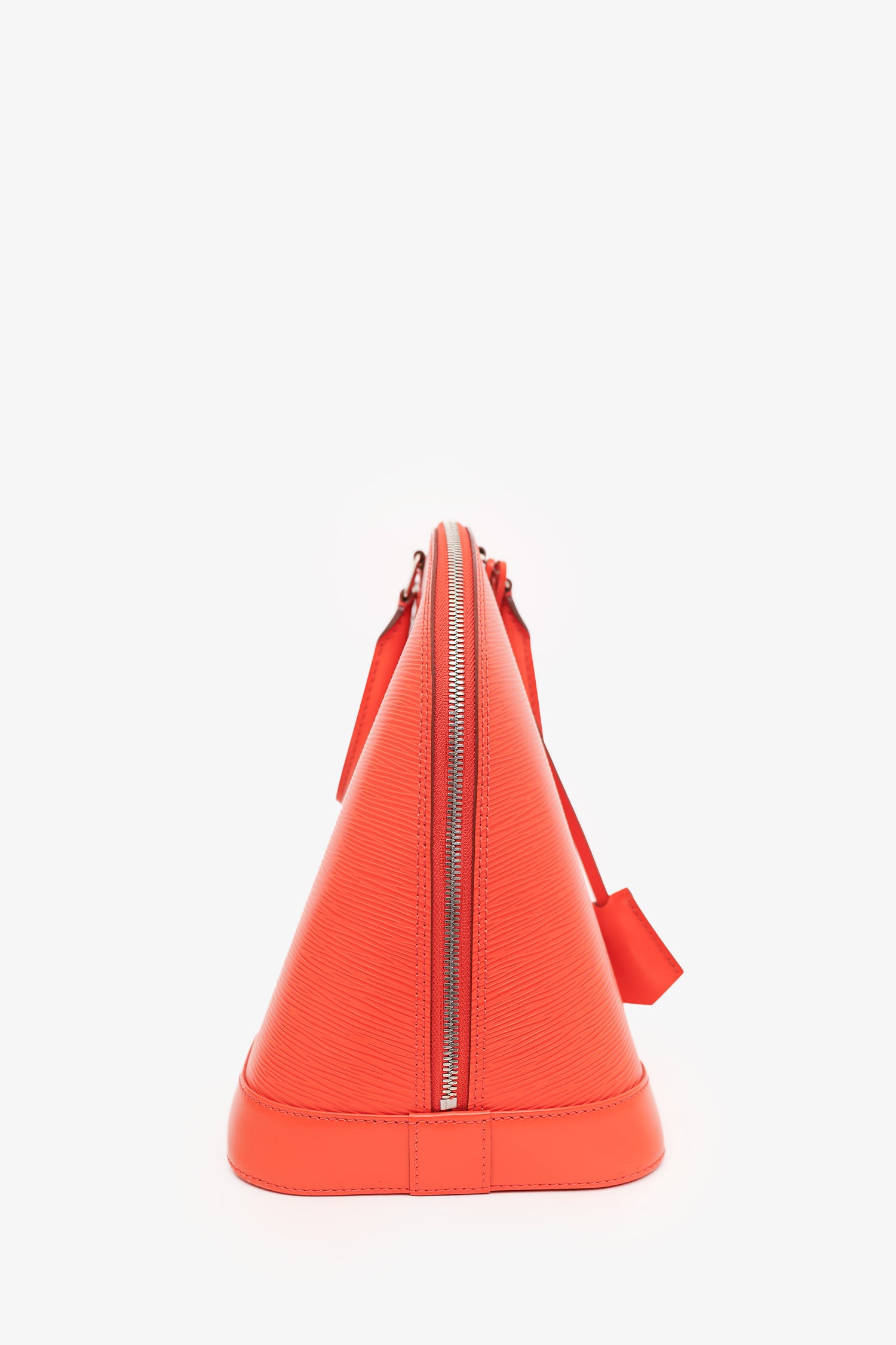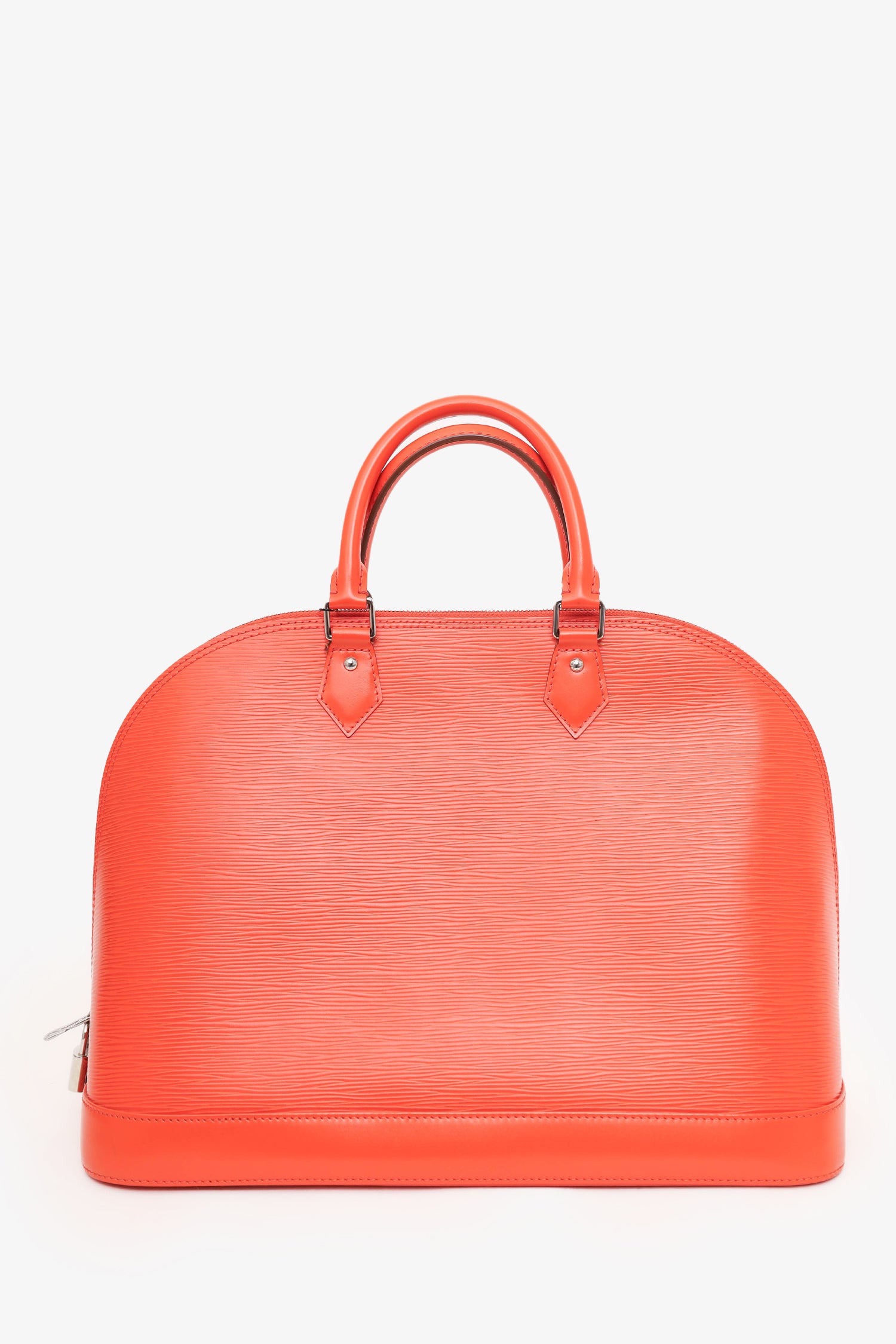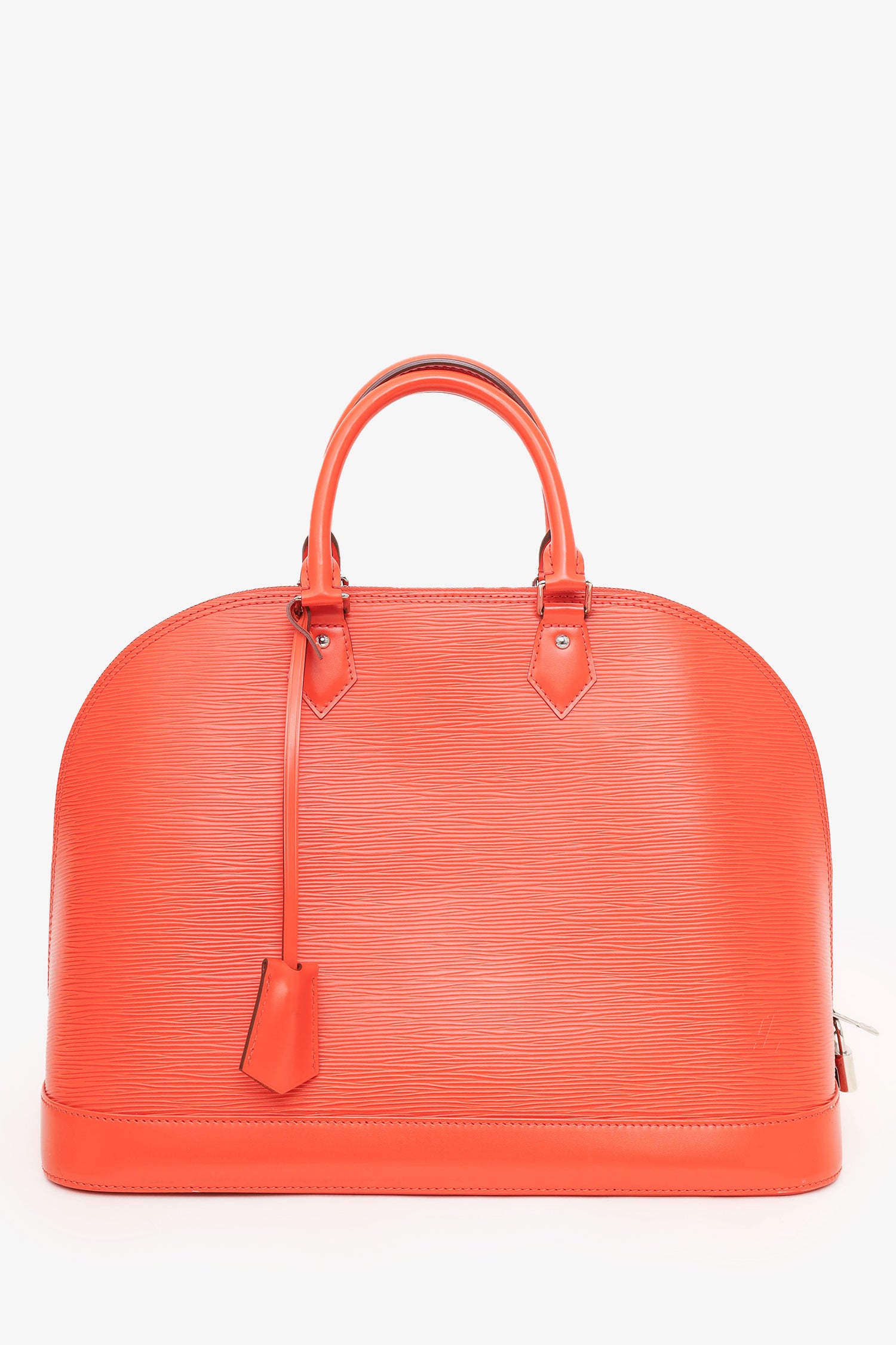 Refresh availabilityLouis Vuitton 2012 Orange Epi Leather Alma PM. Top zip closure with lock. Top dual handles. Removable clochette with keys on handle. Open suede interior with 2 wall slip pockets. Protective studs on bottom. Silver-tone hardware. Tonal stitching.