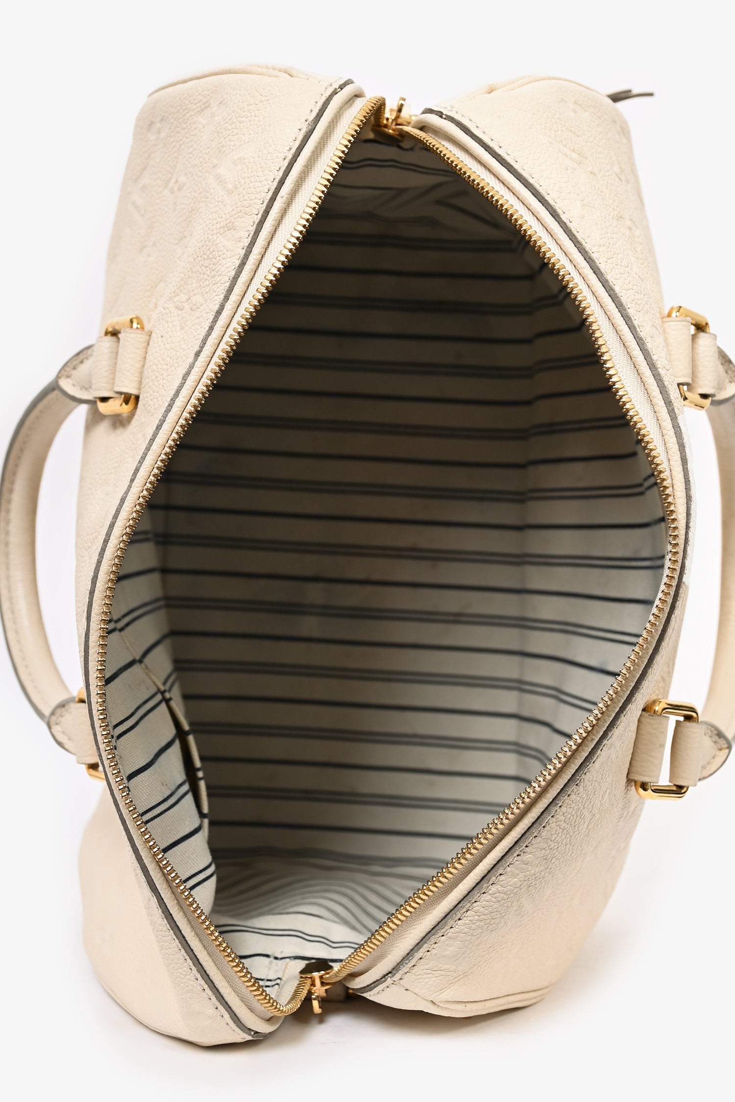 Louis Vuitton 2013 Cream Empreinte Leather Speedy 30 Crossbody. Dual rolled handles. Top two-way zip closure. Striped textile interior lining. 3 interior wall pockets; 2 slip and 1 with zip closure. Removable and adjustable strap. Detachable clochette. Protective metal bottom. Gold-tone hardware. Tonal stitching. Comes with signature LV lock and 2 keys.