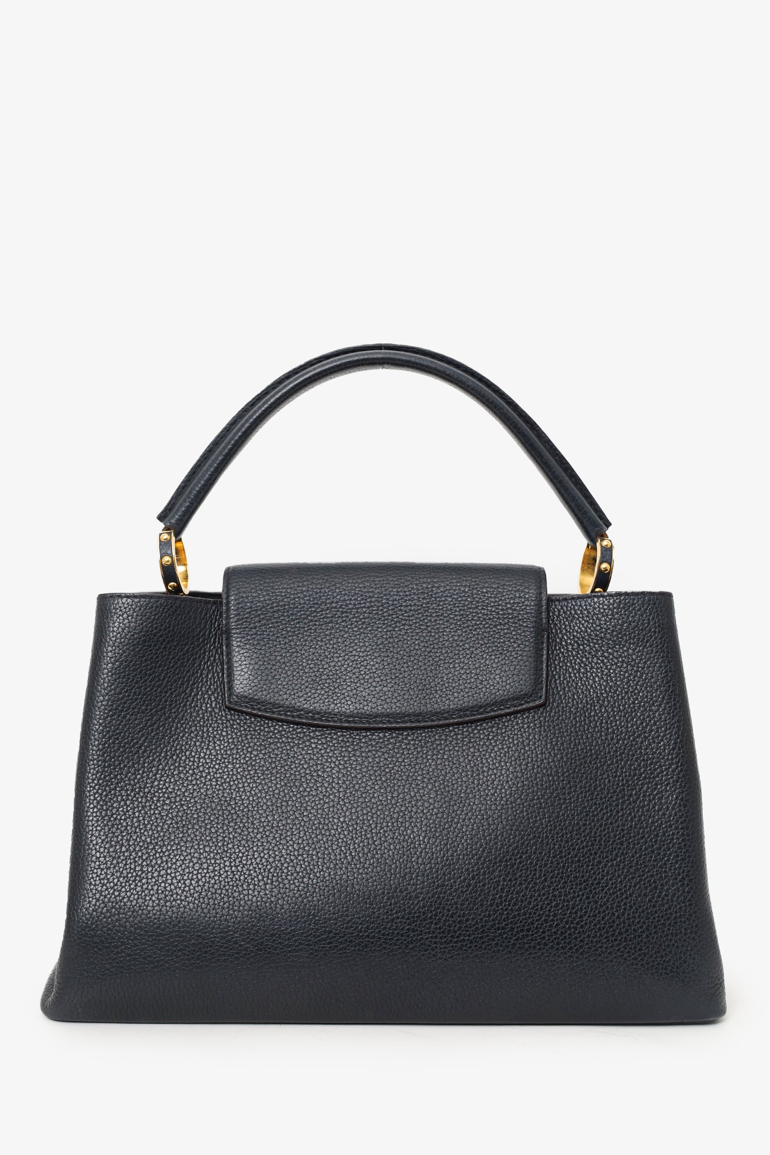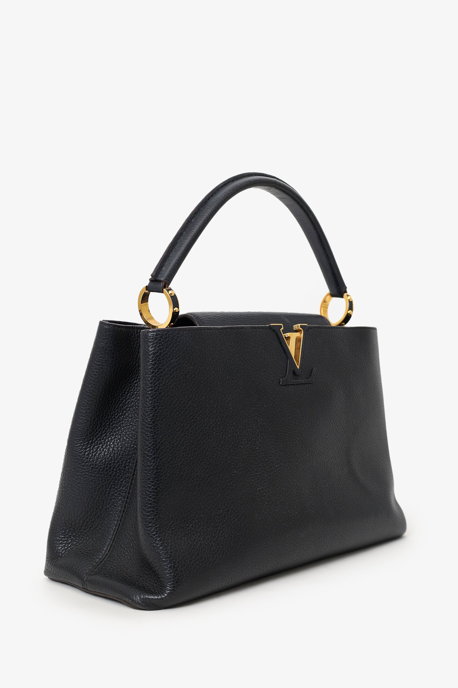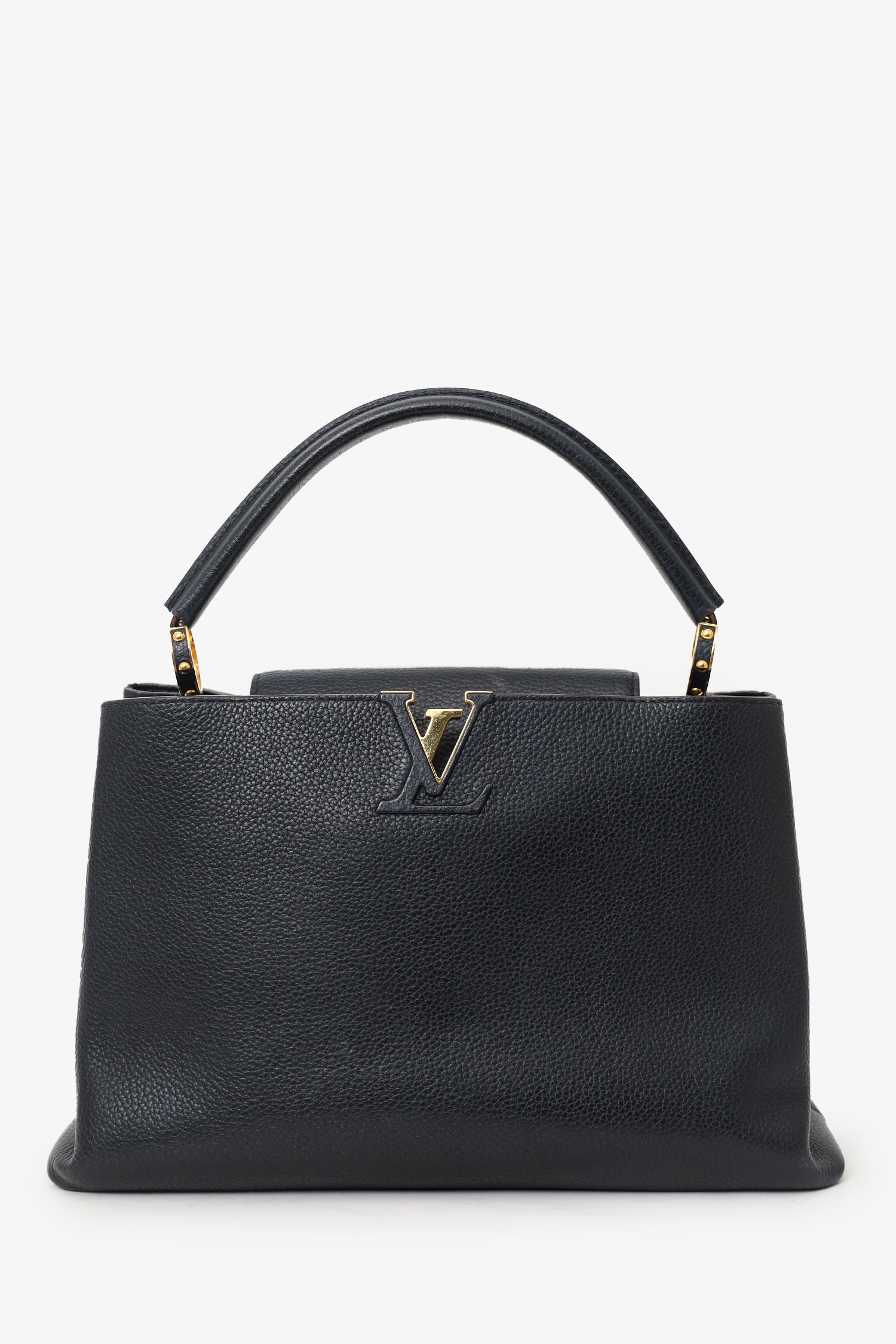Refresh availabilityLouis Vuitton 2014 Black Taurillon Leather Capucines MM. Top interior fold-over flap with clasp closure. Top handle. Protective base studs. 3 interior compartments; front slip, middle zip and rear with single slip pocket. Lined interior. Gold-tone hardware. Tonal stitching.