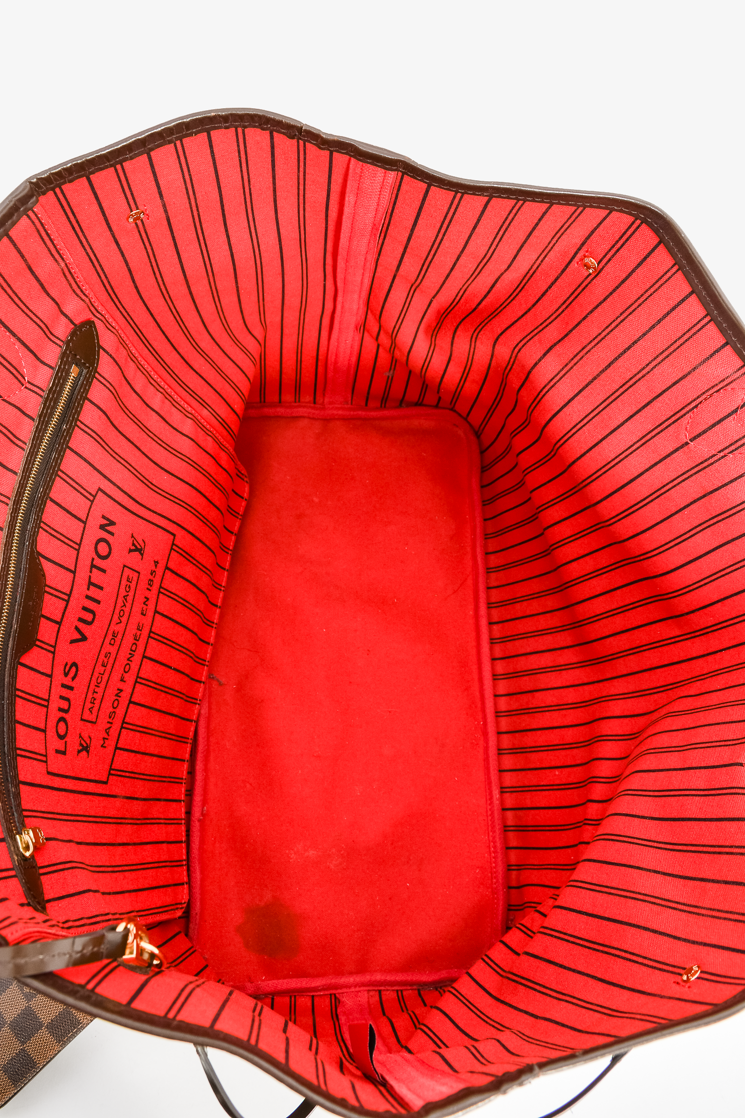 Refresh availabilityLouis Vuitton 2014 Damier Ebene Neverfull Tote with Pouch. Open interior with clasp closure. Interior wall zip pocket. Pouch with zip closure included. Red striped interior lining. Gold-toned hardware. Tonal stitching.