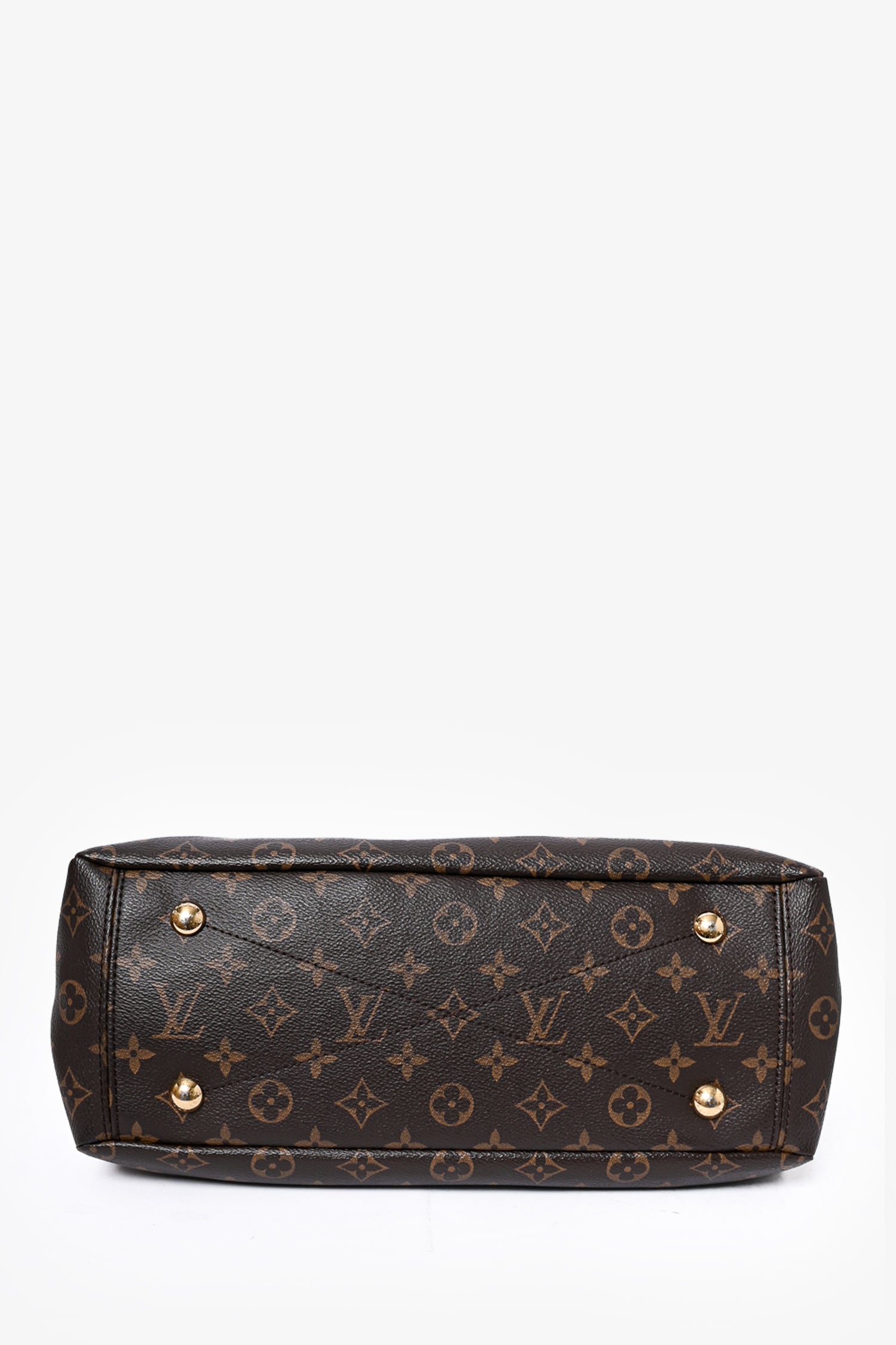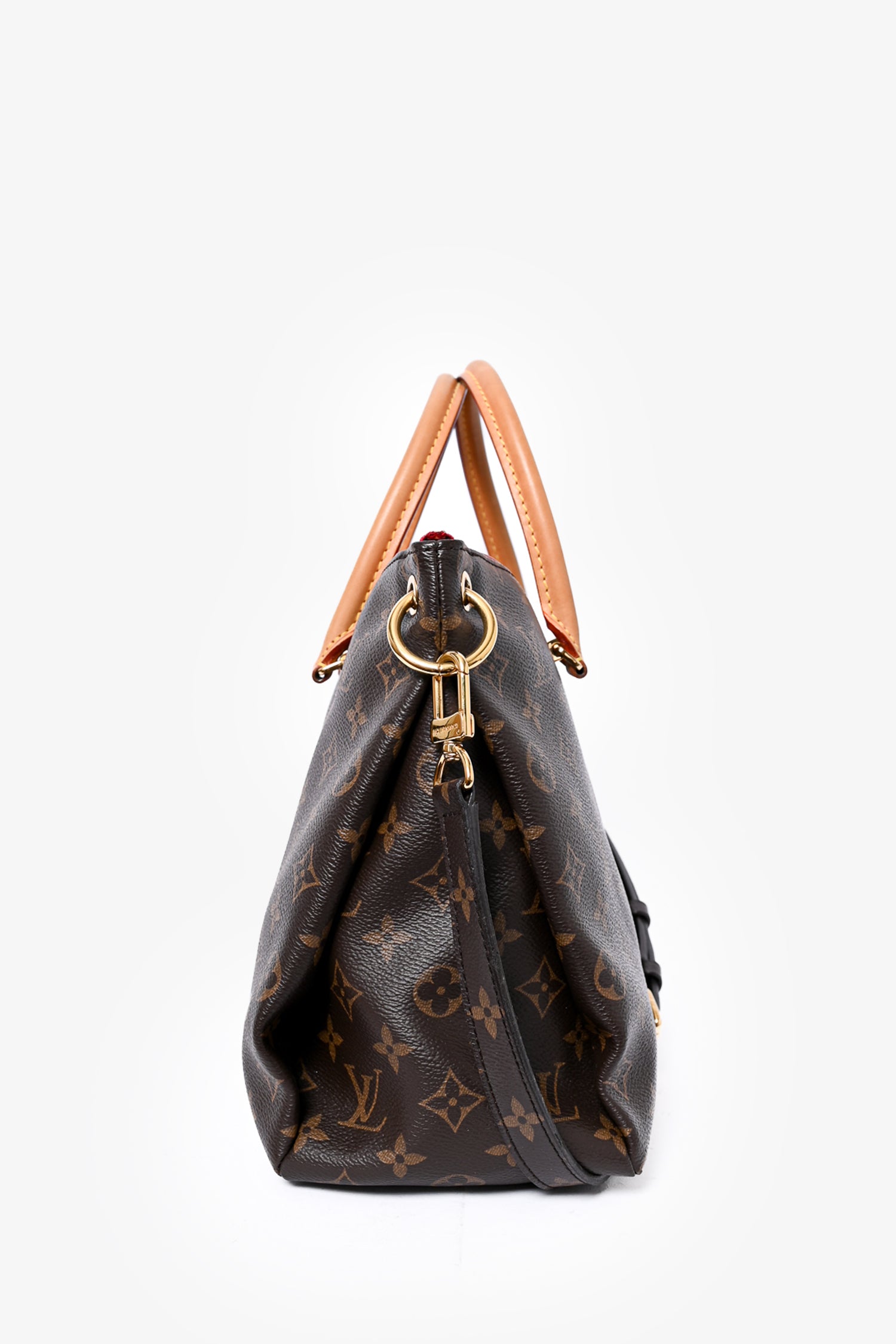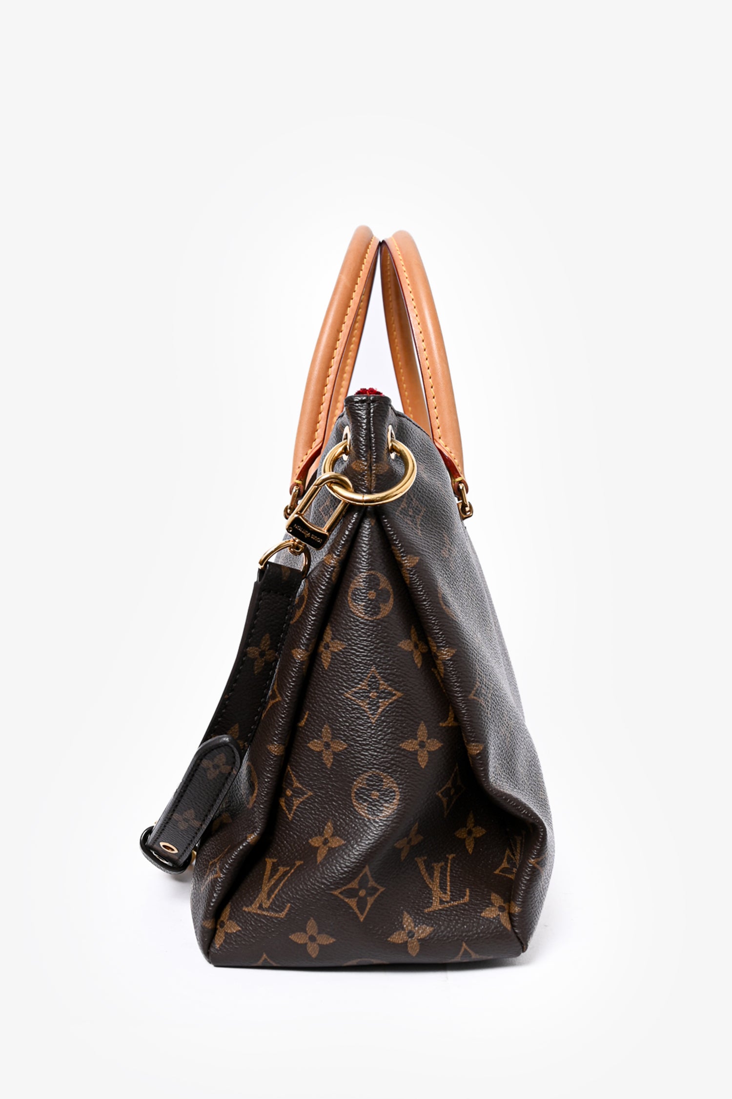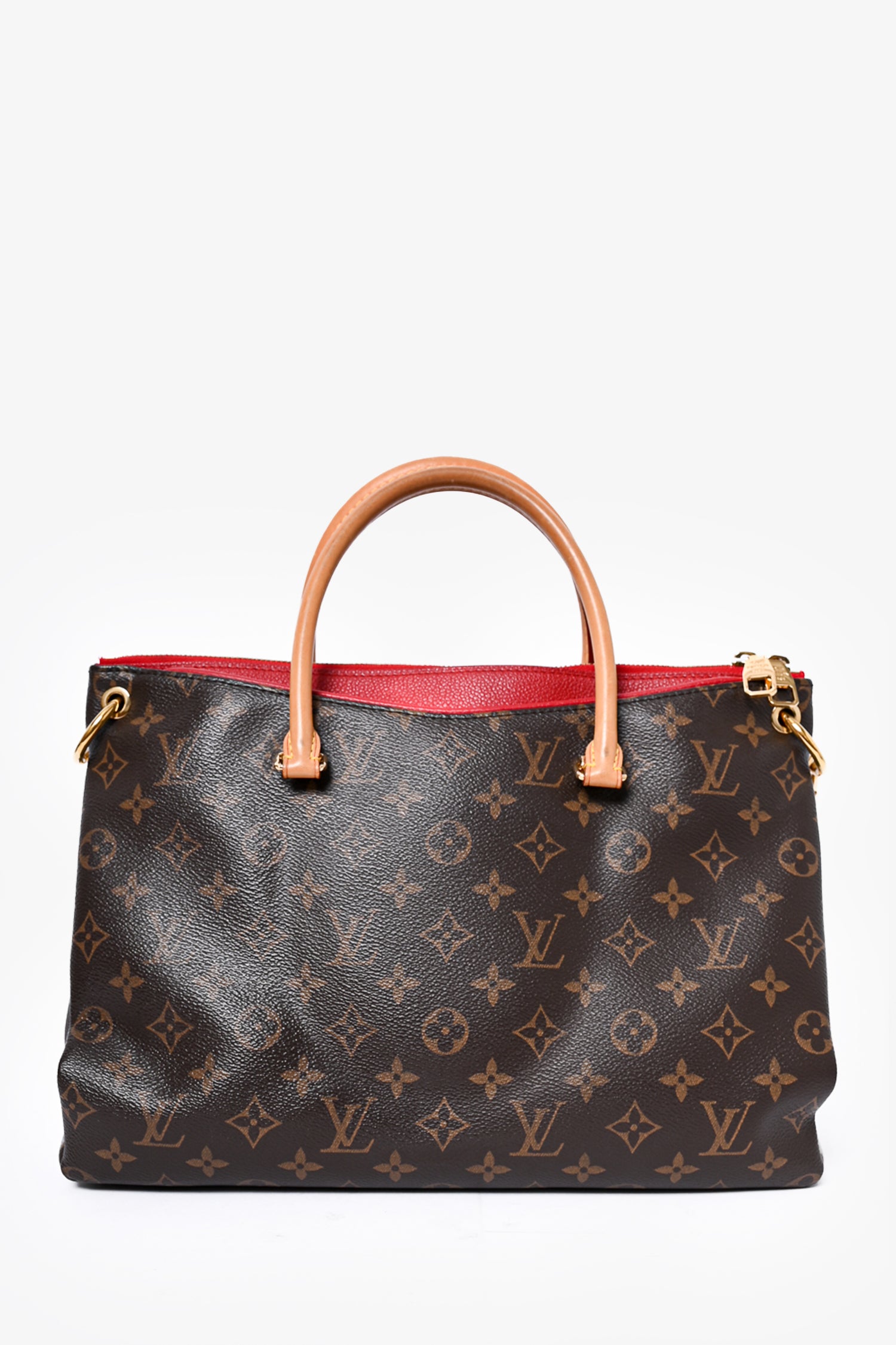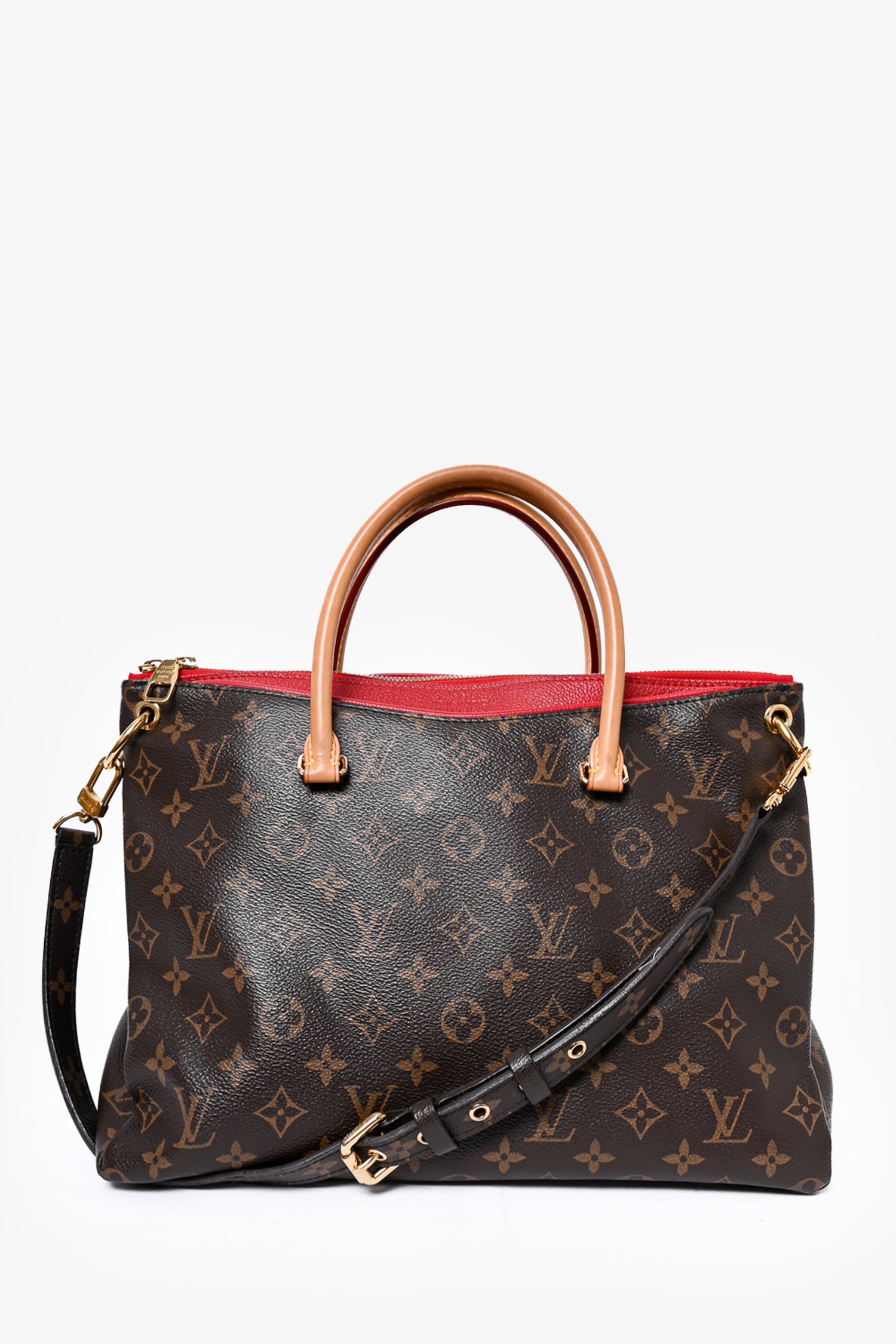 Refresh availabilityLouis Vuitton 2014 Monogram/Red Leather Pallas MM Bag with Strap. Dual rolled handles. Contrast topstitching. Coated monogram canvas. Top zipper. Leather trimming. Suede lined interior with 3 interior pockets. Comes with strap. Dual exterior compartments.