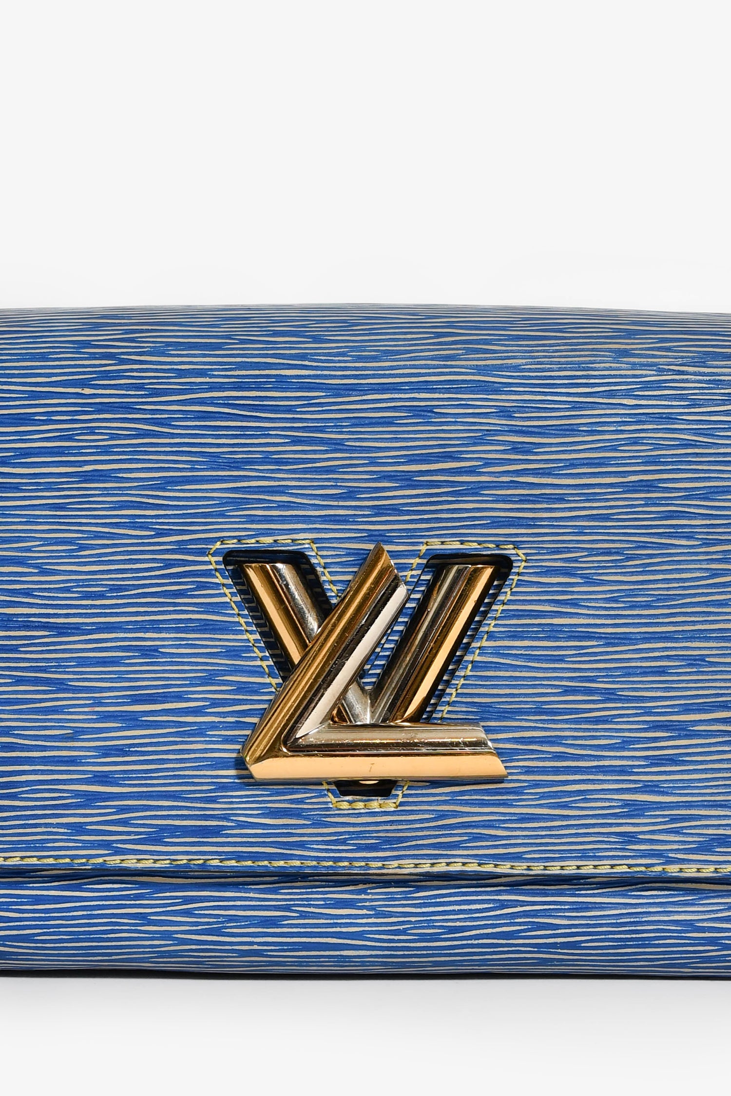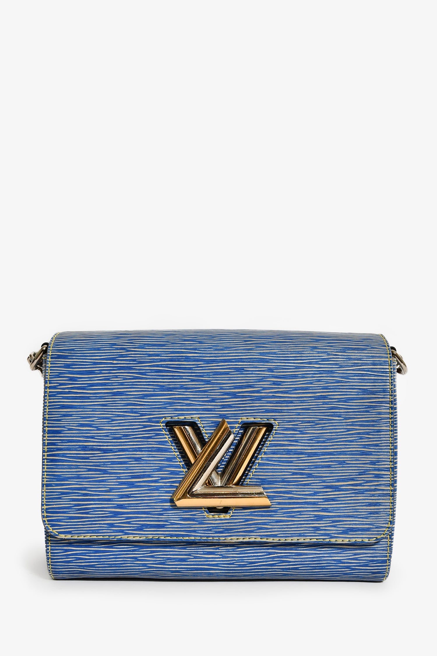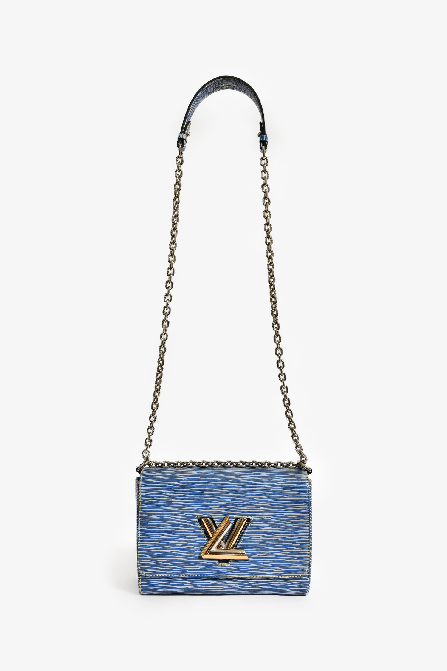 Refresh availabilityLouis Vuitton 2015 Blue Denim Epi Leather 'Twist' MM Shoulder Bag. Front fold-over flap with a twist-lock closure. Chain-link shoulder strap. Lined interior with 2 slip compartments. Gold and silver-tone hardware. Contrast stitching.