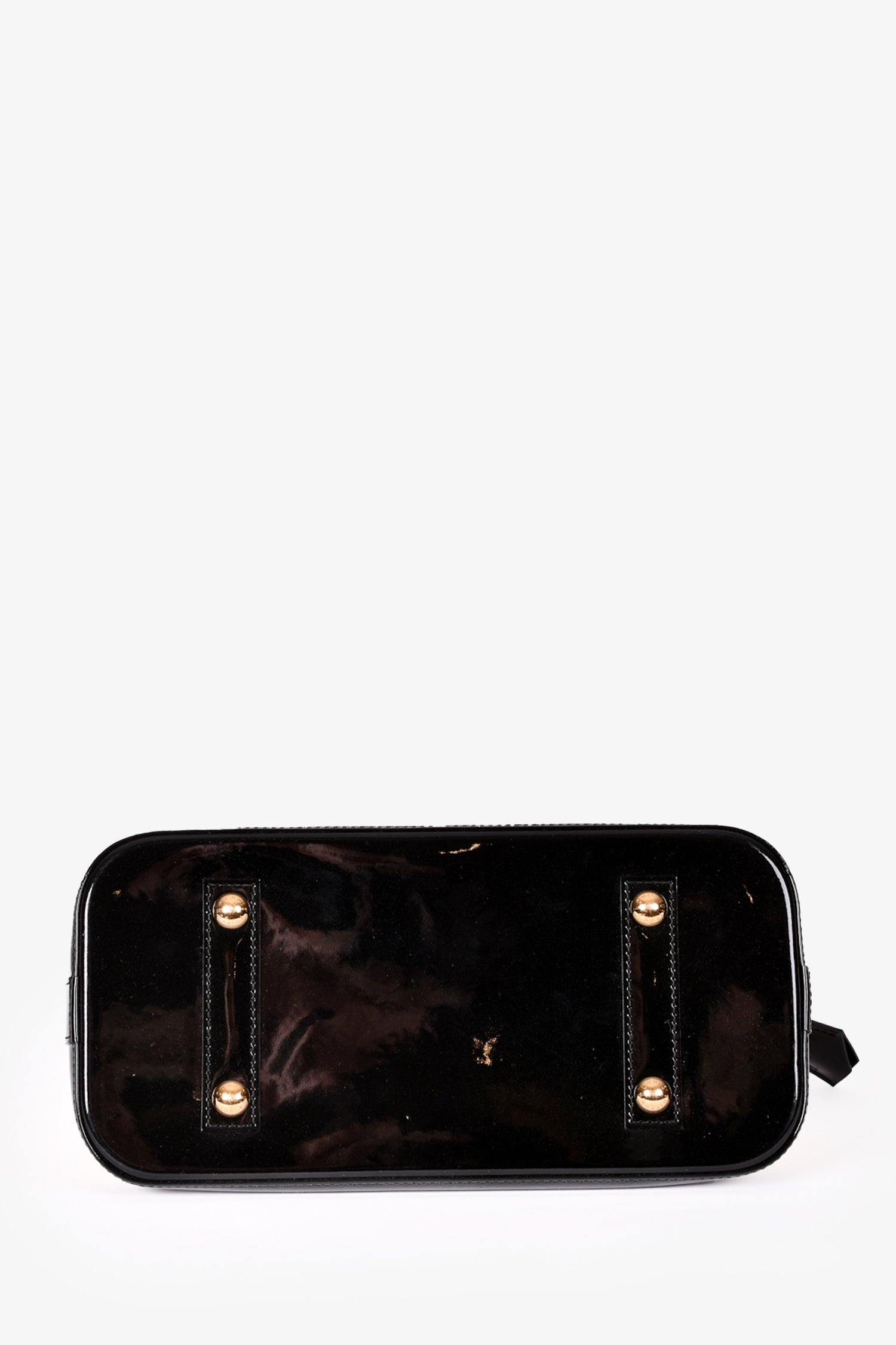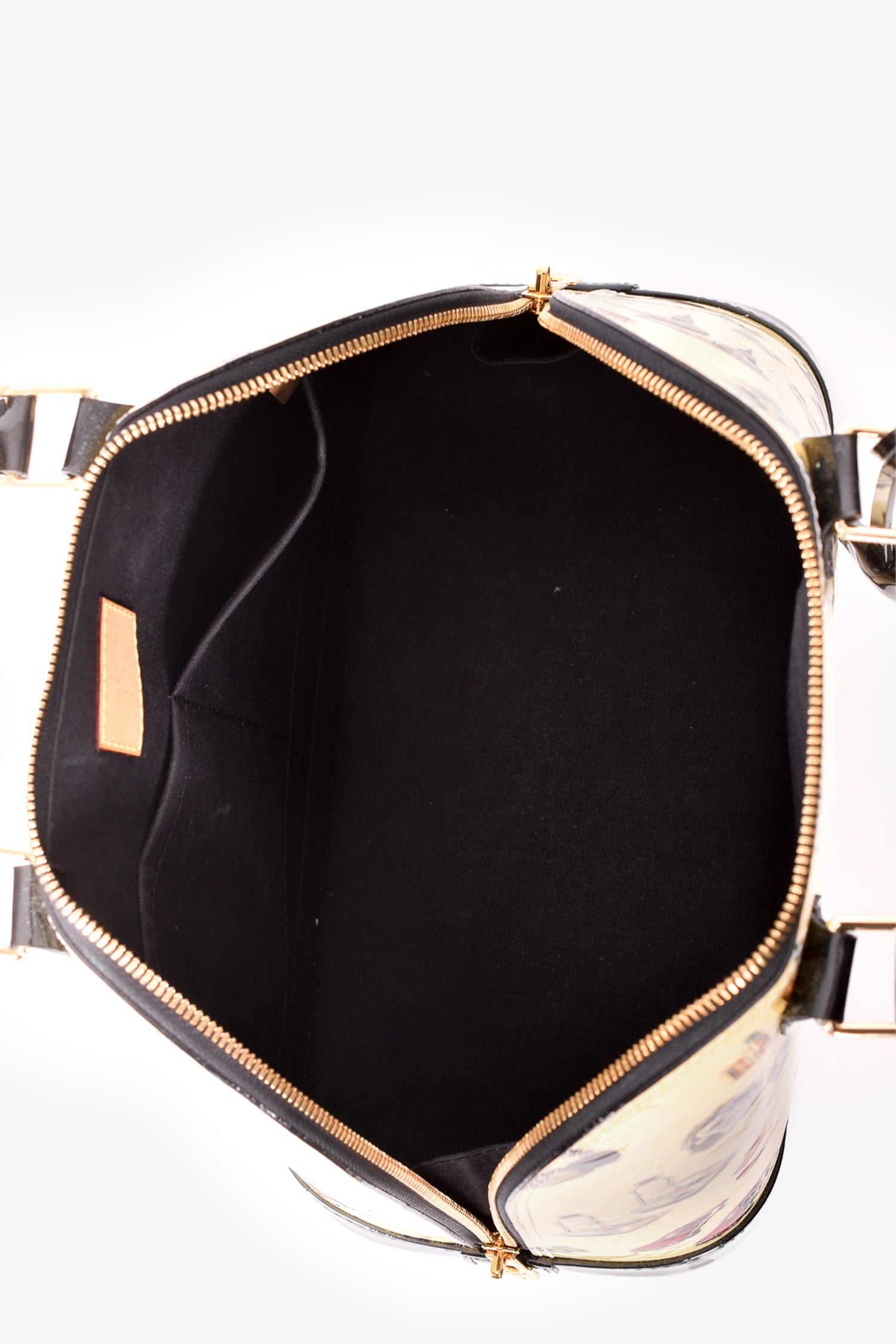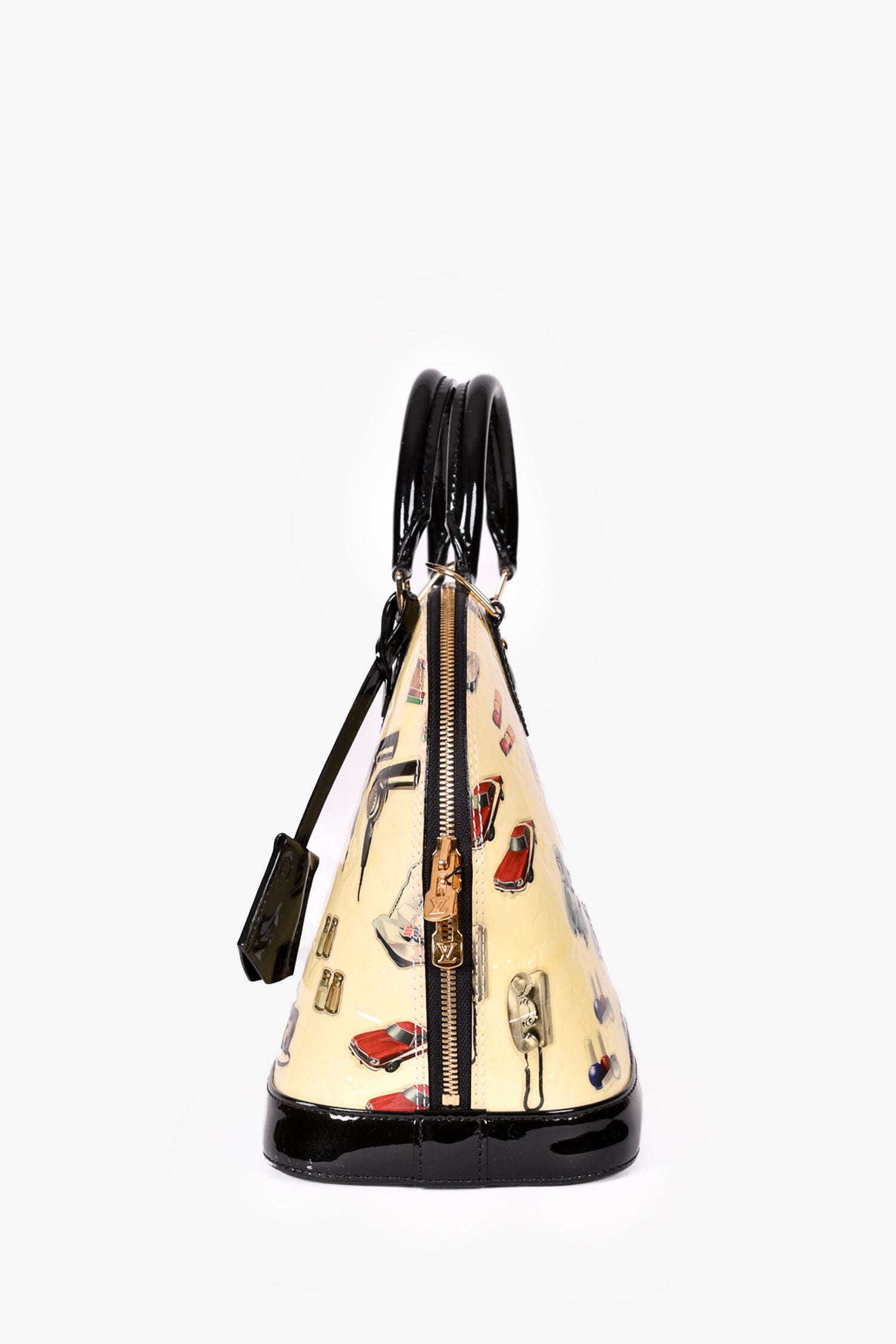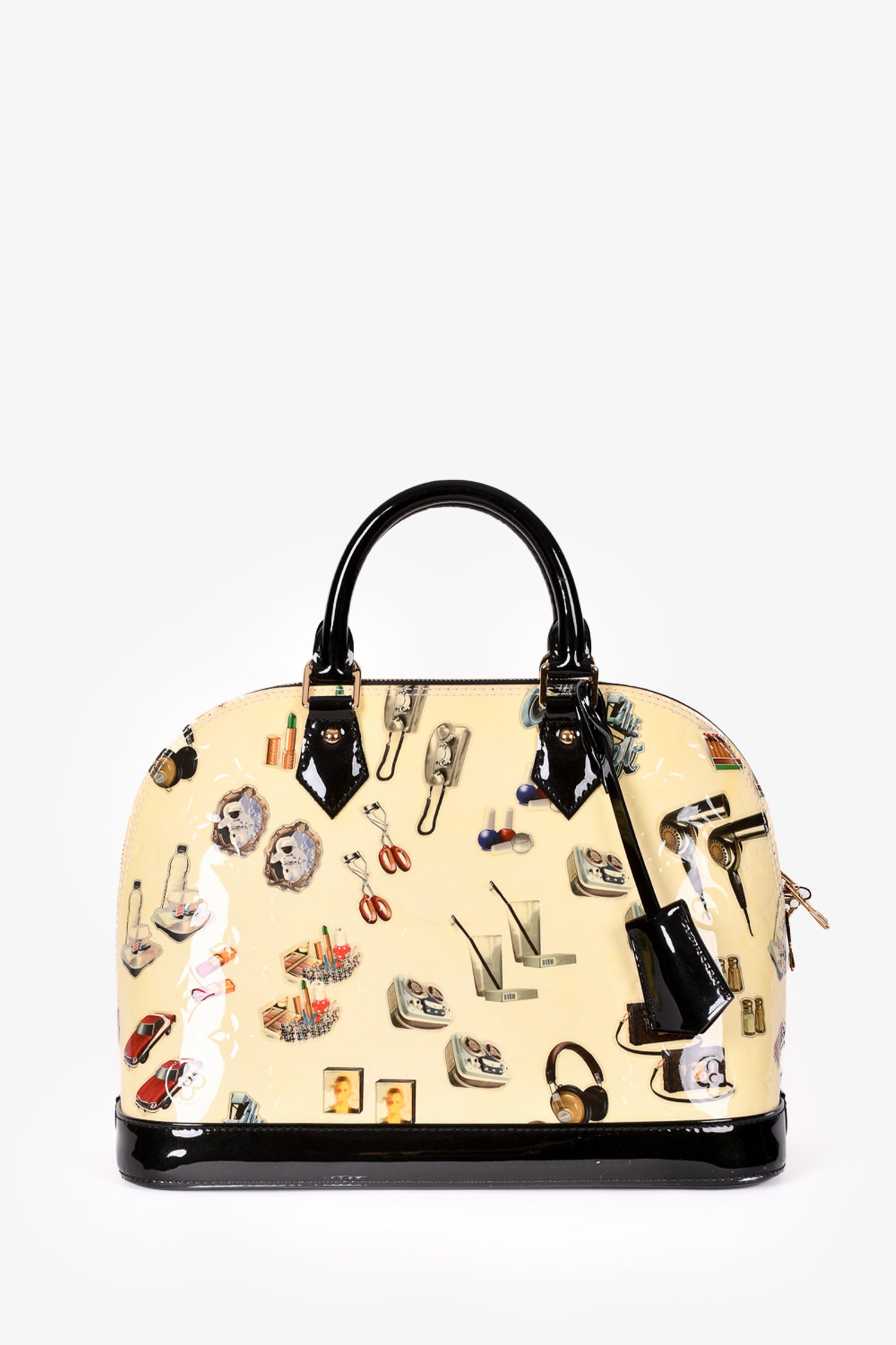 Refresh availabilityLouis Vuitton 2015 Cream Patent Leather Vernis Stickers Alma PM Bag. Dual rolled handles. Top zip closure. Black textile interior lining. 2 interior wall slip pockets. Glossy finish. Protective metal bottom. Removable and adjustable strap. Detachable clochette. Gold-tone hardware. Tonal stitching. No LV lock or keys.