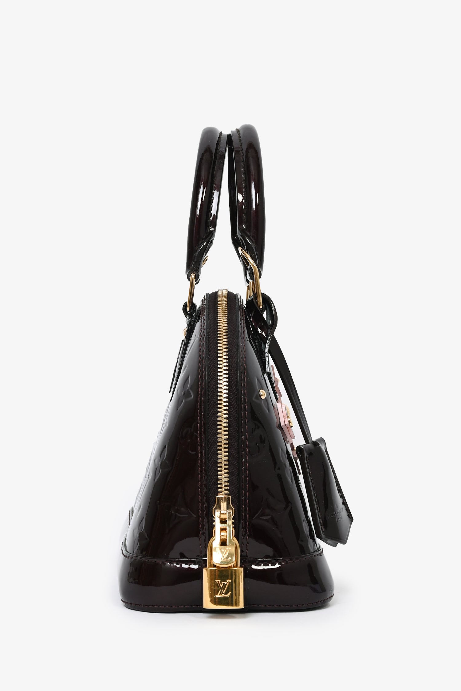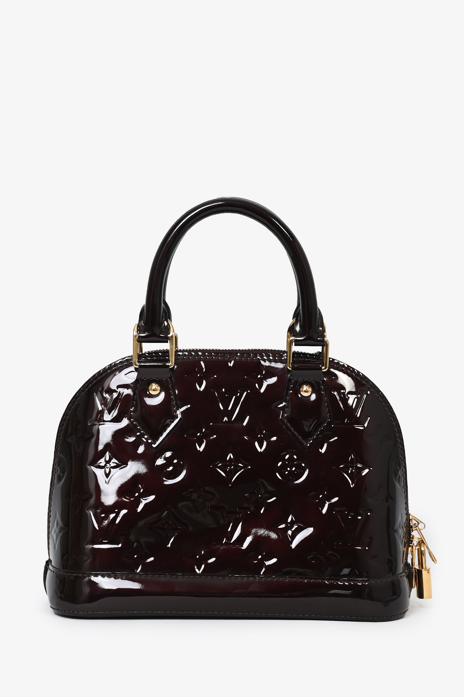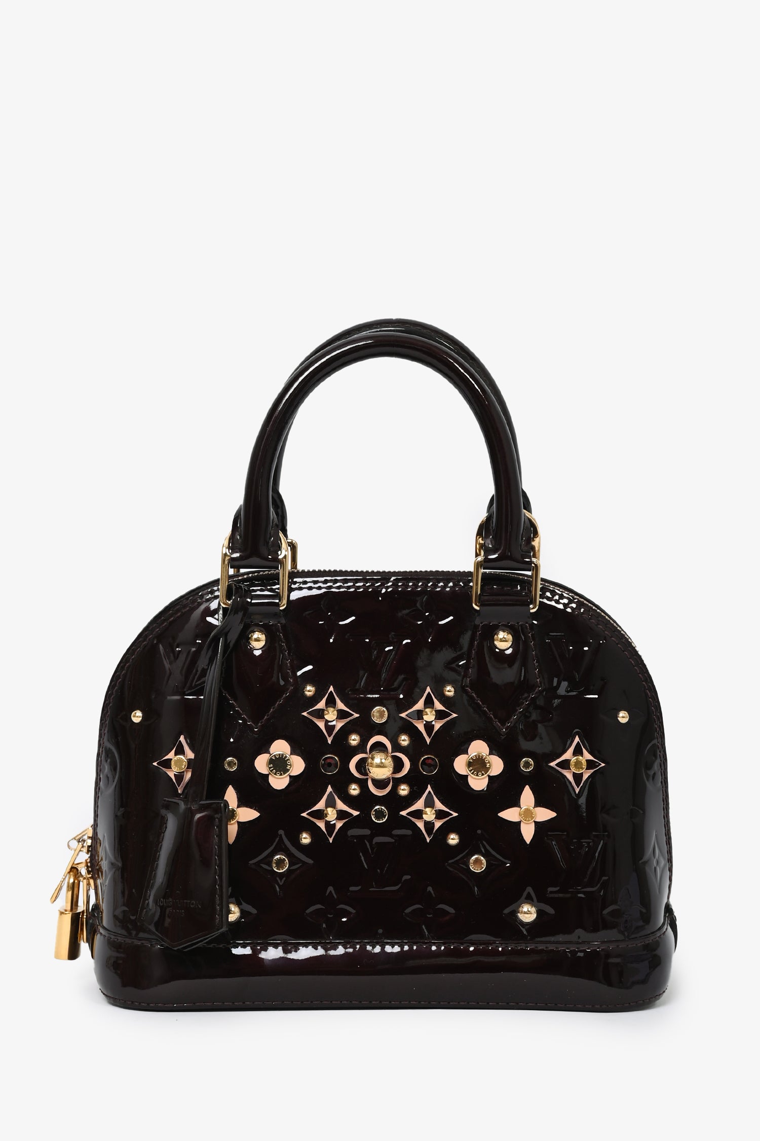 Refresh availabilityLouis Vuitton 2016 Limited Edition Amarante Vernis Flower Embellished Alma BB with Strap. Gold tone hardware. Twin rolled top handles. Top zip closure. Tonal suede interior lining. Single interior slip pocket. Protective bottom feet. Tonal stitching.
