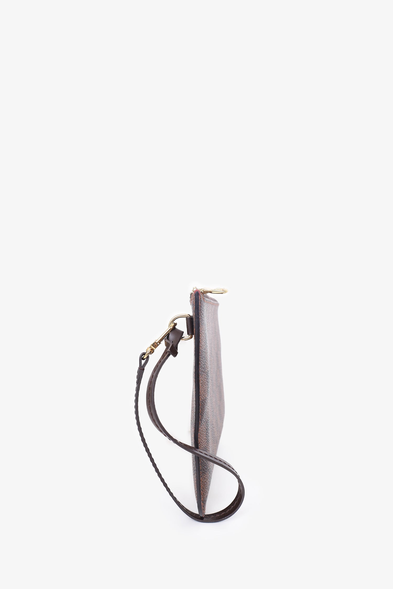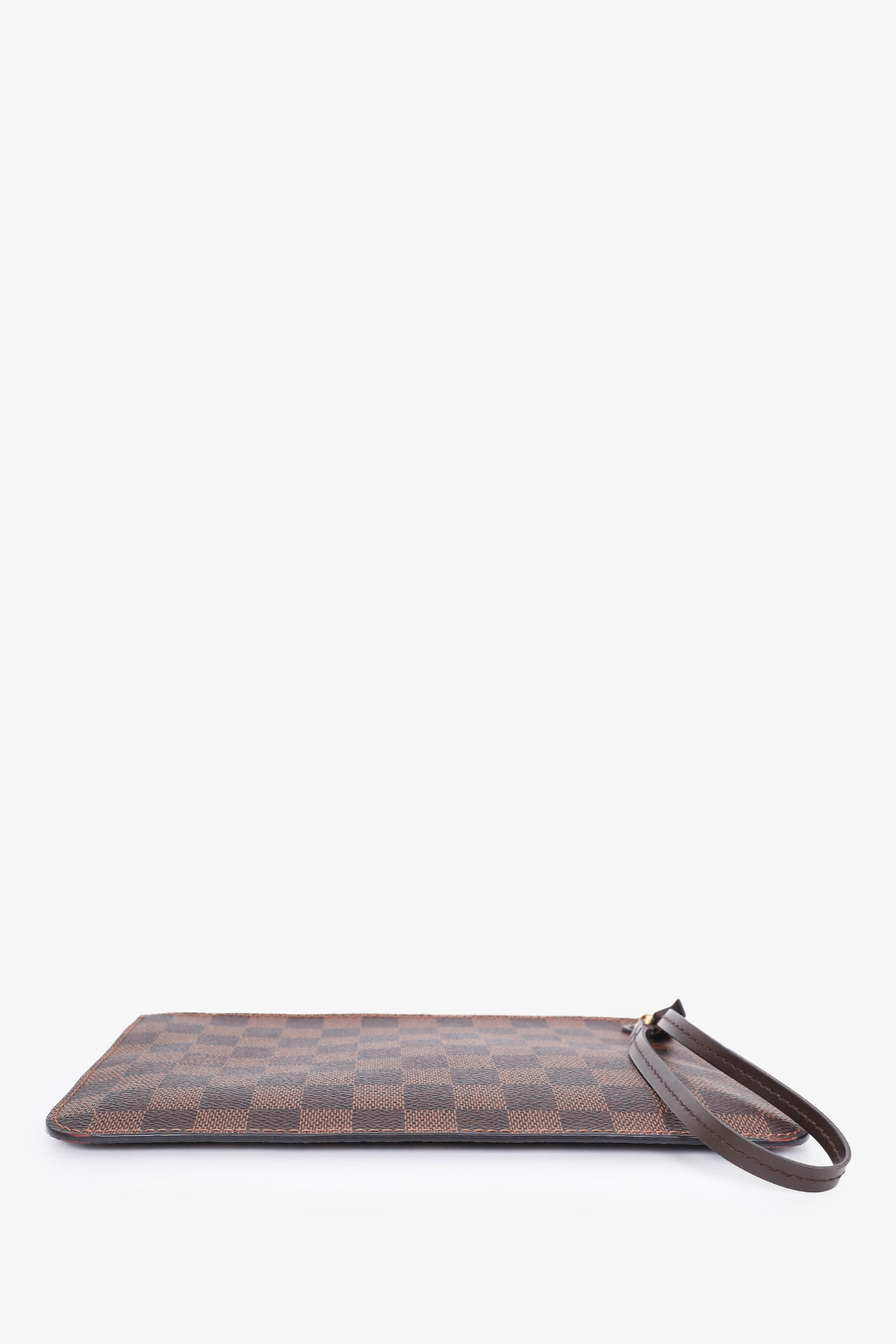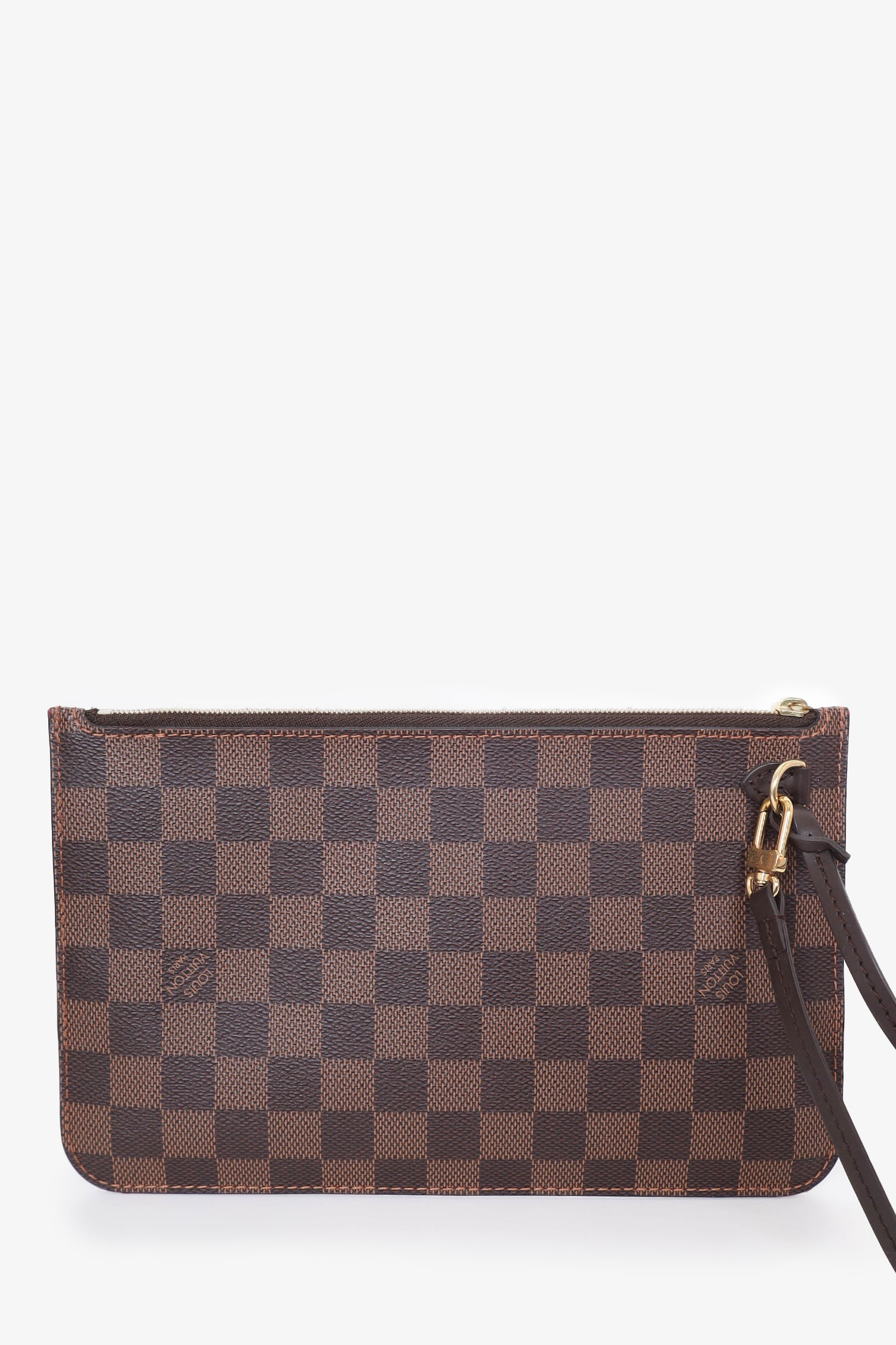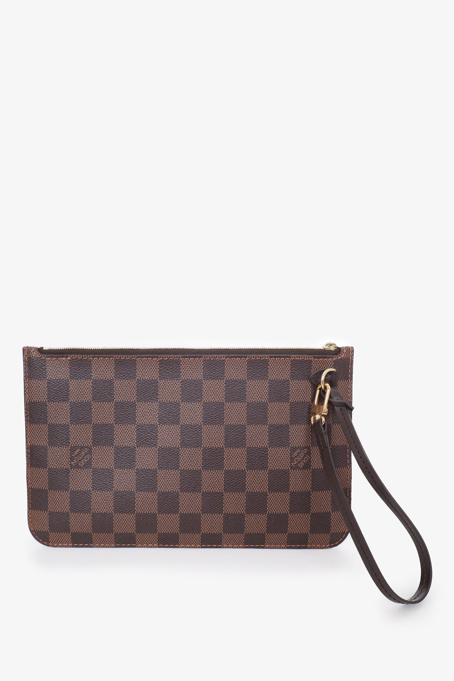 Refresh availabilityLouis Vuitton 2019 Damier Ebene Neverfull Pouch. Zip closure. Interior slip pockets. Wrist closure. Gold tone hardware. Tonal stitching.