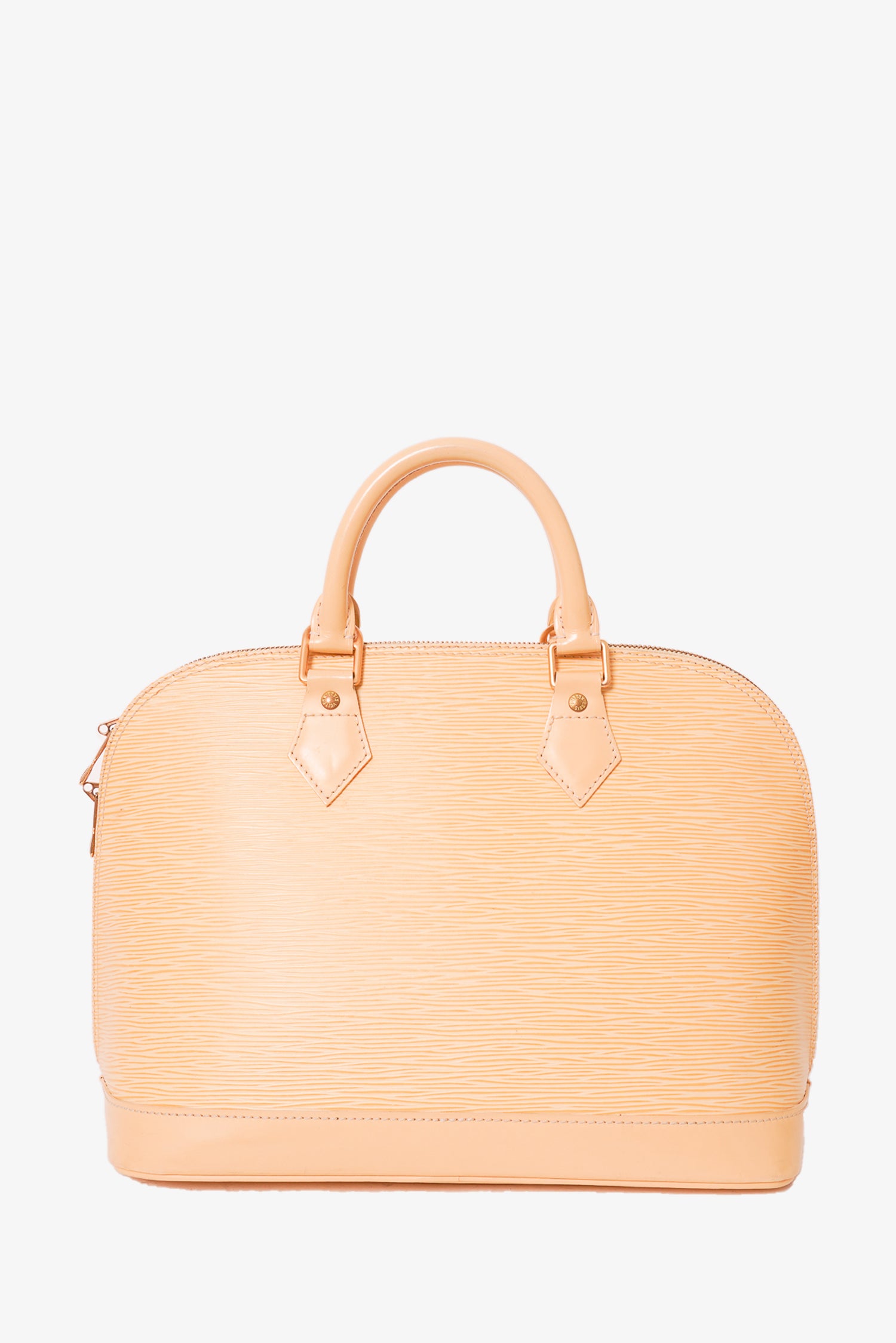Louis Vuitton Yellow Epi PM "Alma" Top Handle. Dual rolled handles. Top two-way zip closure. Tonal textile interior lining. 1 interior wall slip pockets.  Gold-tone hardware. Tonal stitching.