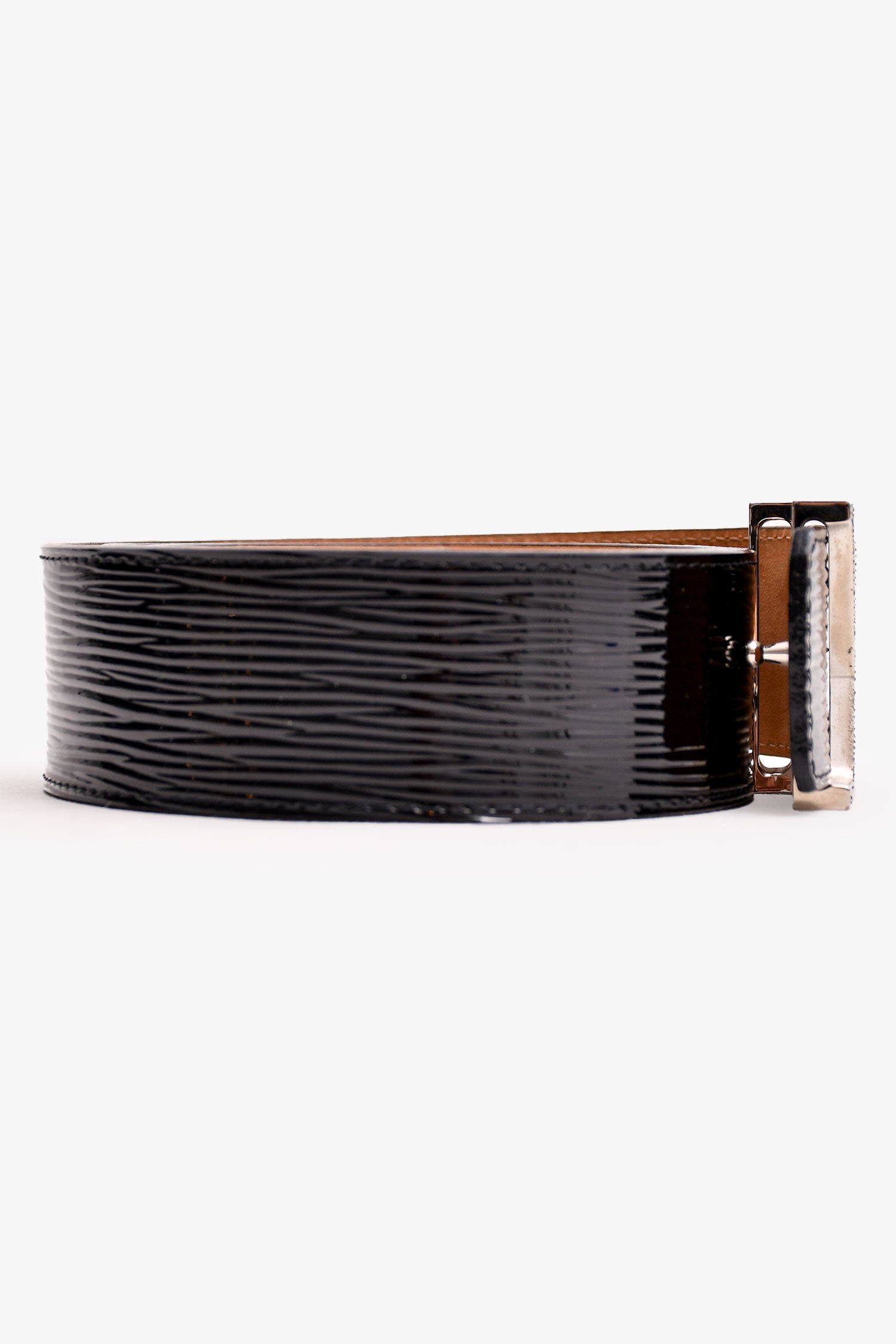 Louis Vuitton Black Electric Epi 40mm Wide LV Belt. Push tab buckle closure. Silver-tone hardware.