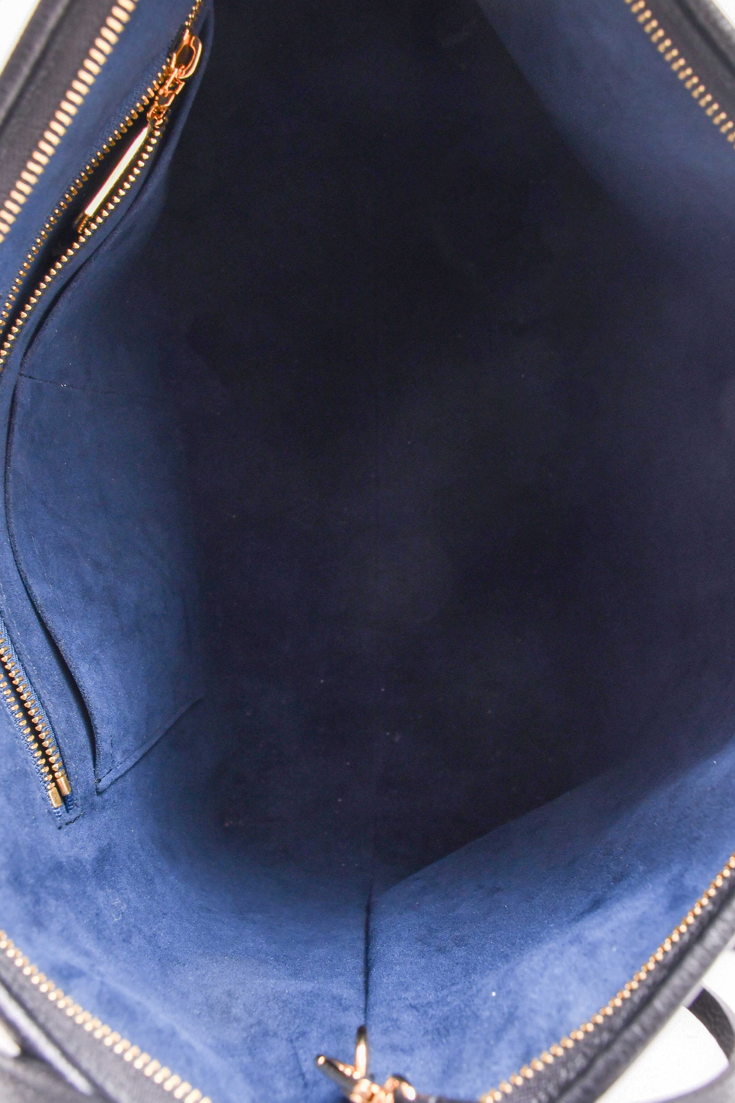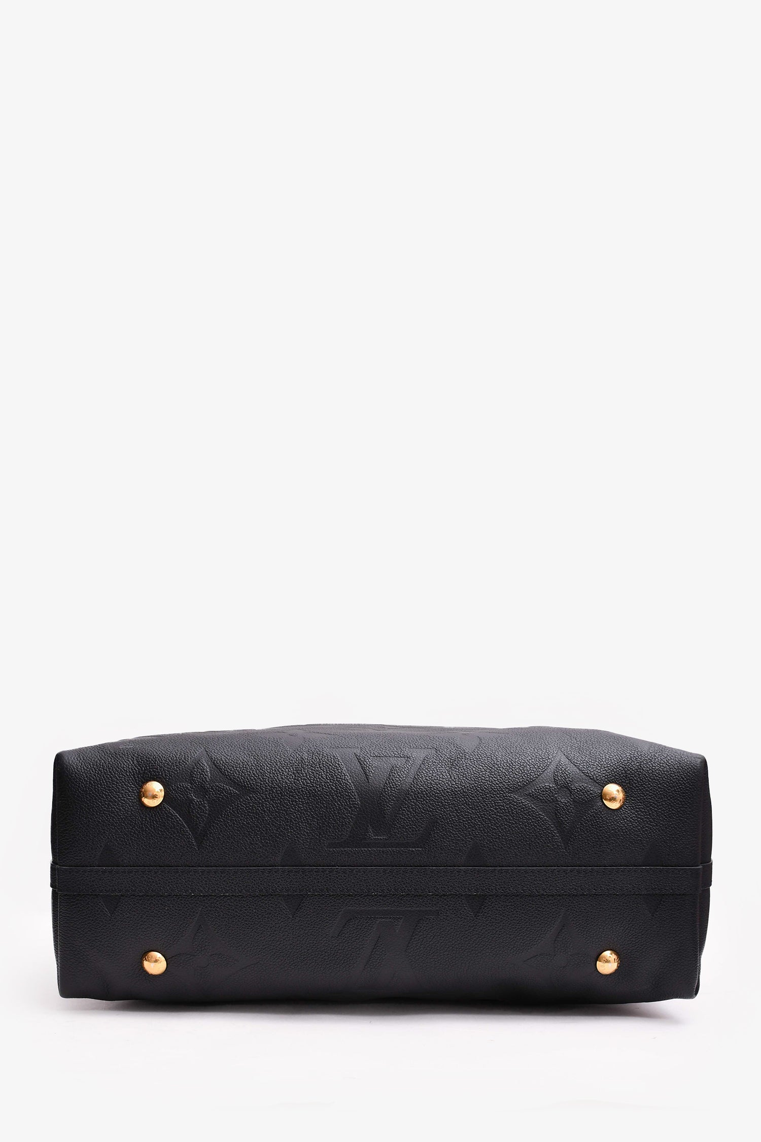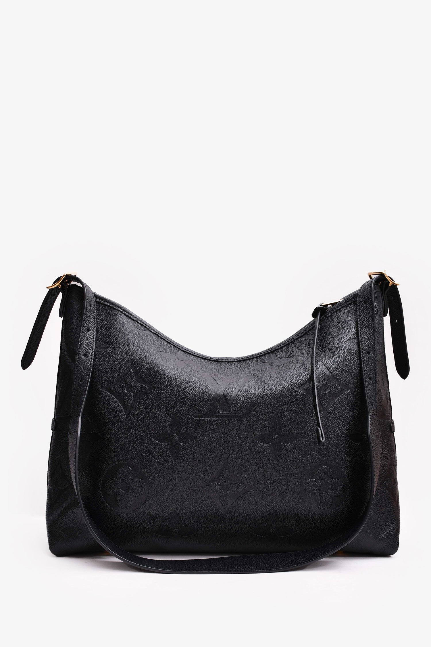 Louis Vuitton Black Empreinte Carryall MM Shoulder Bag. Top zip closure. Dark navy suede lining. 3 interior wall pockets; 2 slip and 1 with zip closure. Detachable interior zip pouch. Gold-tone hardware. Adjustable strap. Detachable luggage tag. Protective metal bottom.