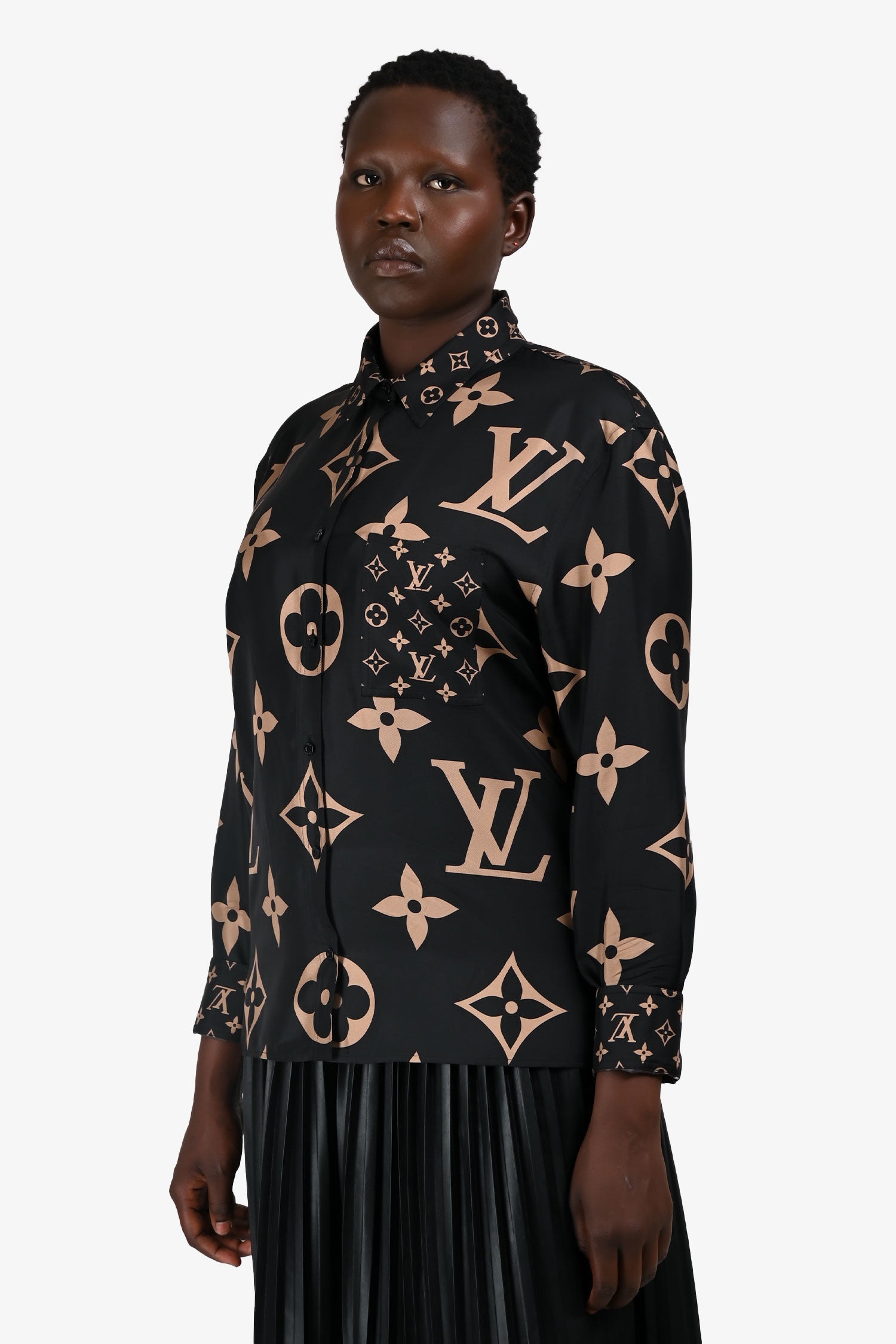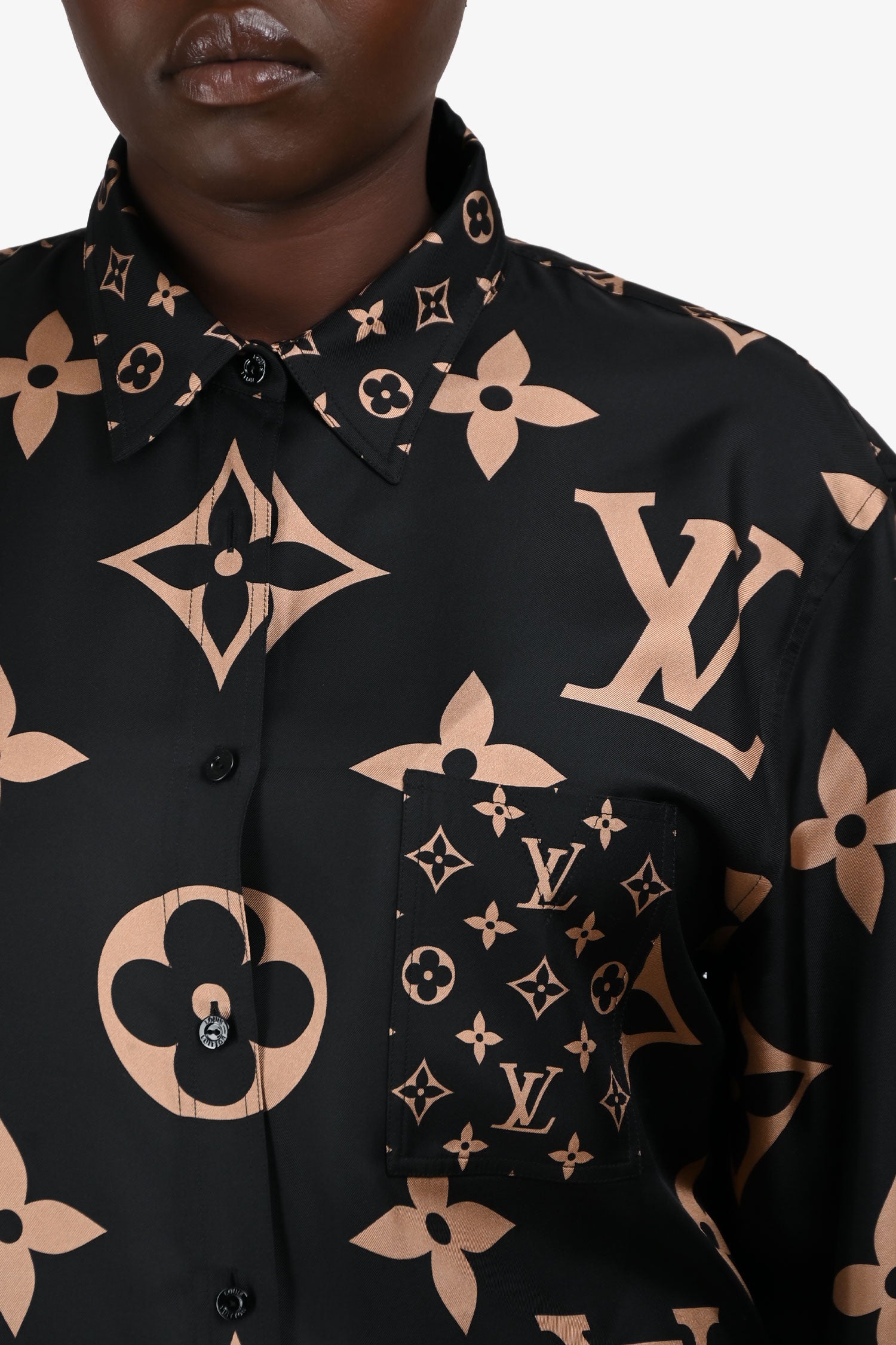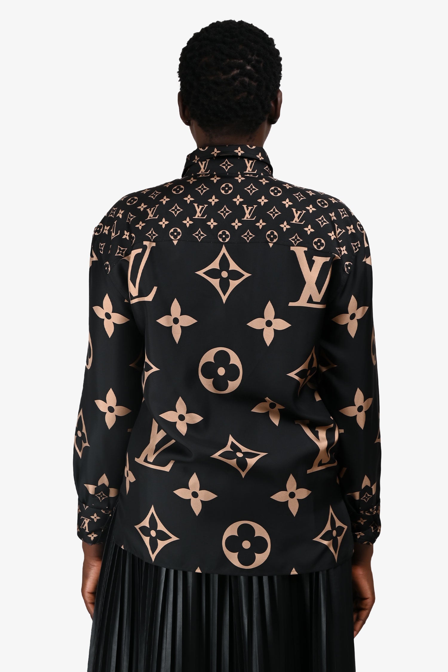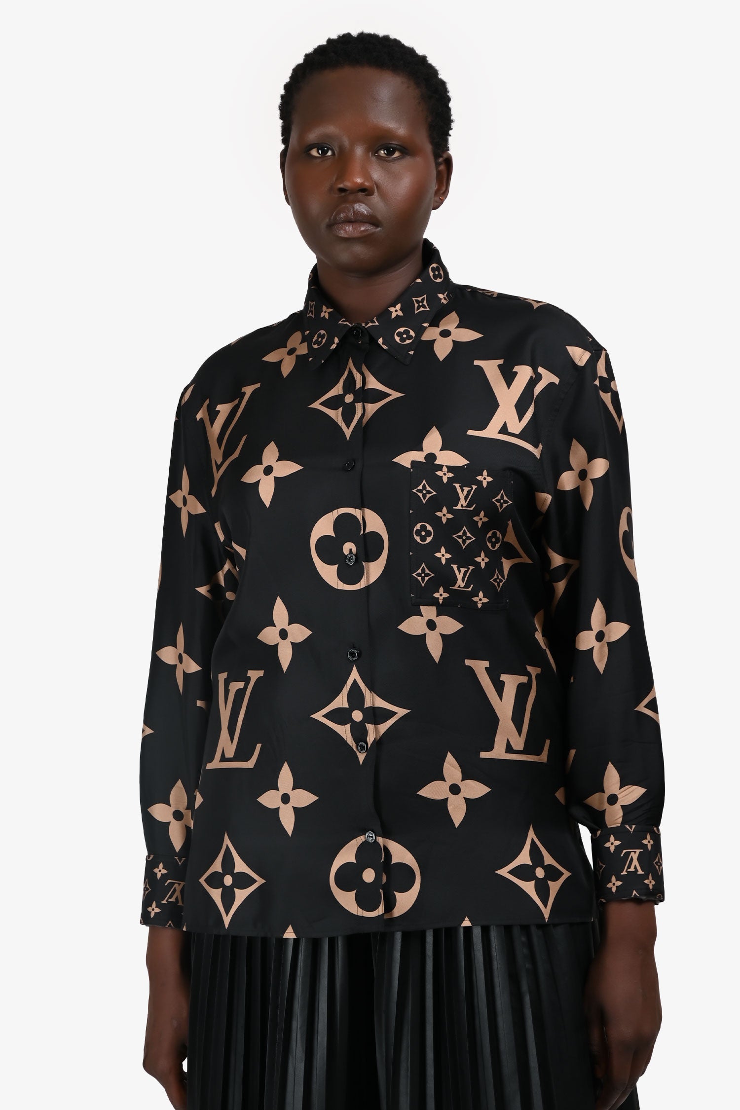 Refresh availabilityLouis Vuitton Black/Gold Silk Monogram Button Shirt. Collared neckline. Front button-up closure. Single front chest pocket. Button-up closure on sleeve cuffs. Tonal and contrast stitching.