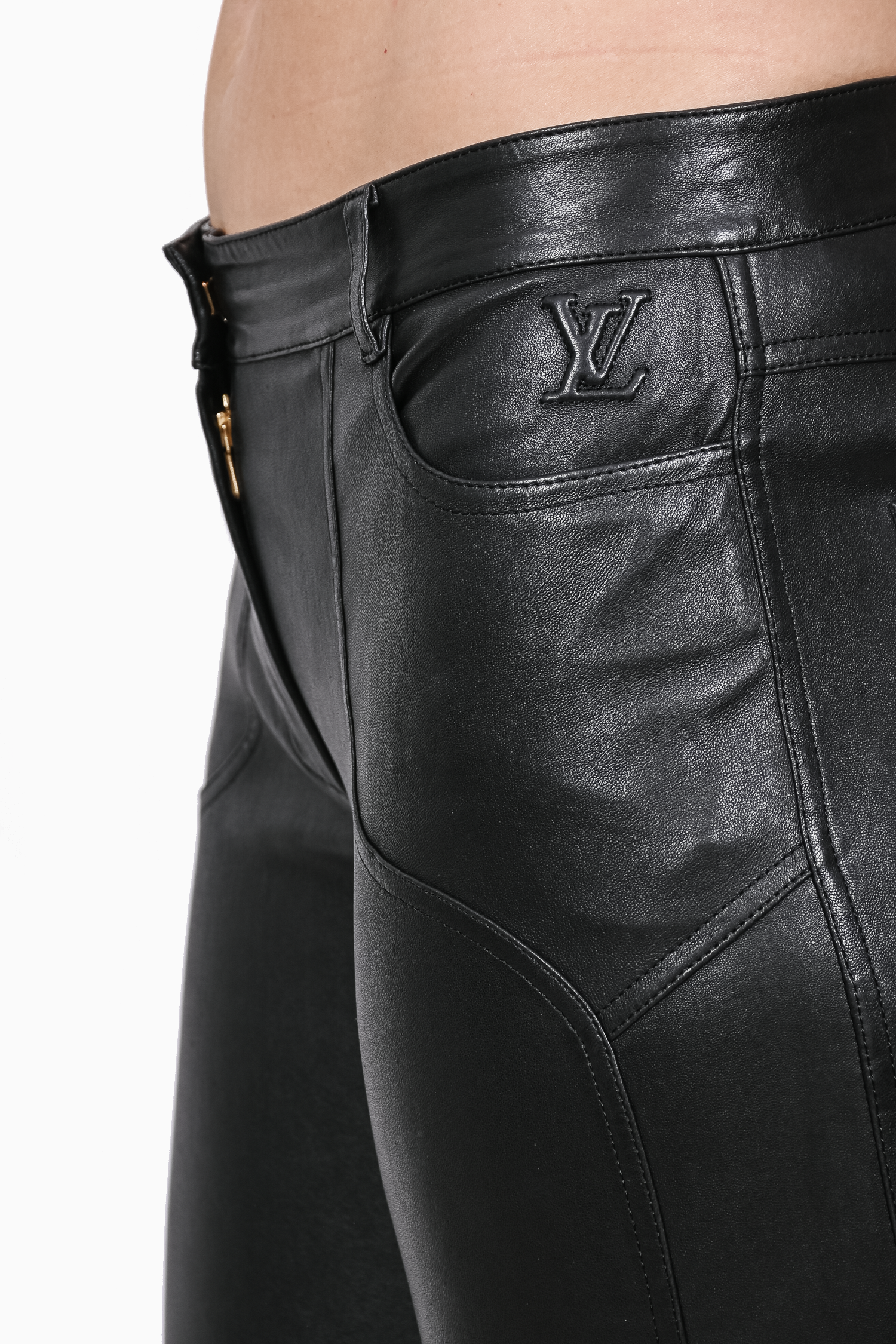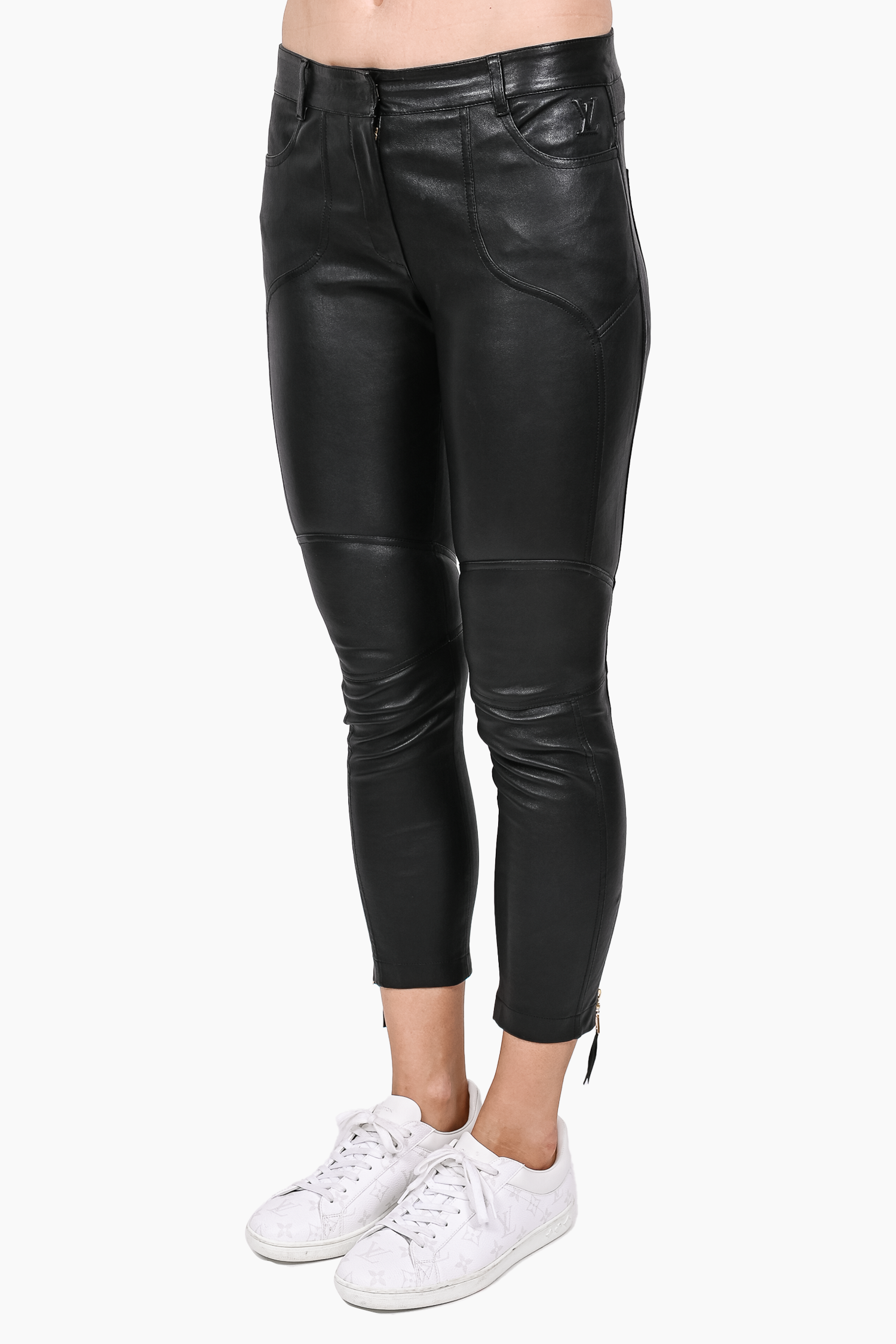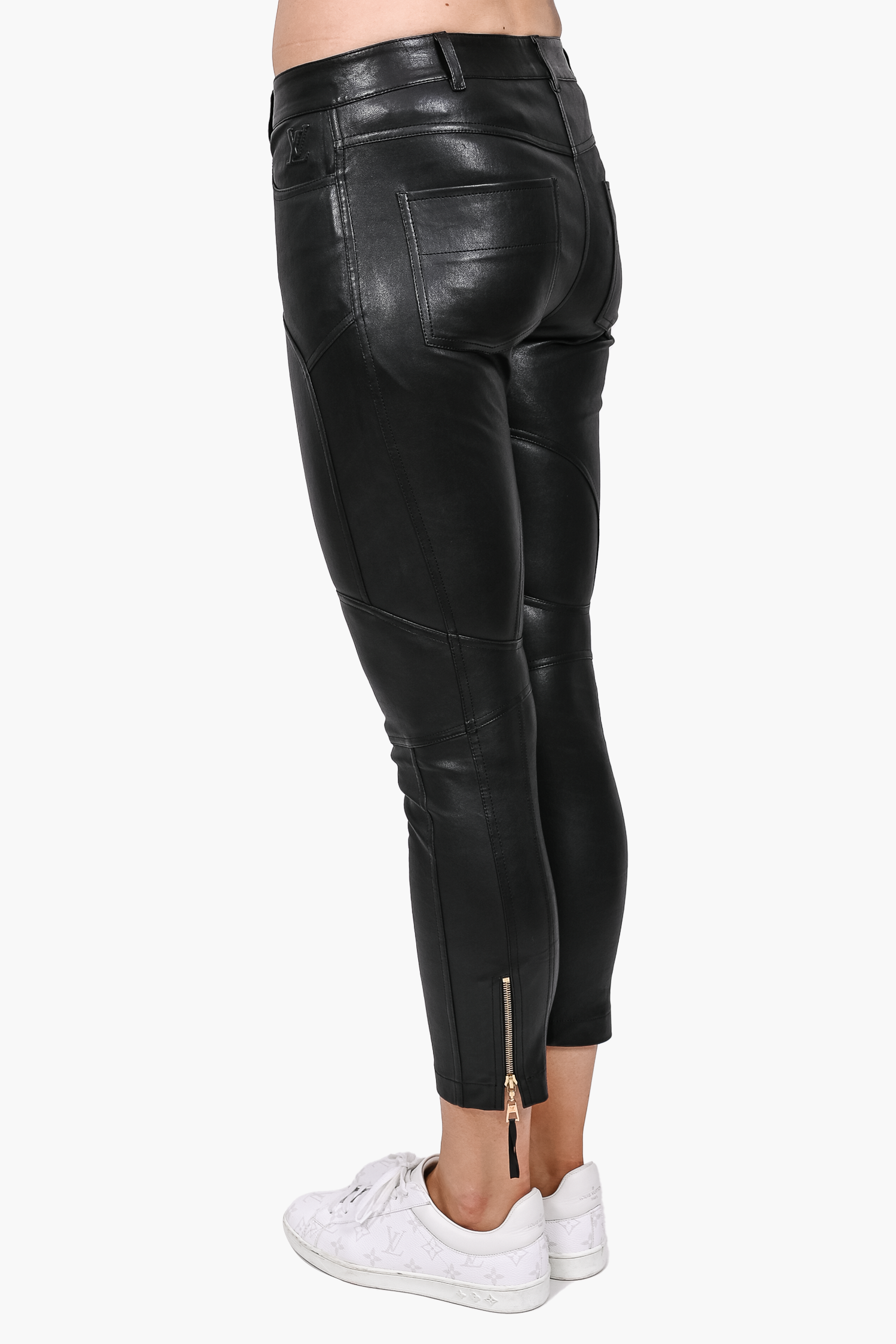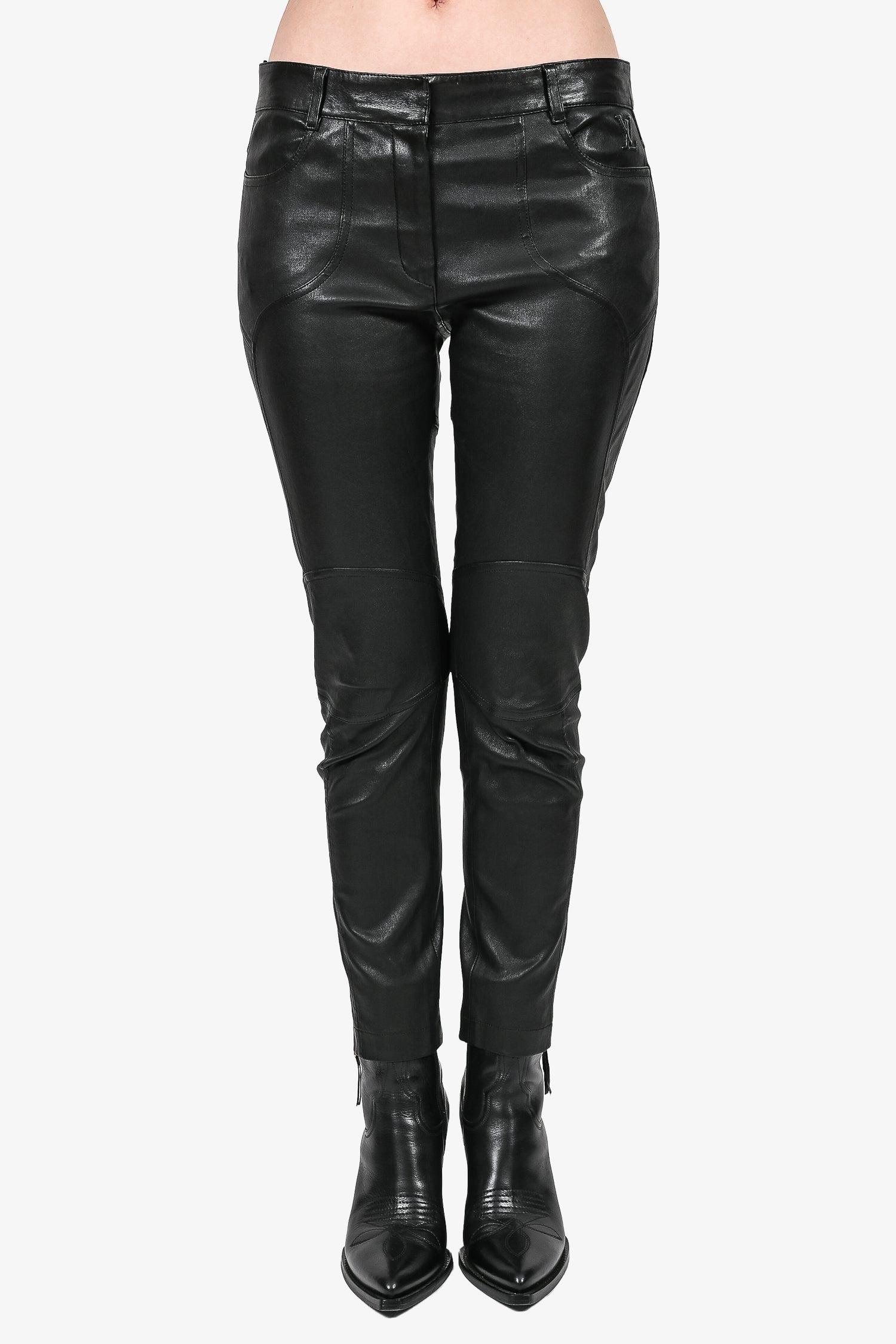 Refresh availabilityLouis Vuitton Black Lambskin Leather Moto Pants with Gold Zip Ankle Detail. Front zip and hook closure. Front pockets. Waist belt loops. Tonal stitching.