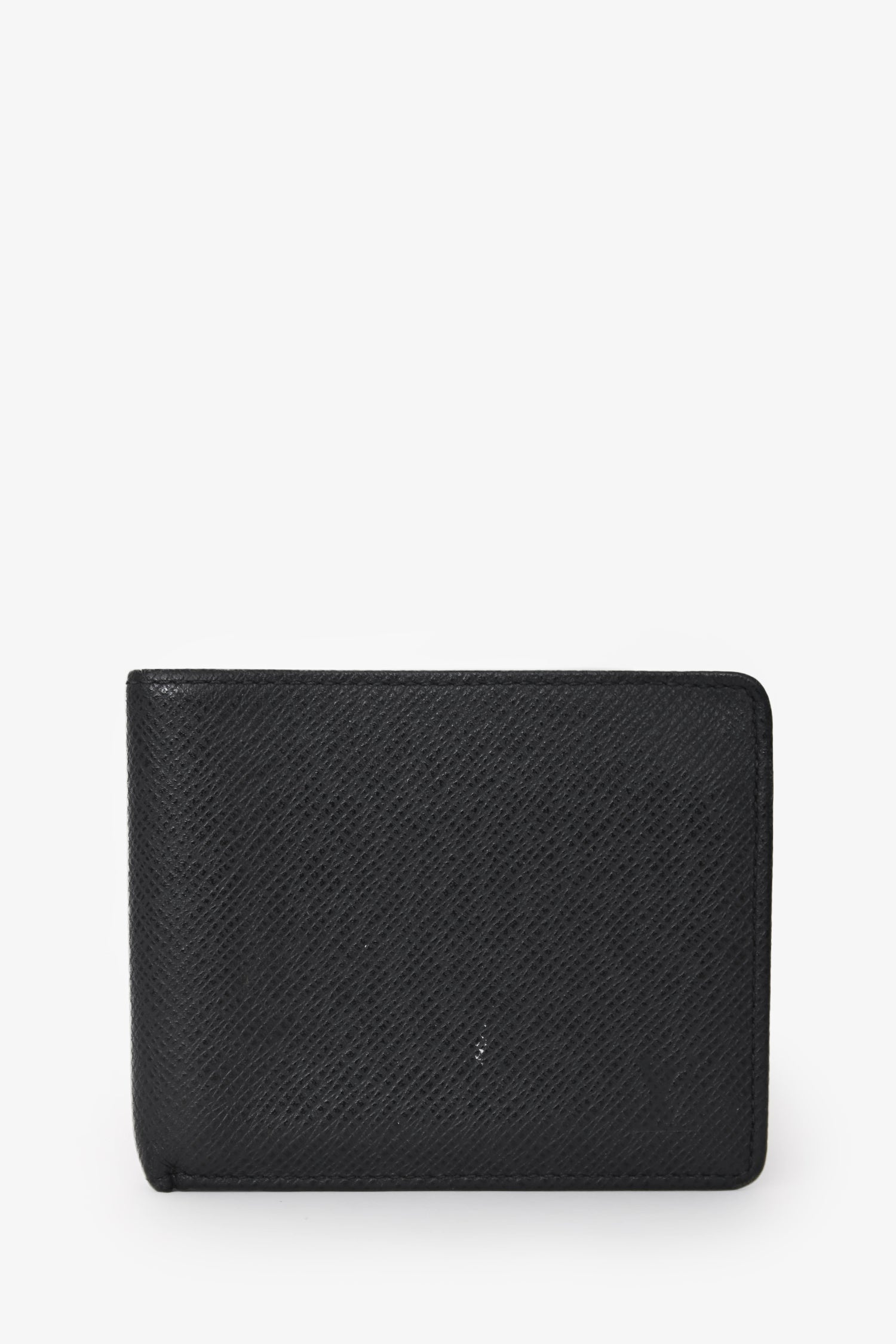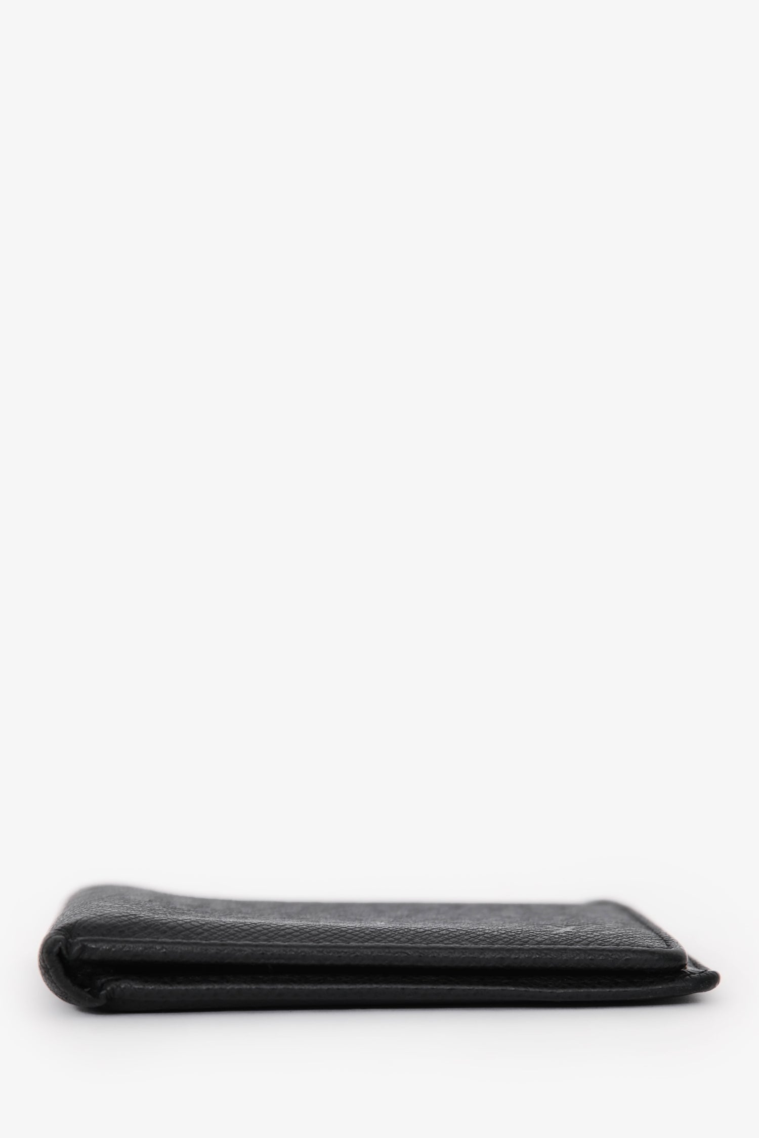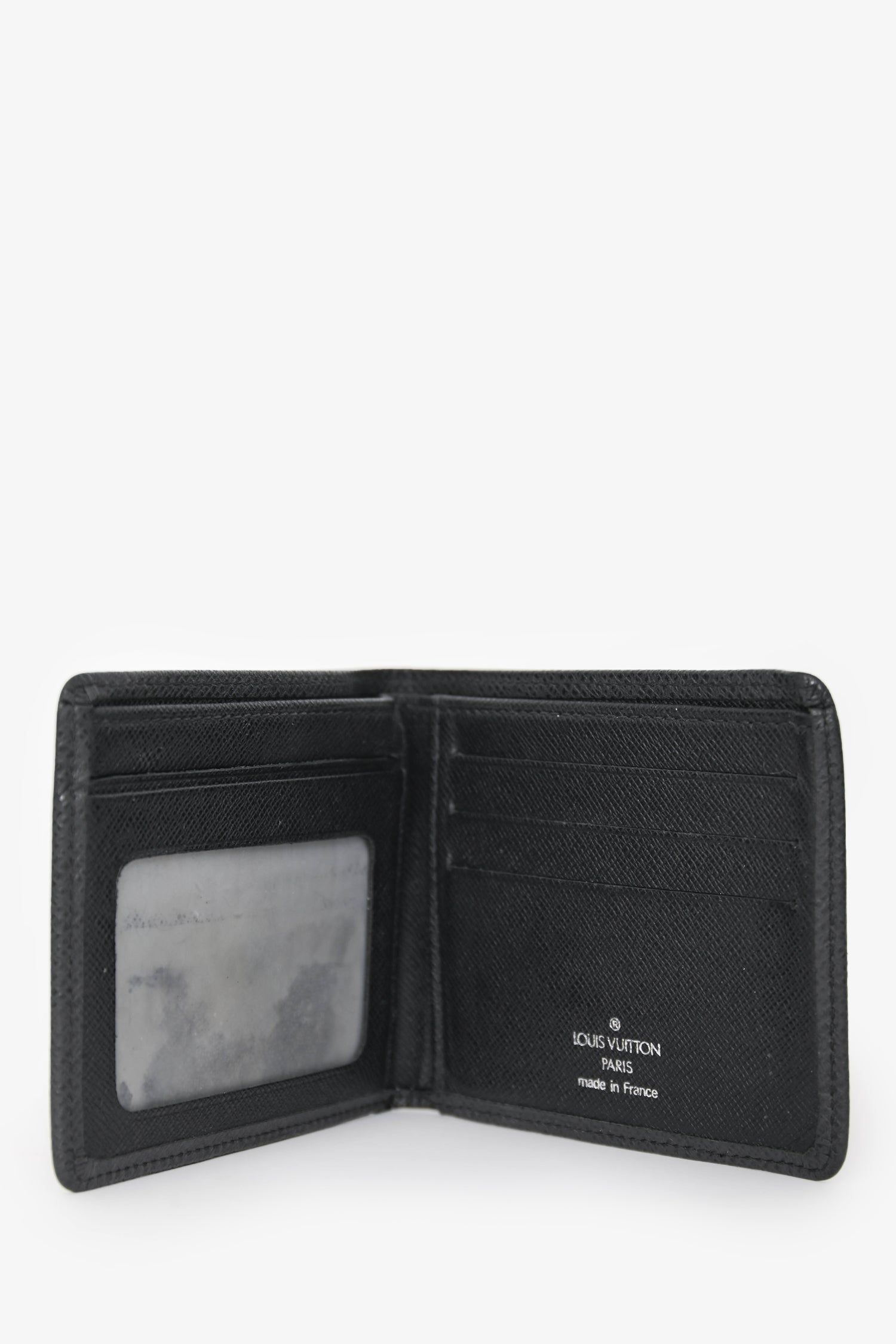 Refresh availabilityLouis Vuitton Black Leather Bi-Fold Wallet. Fold-open construction. Interior with 1 bill compartment, 3 card slots, and 1 slip pocket. Tonal stitching.