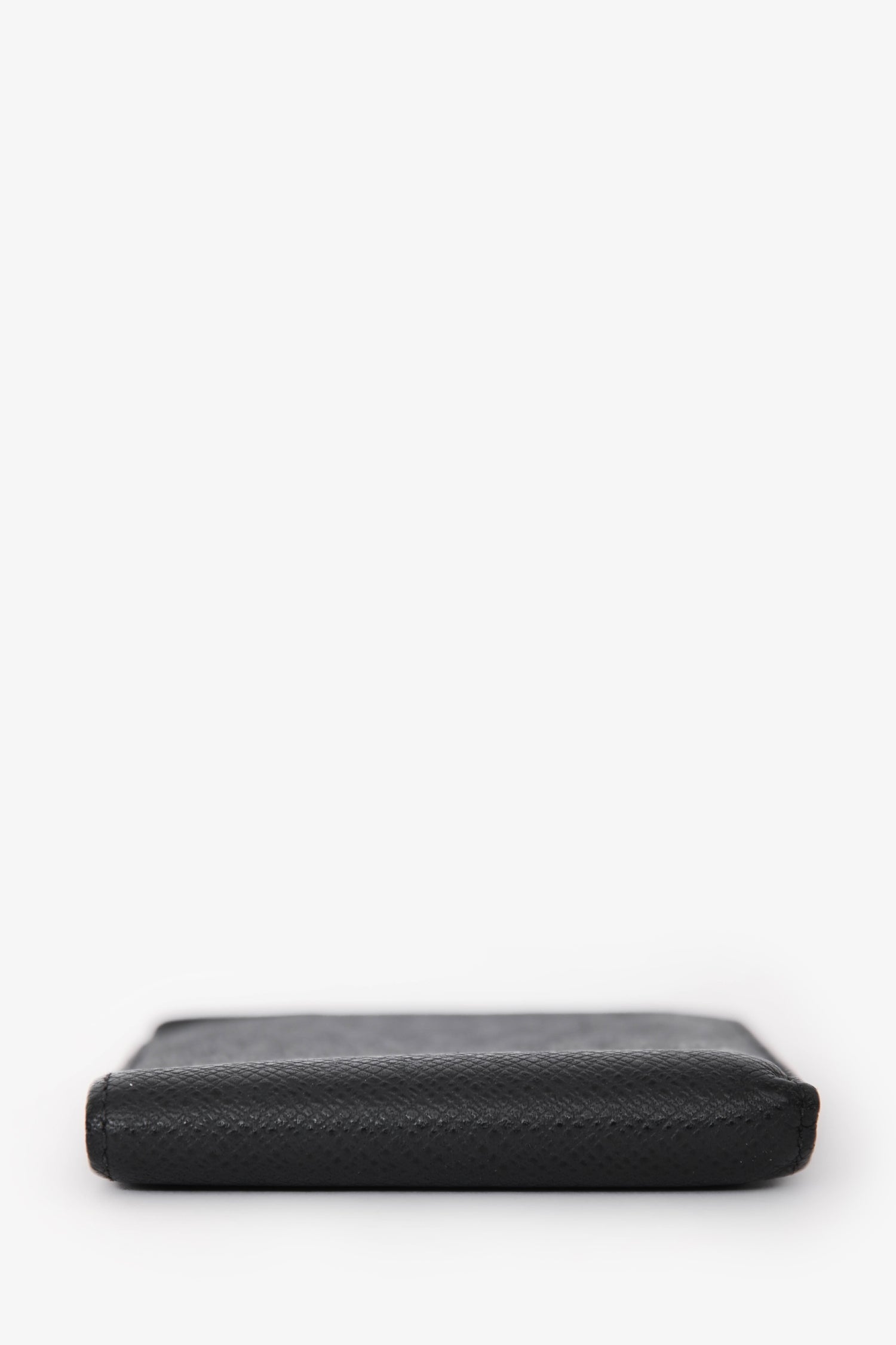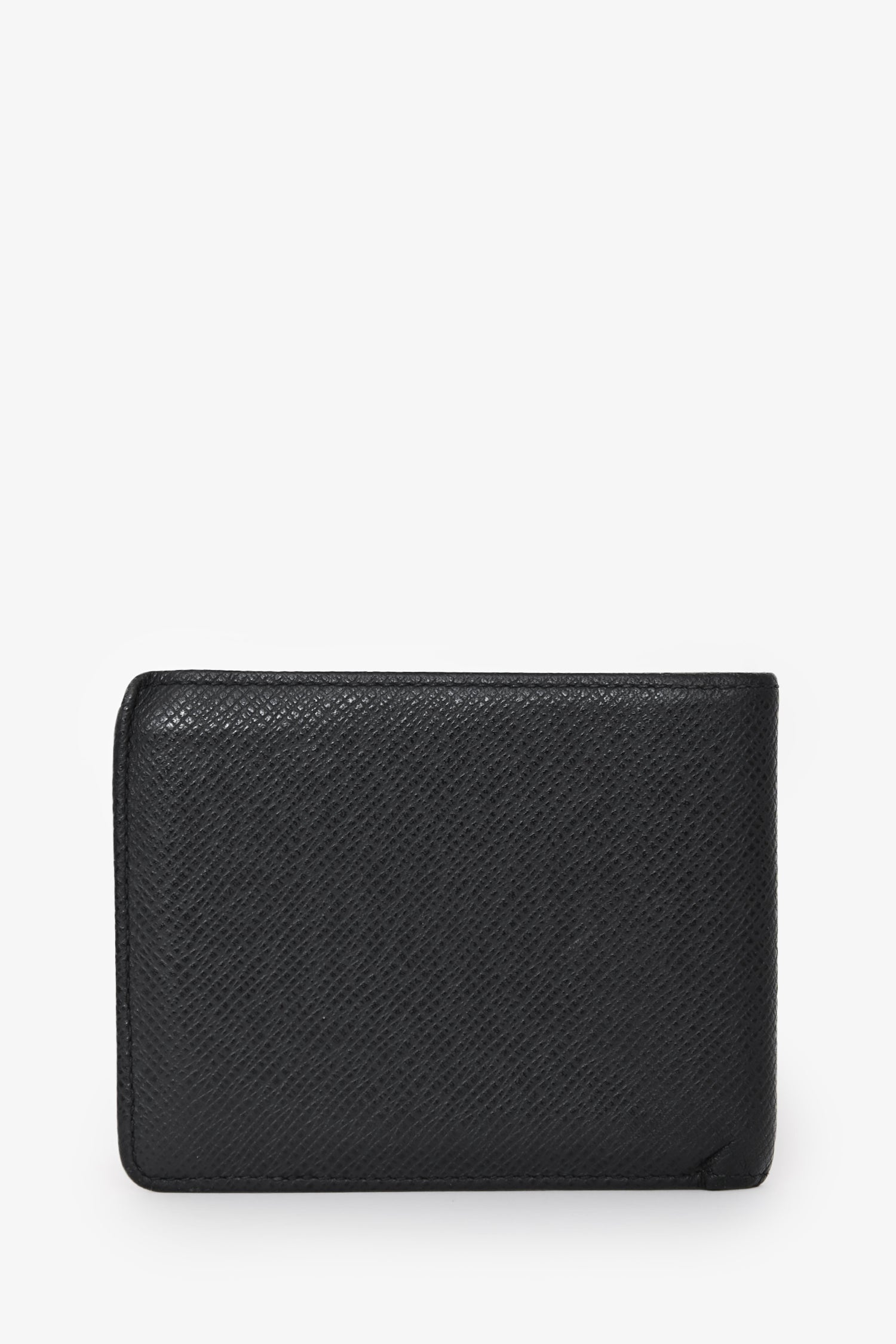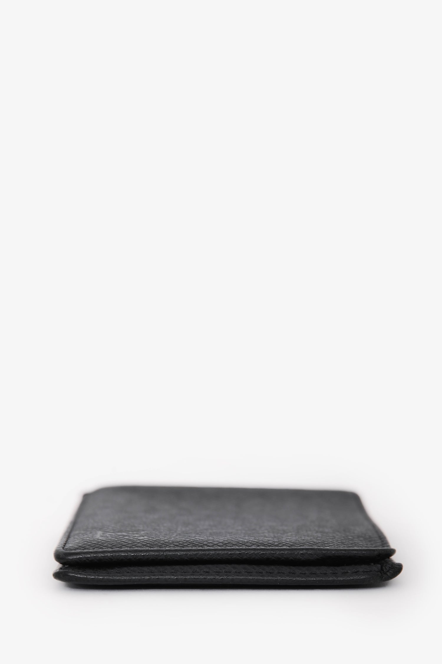 Refresh availabilityLouis Vuitton Black Leather Bi-Fold Wallet. Fold-open construction. Interior with 1 bill compartment, 3 card slots, and 1 slip pocket. Tonal stitching.