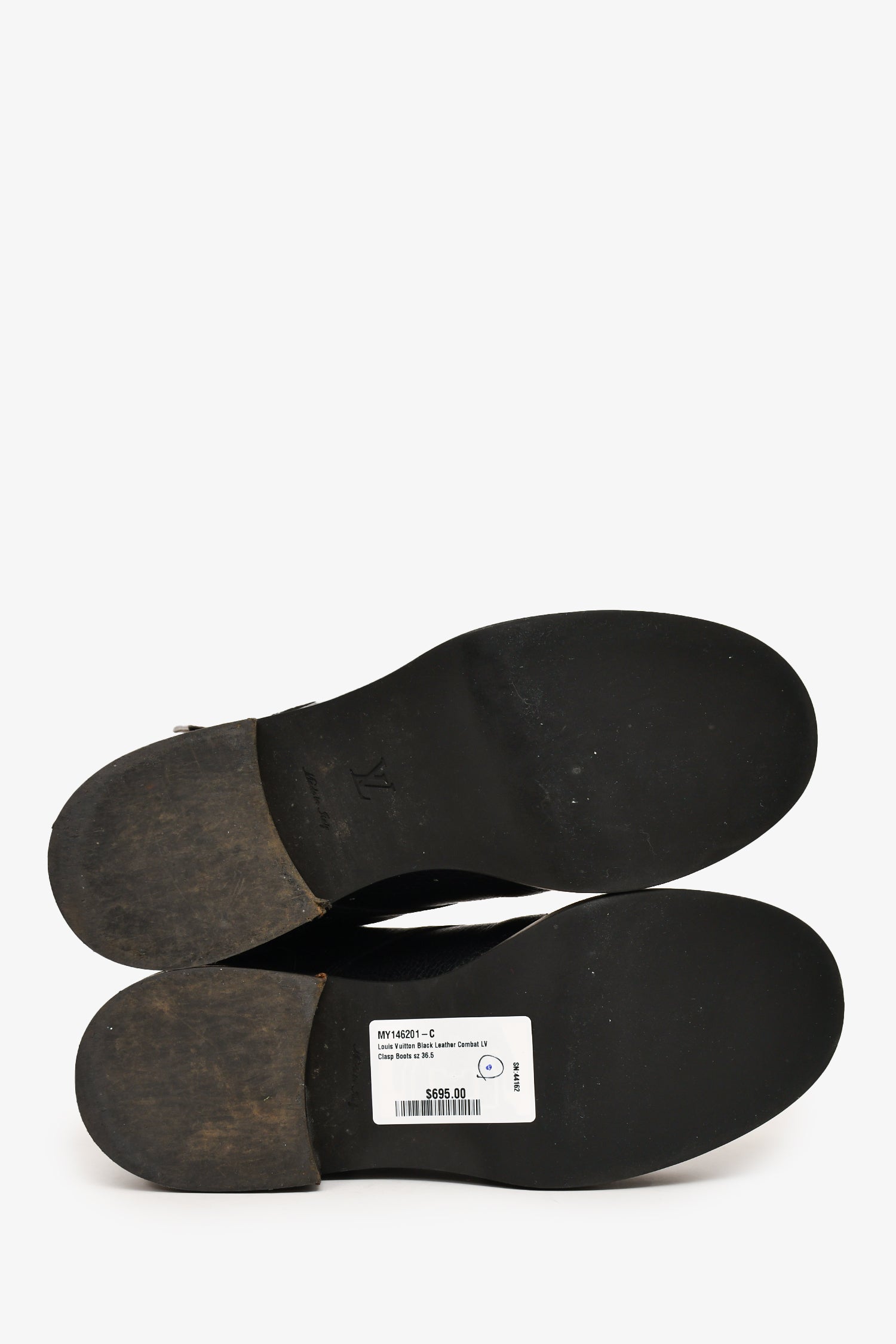 Refresh availabilityLouis Vuitton Black Leather Combat LV Clasp Boots. Round toe. Shoe-lace closure with flap at the ankle. Gold-tone hardware. Tonal stitching.