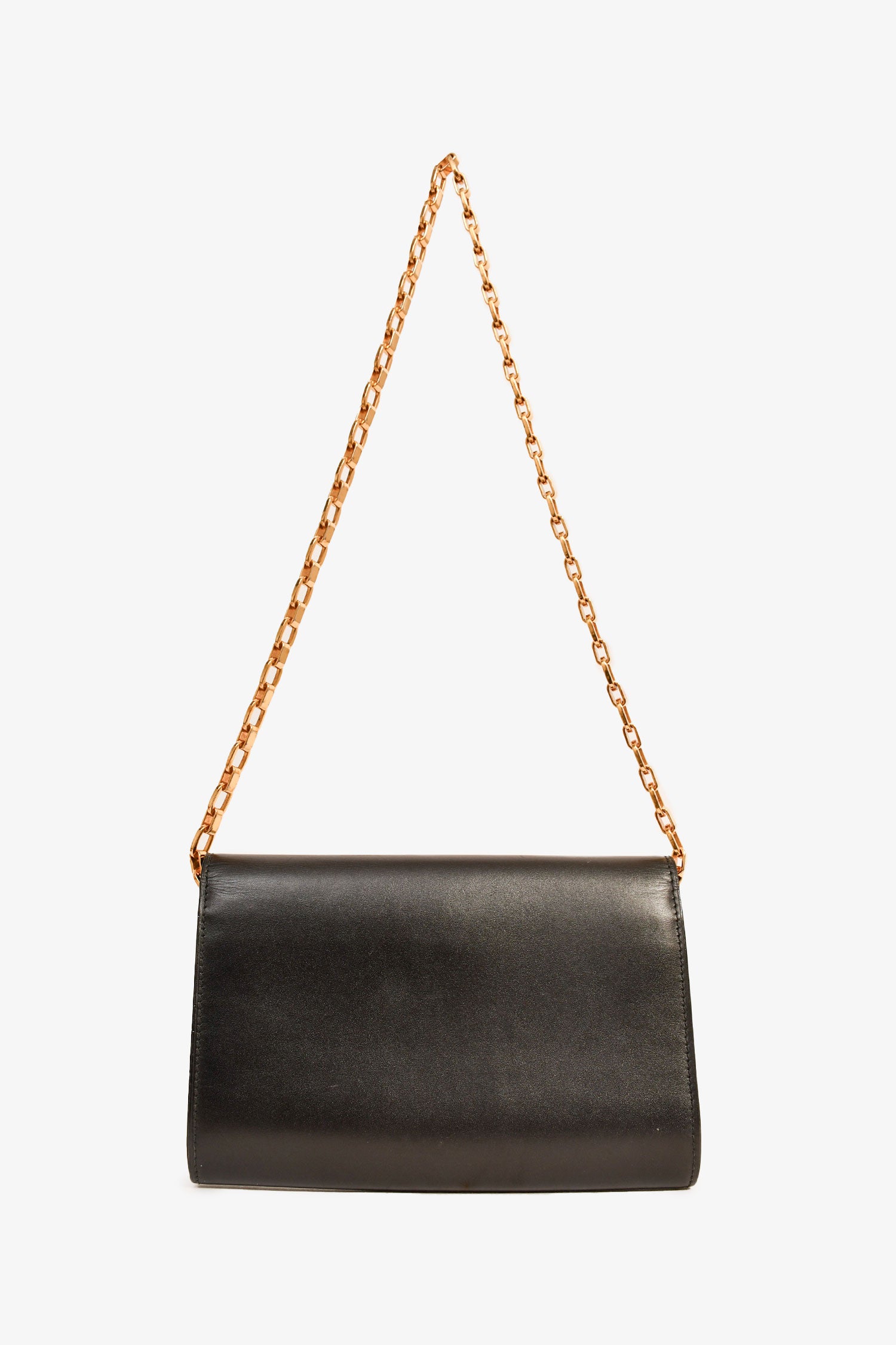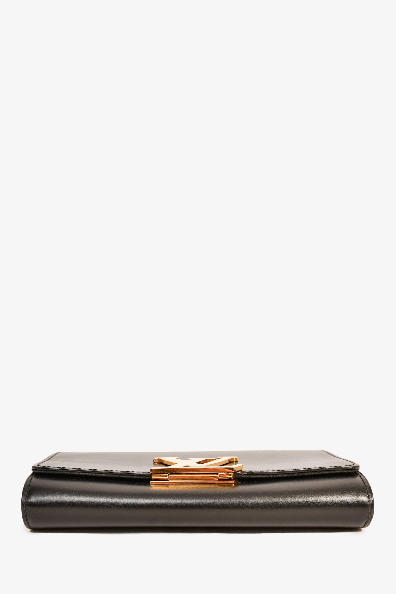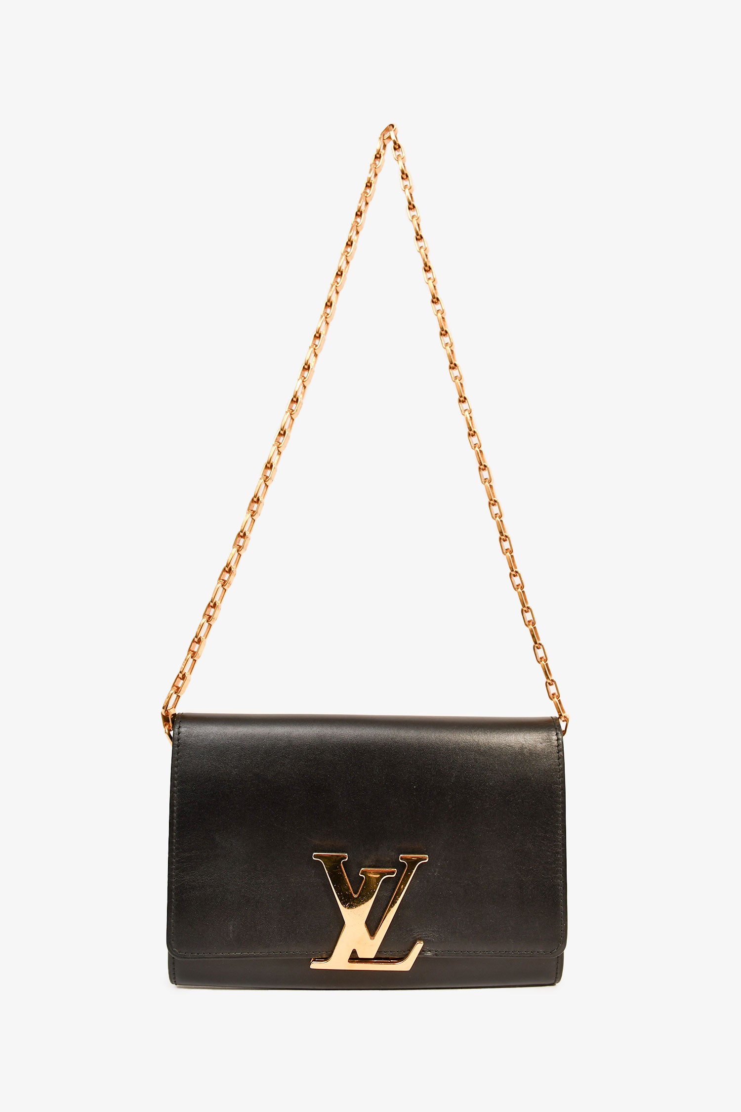 Refresh availabilityLouis Vuitton Black Leather LV 'Louise' GM Shoulder Bag. Gold-tone hardware. 'LV' flip-lock closure. Fold-over flap. Chain-link shoulder strap. Suede lined interior with 6 card slots. Single zipped compartment. Slip compartment. Tonal stitching.