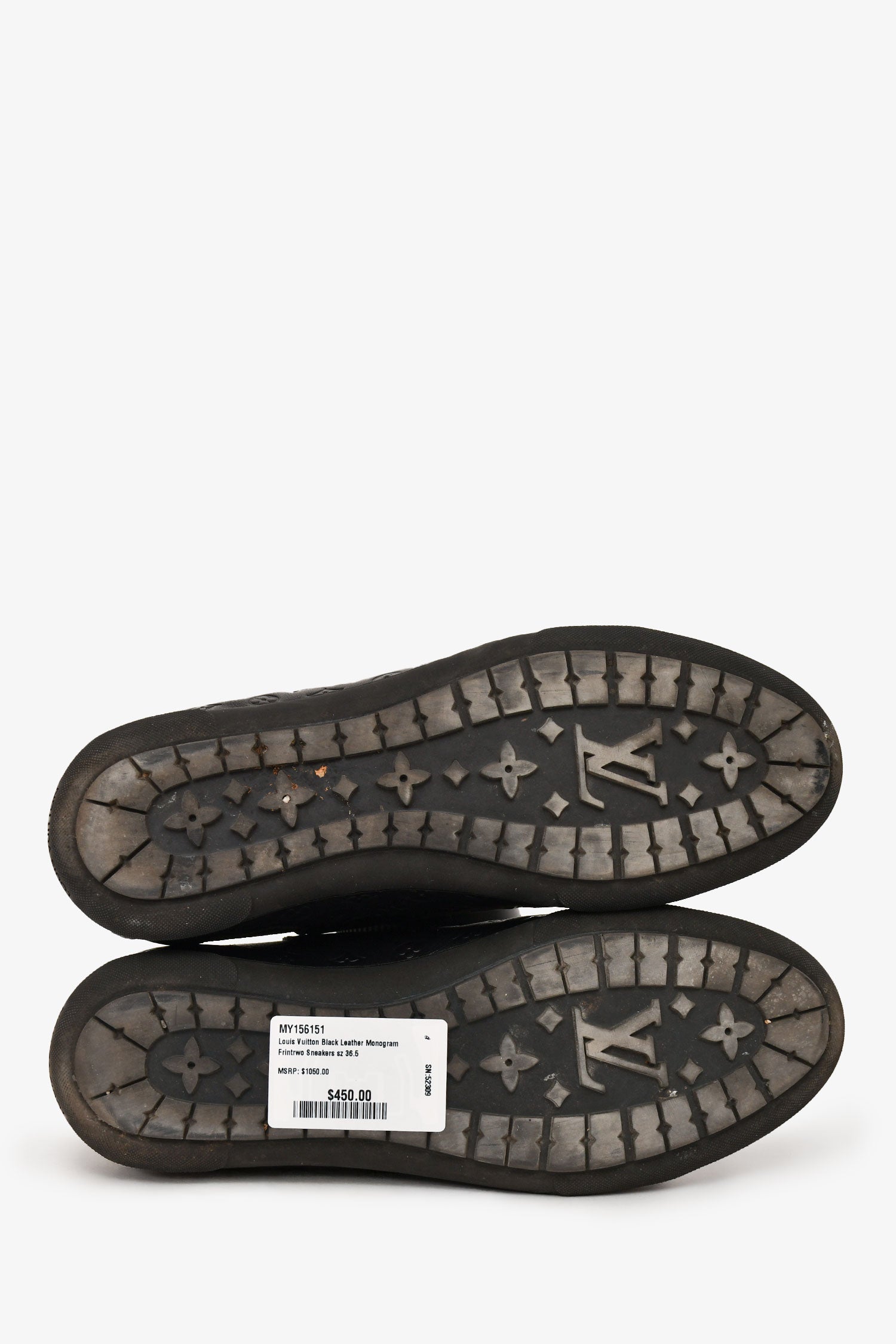 Refresh availabilityLouis Vuitton Black Leather Monogram Frontrow Sneakers. Round toe. Lace-up closure. Gold-tone logo accents. Rubber sole. Tonal stitching.