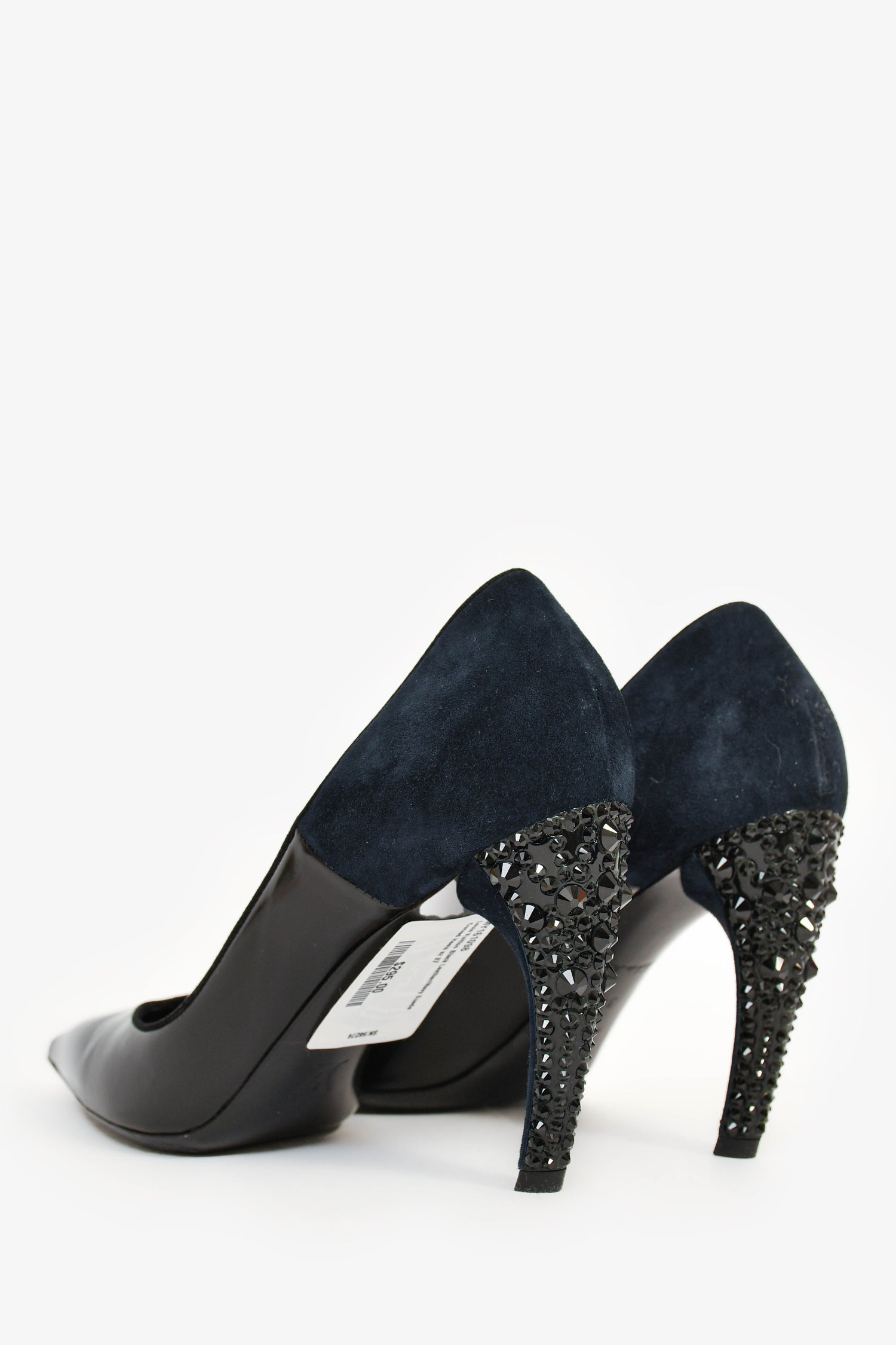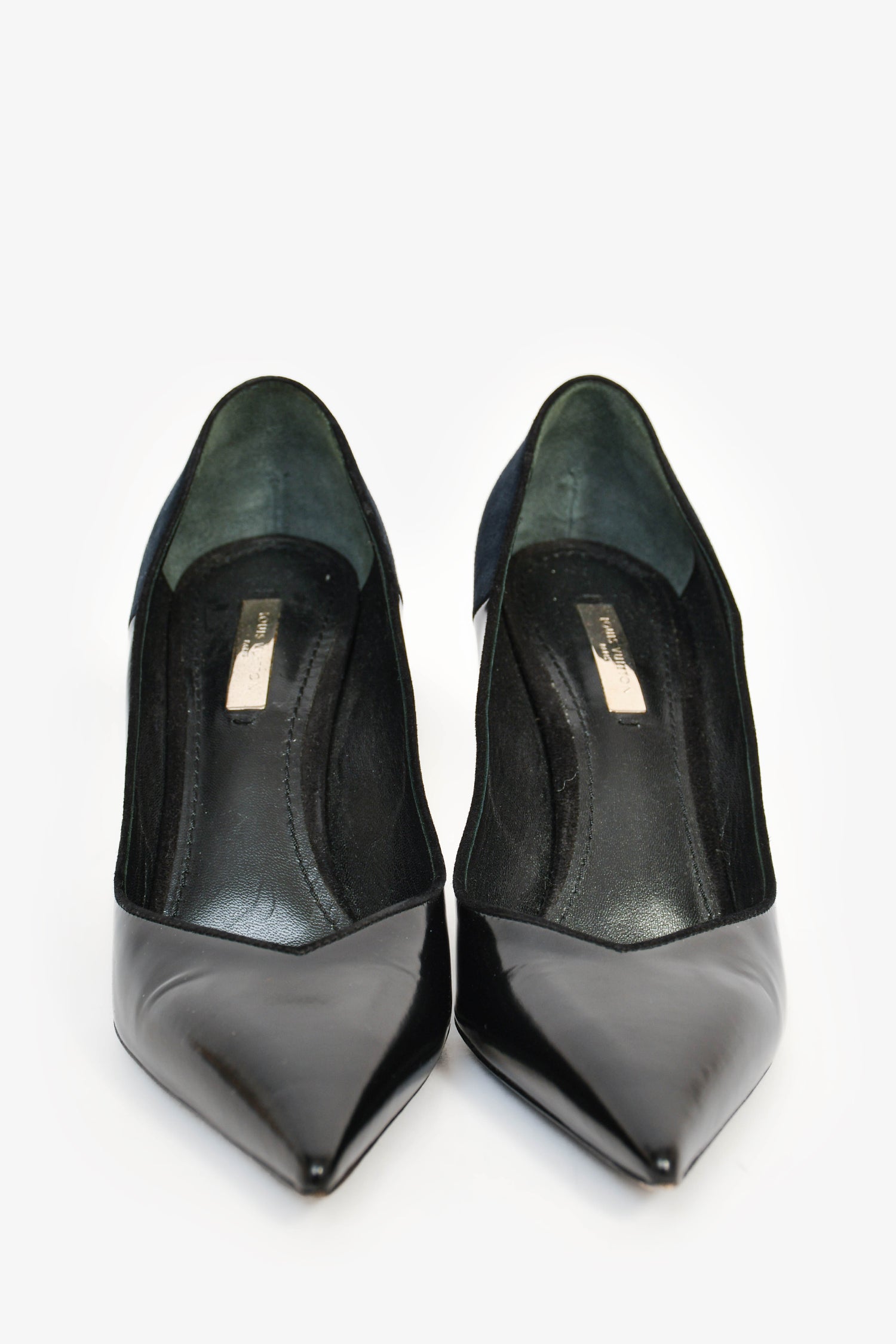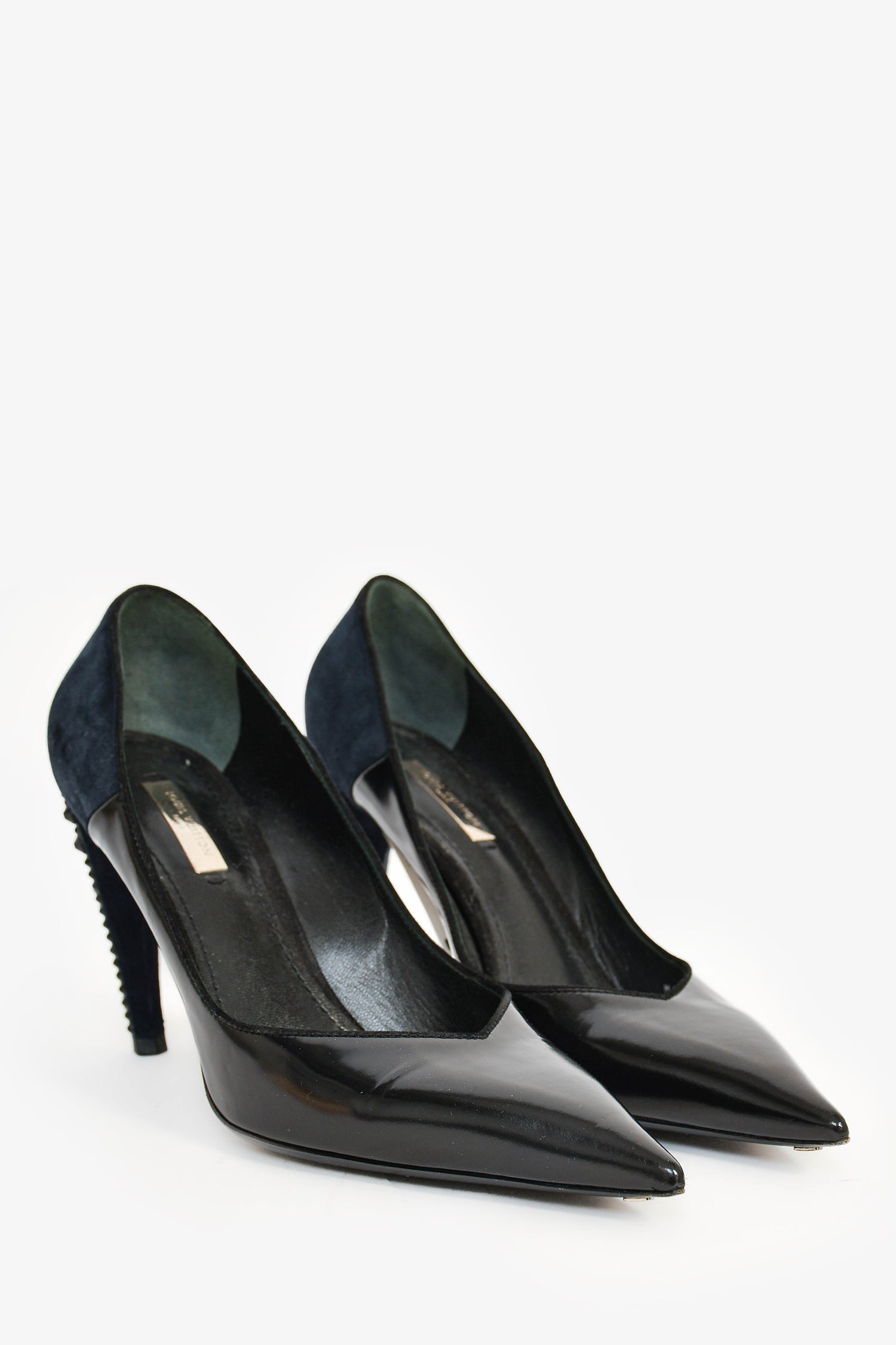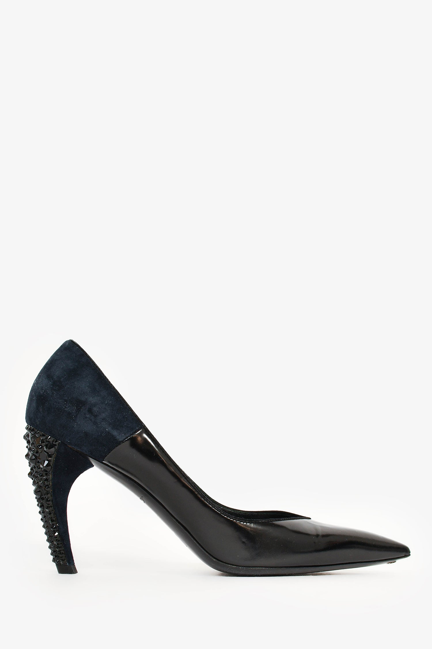 Refresh availabilityLouis Vuitton Black Leather/Navy Suede Curved Heels. Pointed toe. Suede trimming. Crystal heel. Tonal stitching.