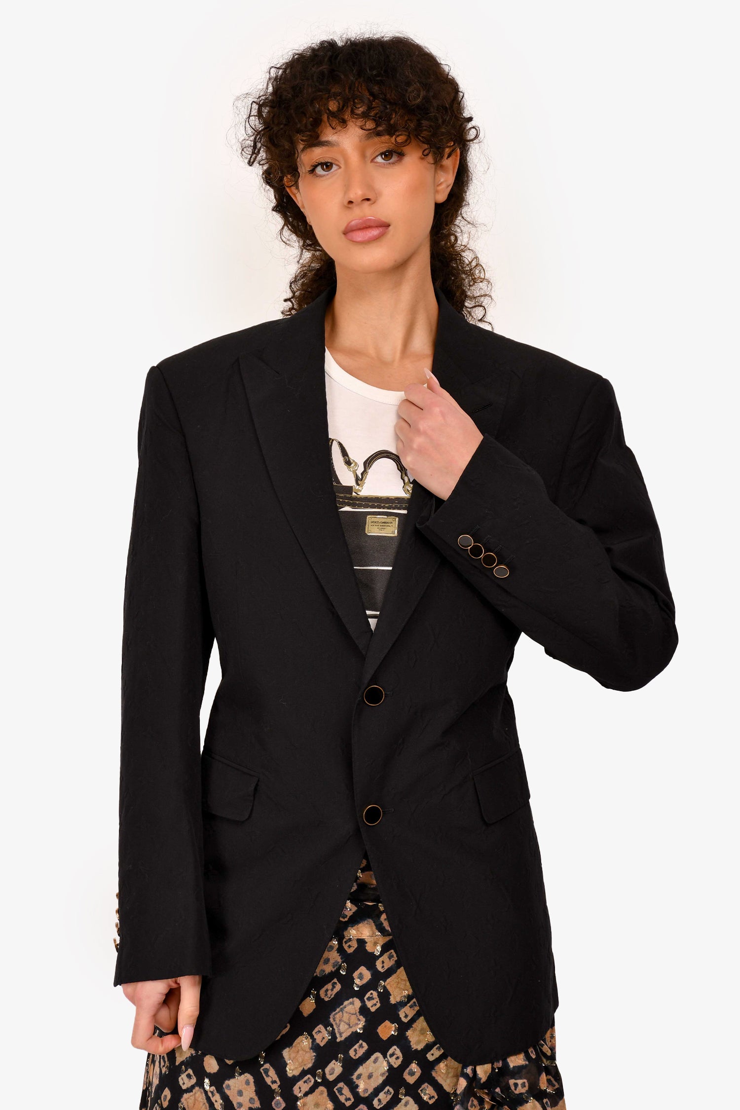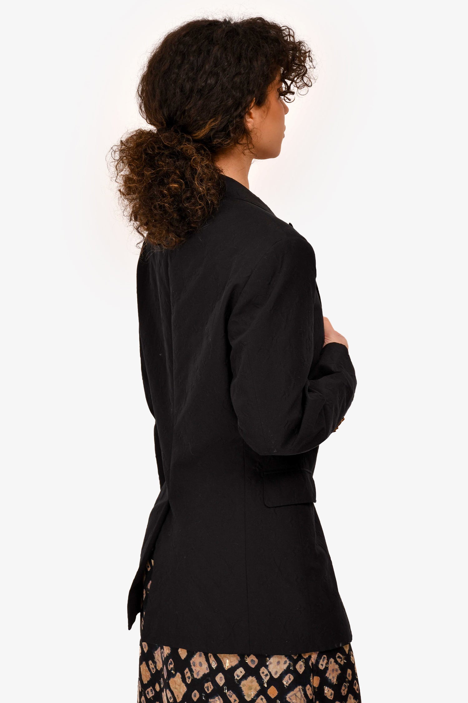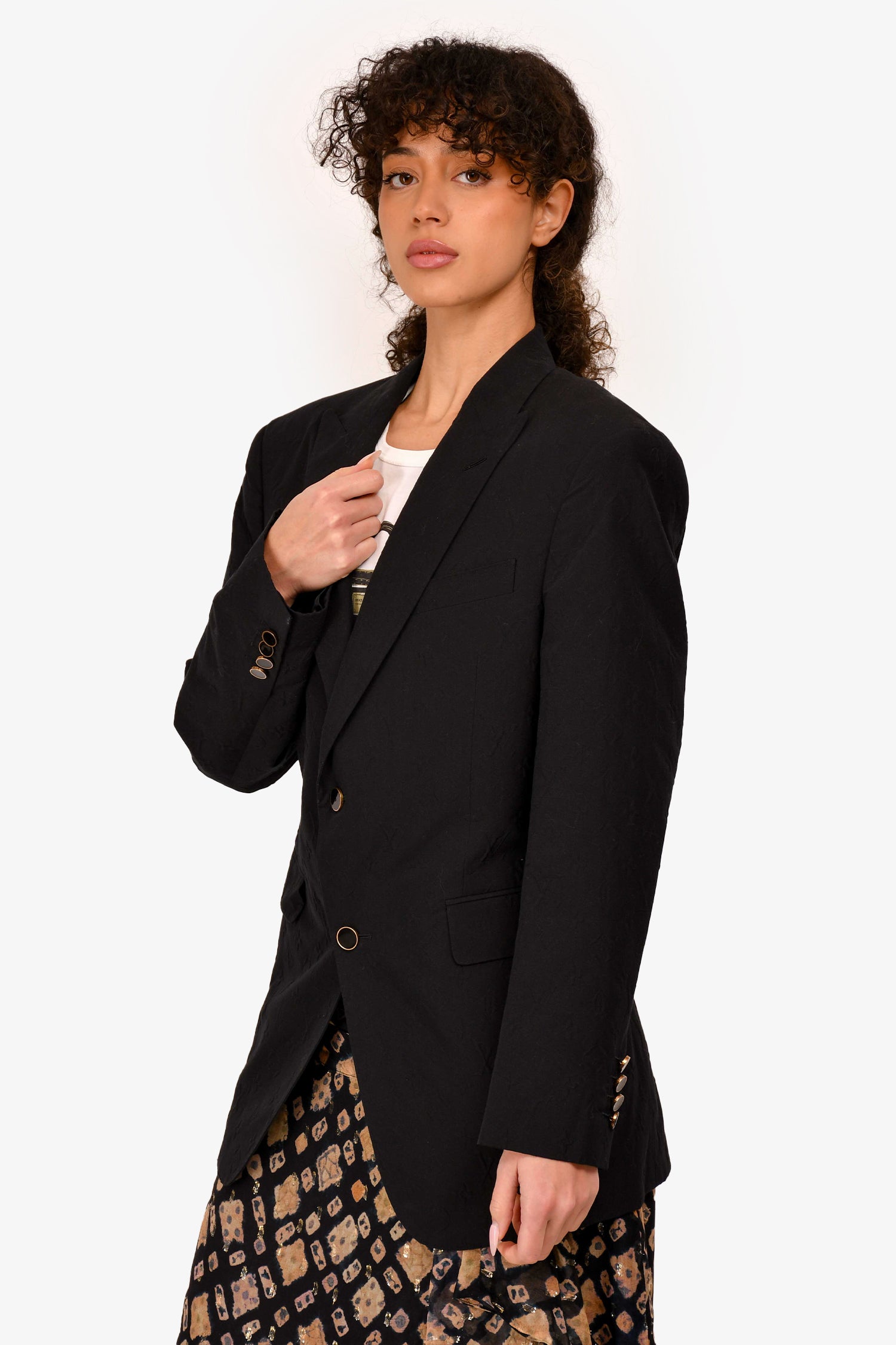 Refresh availabilityLouis Vuitton 2019 Black Monogram Blazer Jacket. Single upper chest pocket. 2 front welt pockets. Front button closure. Lined interior with 2 compartments. Monogrammed motif throughout. Tonal stitching.