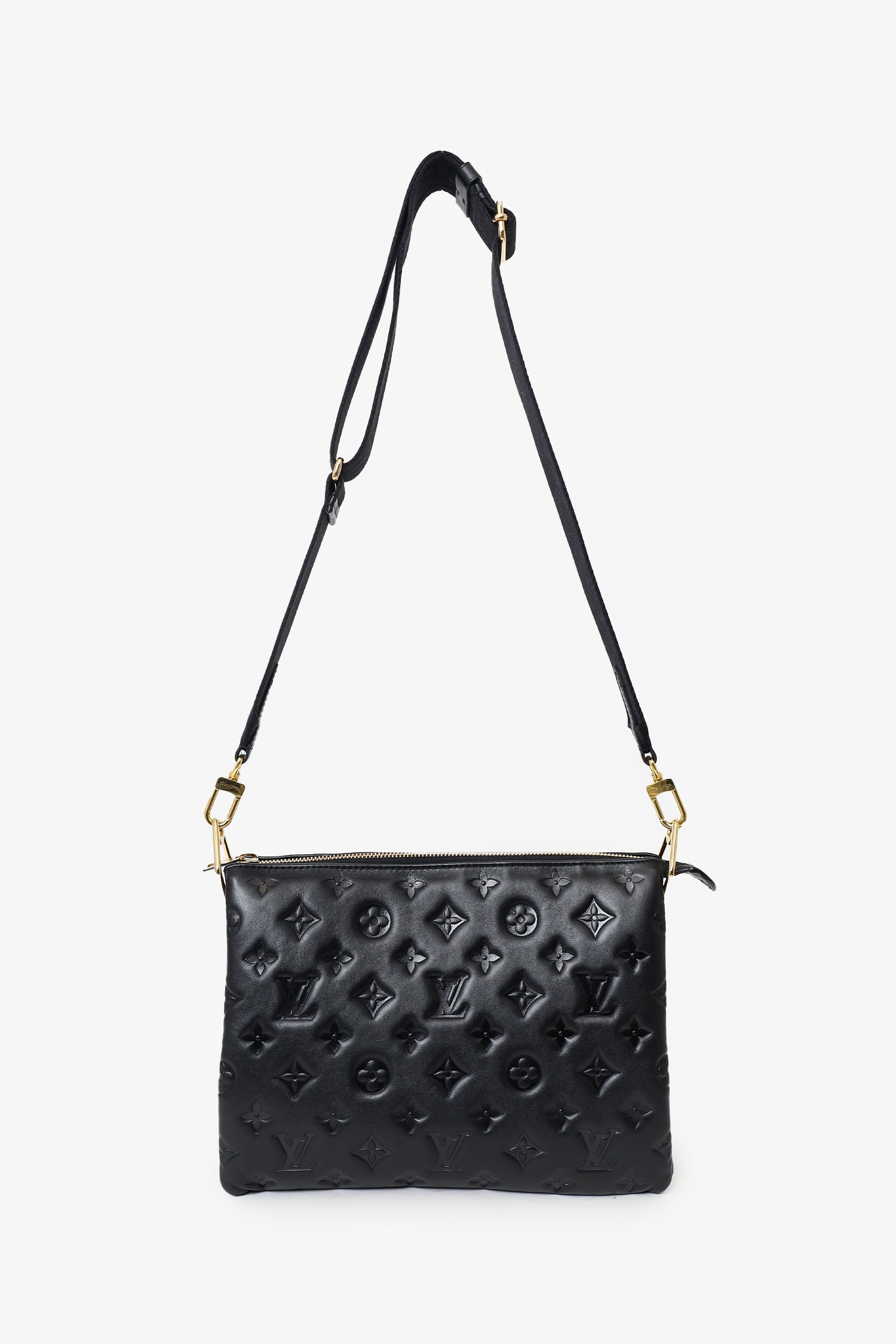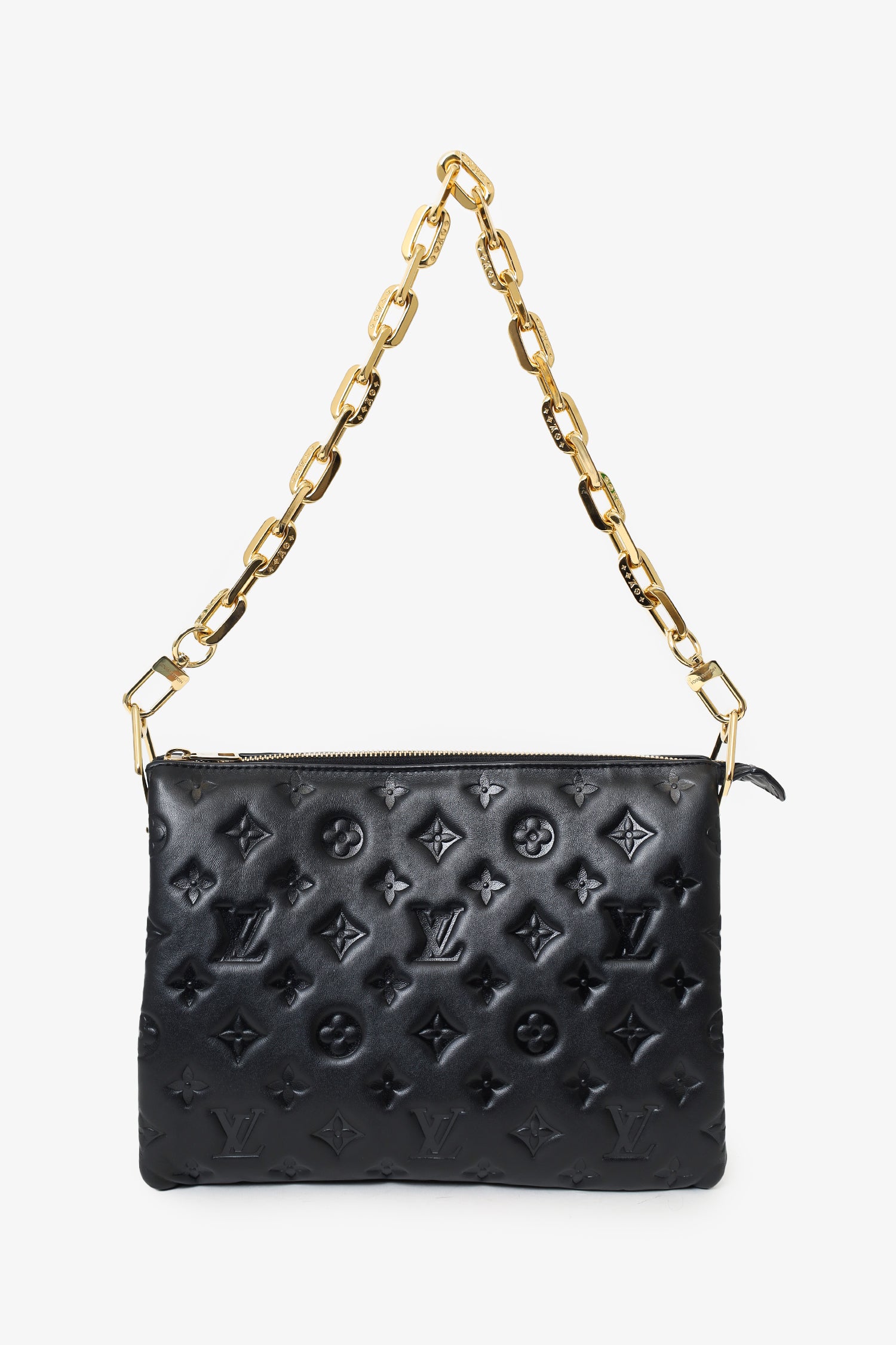 Refresh availabilityLouis Vuitton Black Monogram Embossed Leather Puffy Coussin PM. Top zip closure. 2 removable straps; chainlink strap and canvas strap with adjustable buckle closure. Lined interior. 3 interior compartments; 2 side open compartments and middle zip compartment. Gold-tone hardware. Tonal stitching.