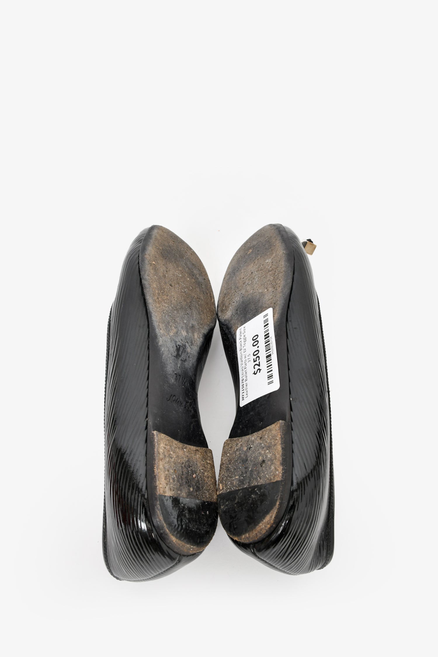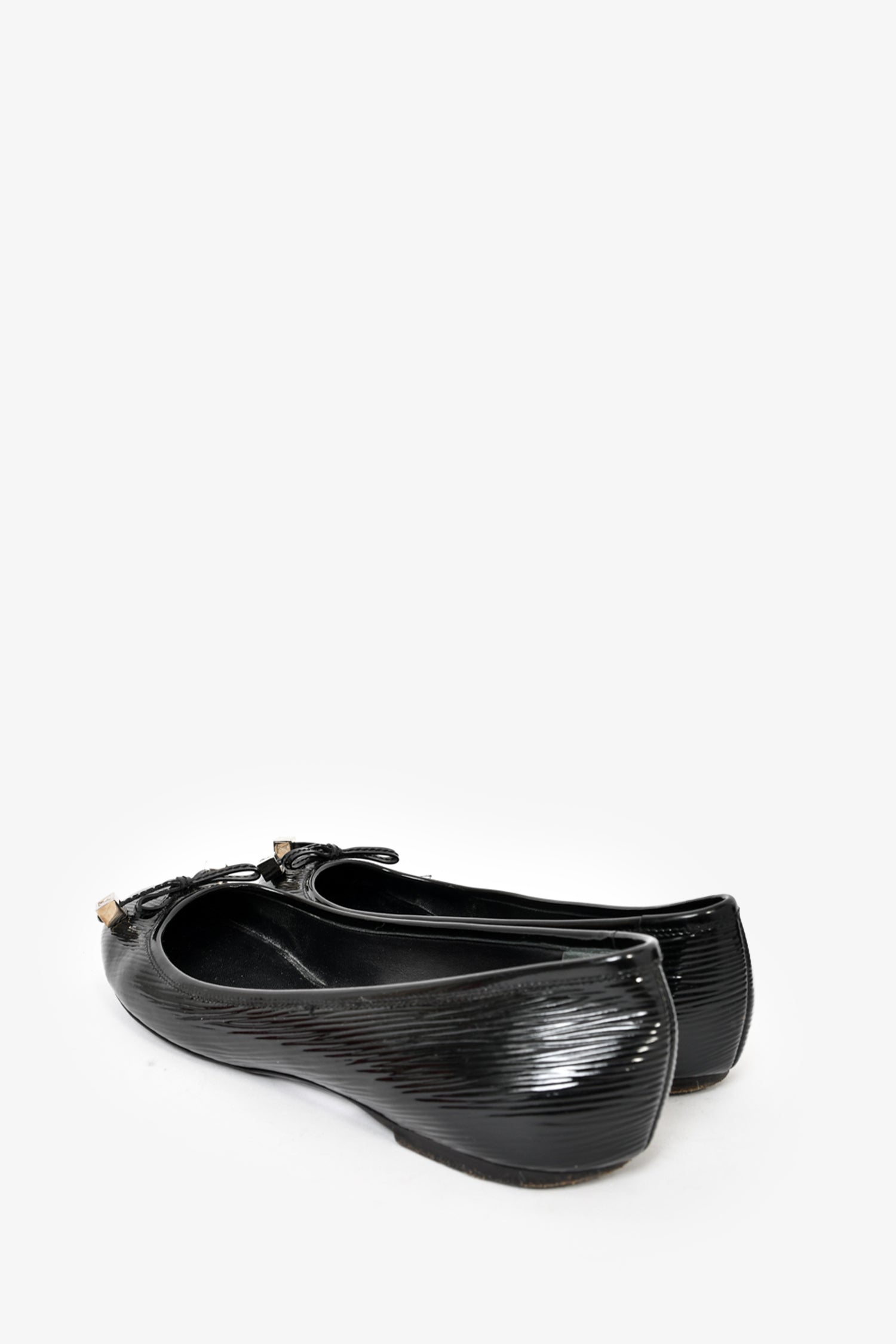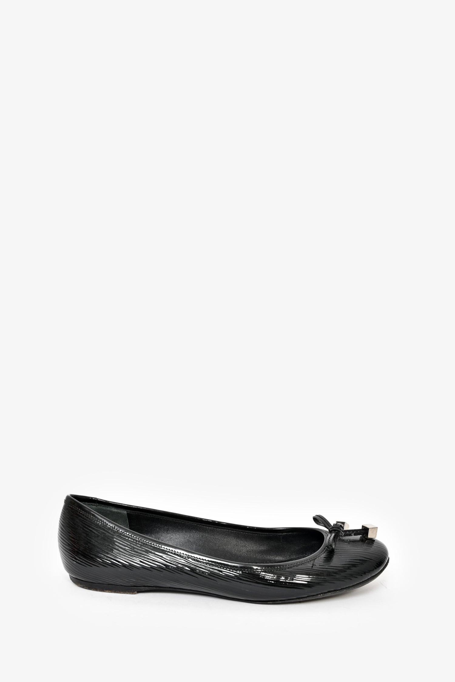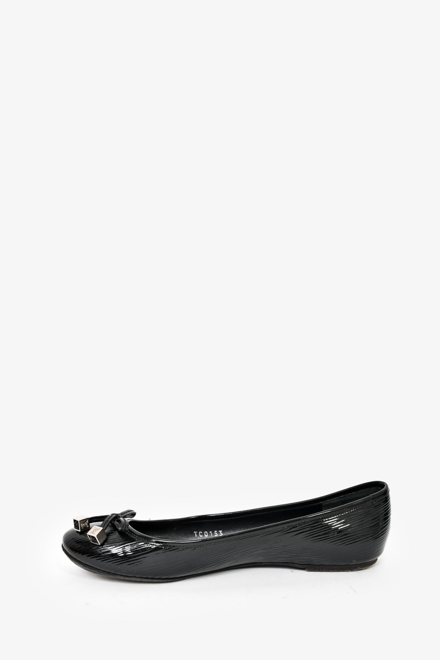 Refresh availabilityLouis Vuitton Black Patent Leather Ballet Flats with LV Toggle. Round toe. Slip on. Tonal stitching.