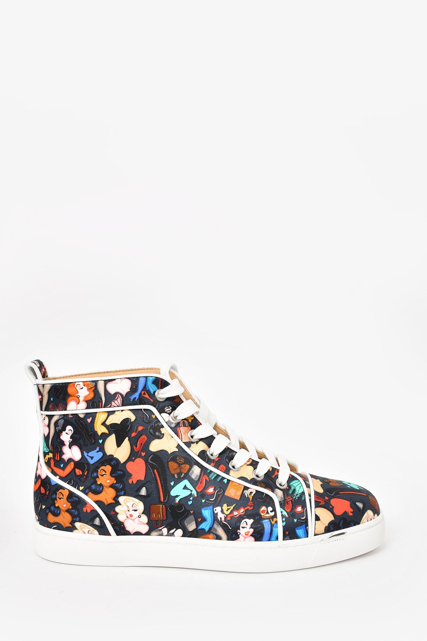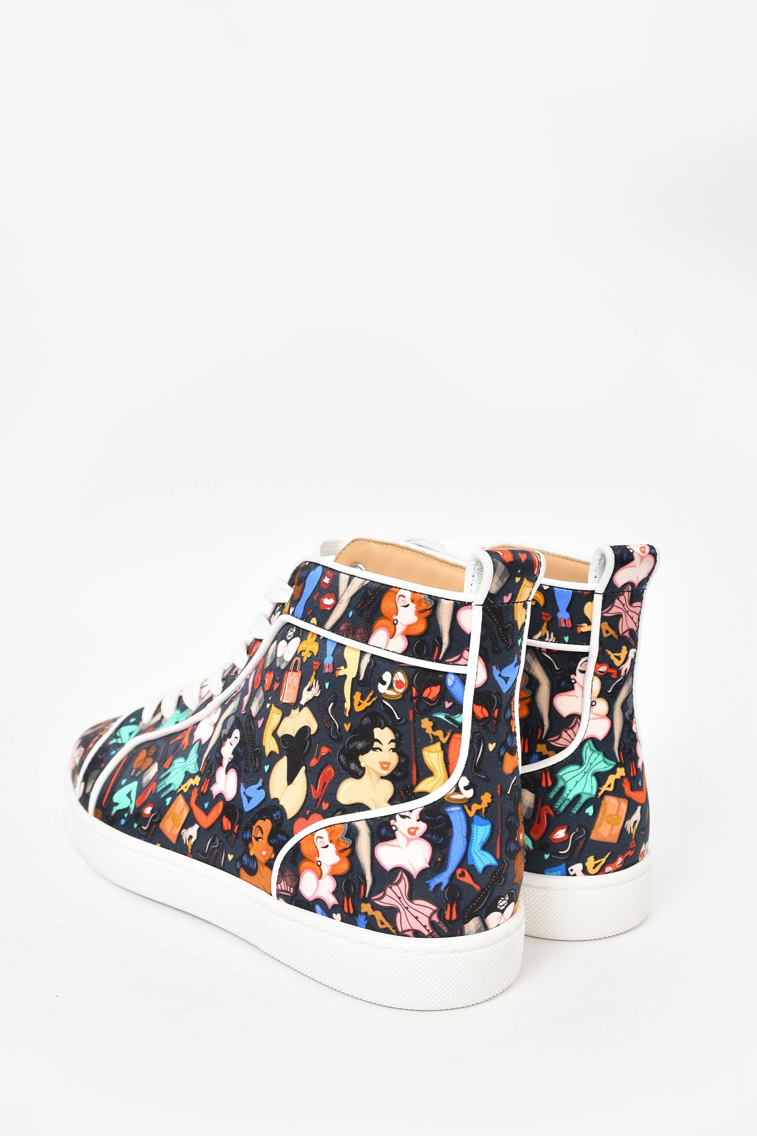 Refresh availabilityChristian Louboutin Black Printed Satin Louis Orlato High Top Sneakers. Front lace up closure. Round toe. Tonal stitching.