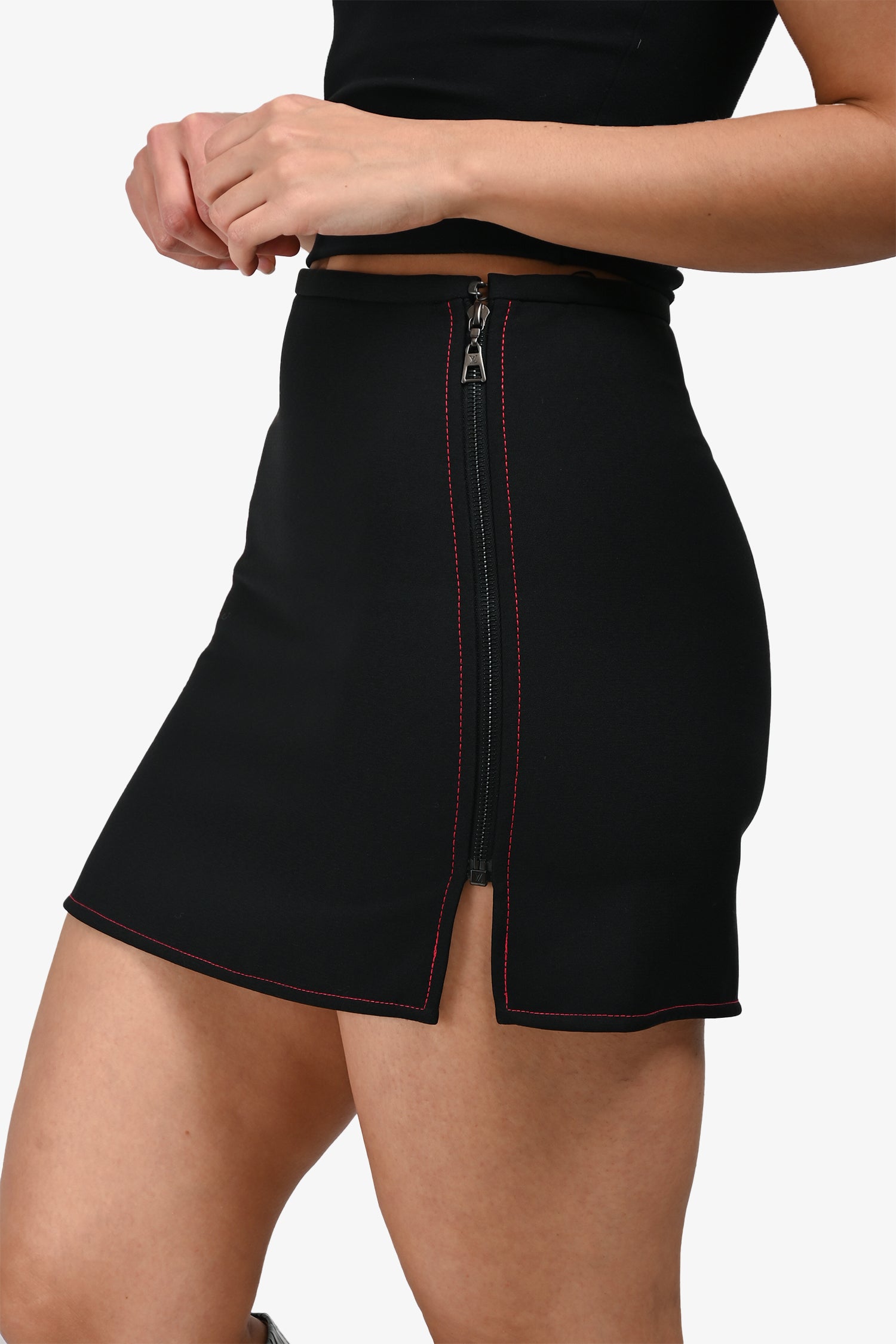 Refresh availabilityLouis Vuitton Black/Red Top Stitch Mini Skirt. Pull-on. Side zipper closure. Contrast stitch detailing. Silver-tone hardware. Tonal stitching.