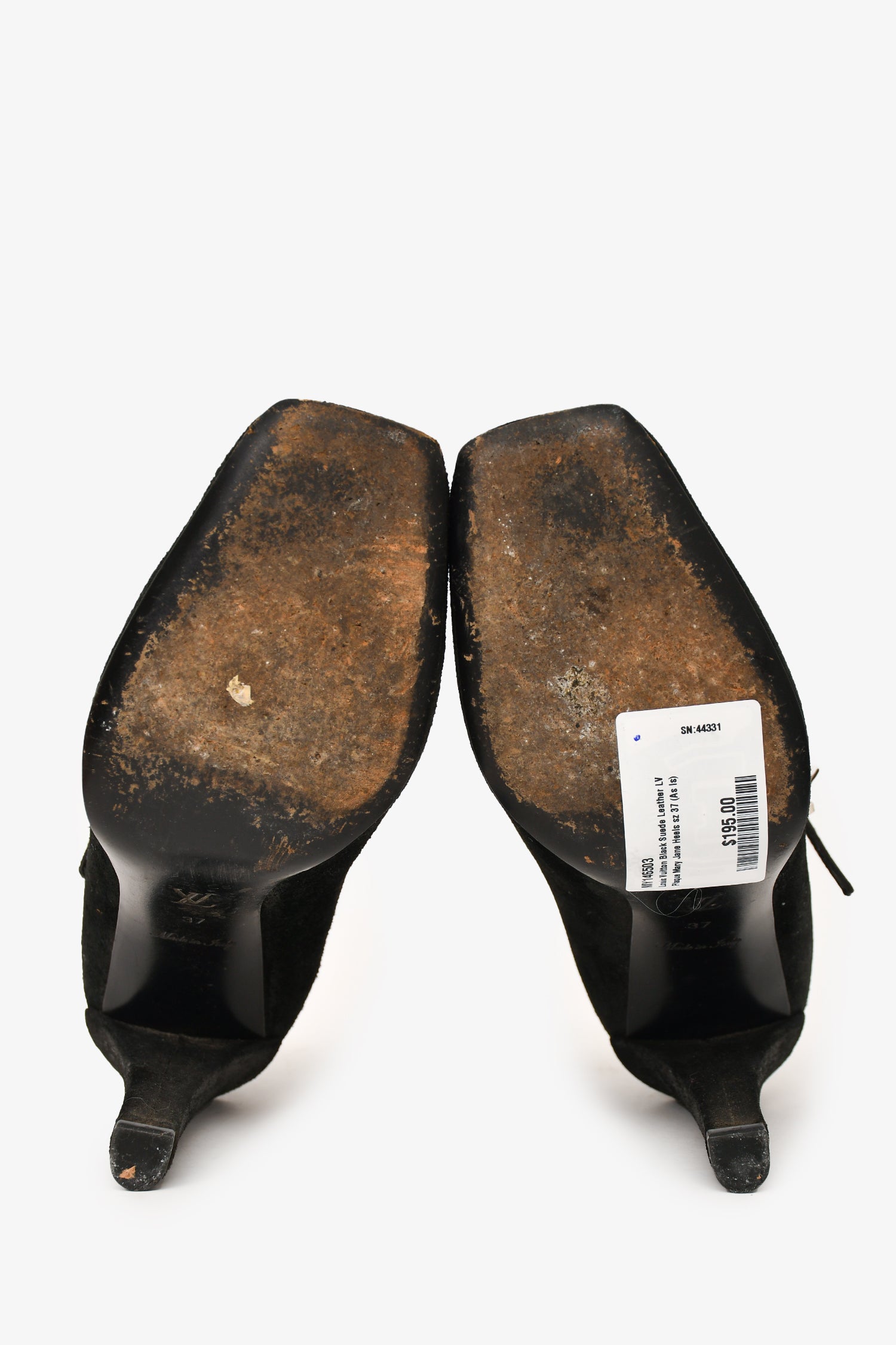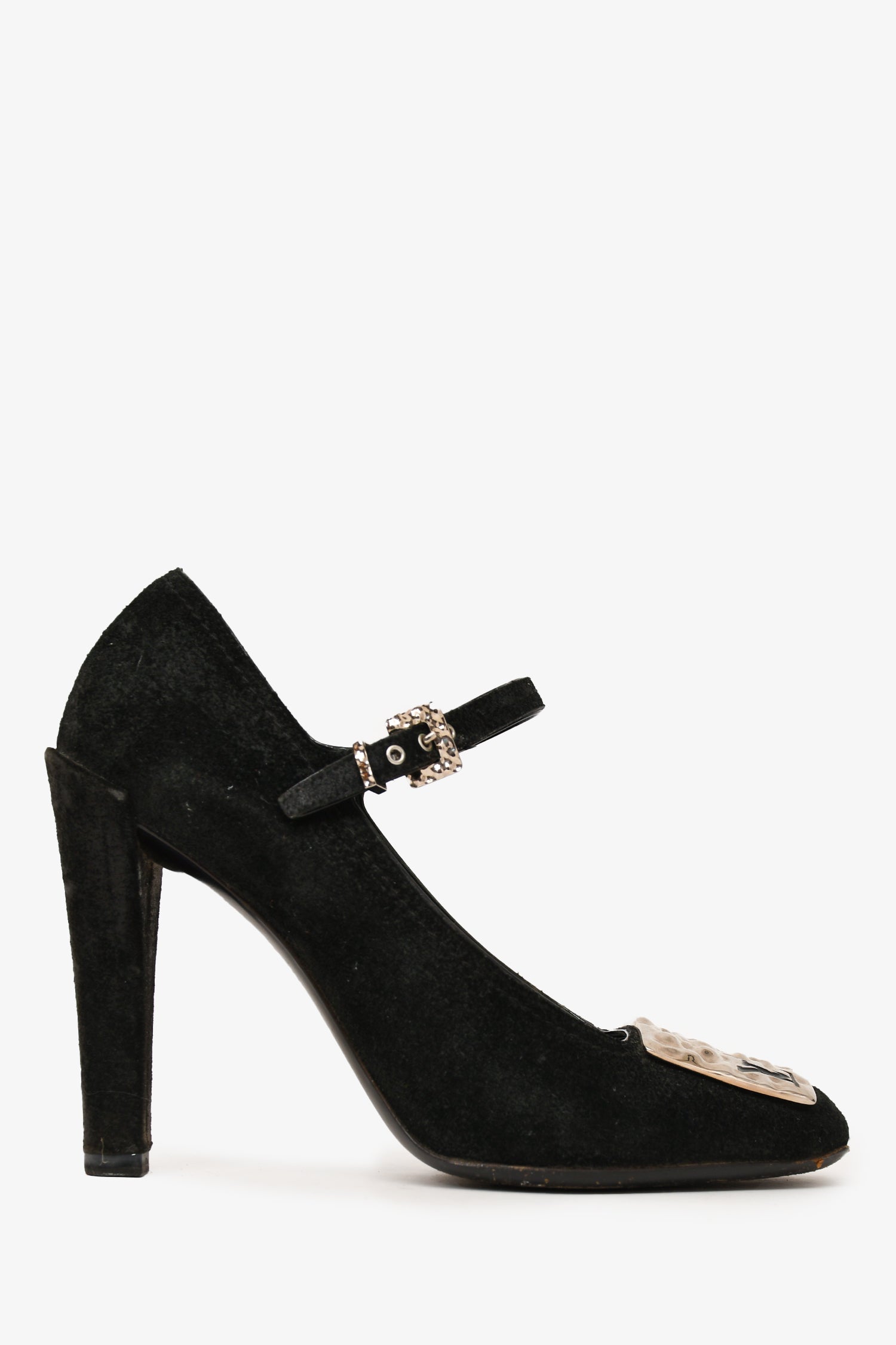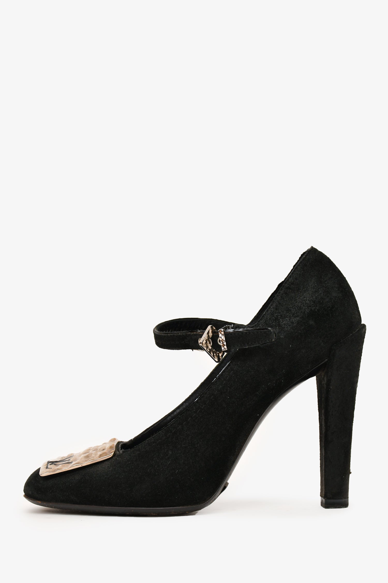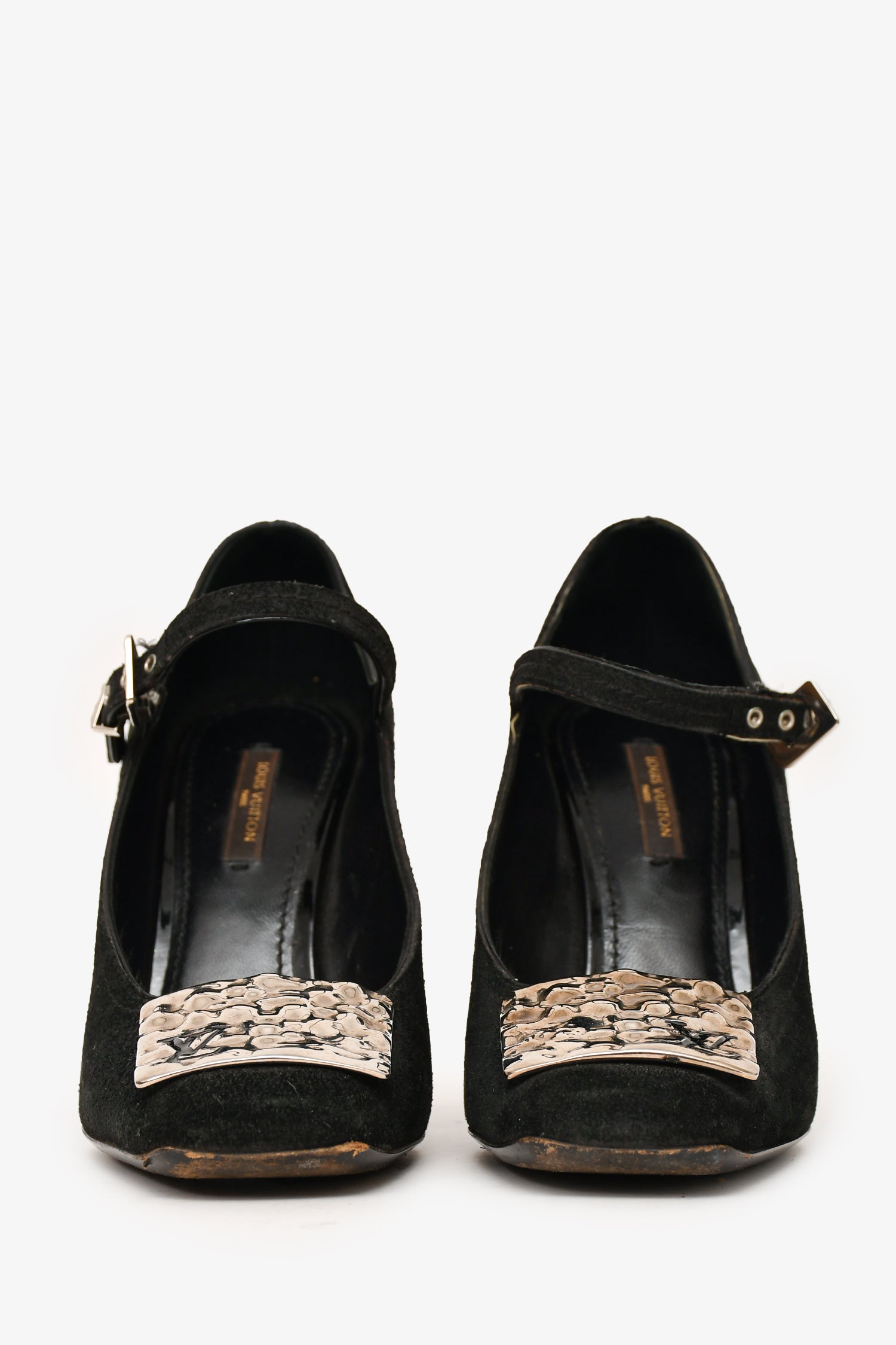 Refresh availabilityLouis Vuitton Black Suede Leather LV Plaque Mary Jane Heels. Silver-tone hardware. Ankle buckle closure. Square toe. Tonal stitching.