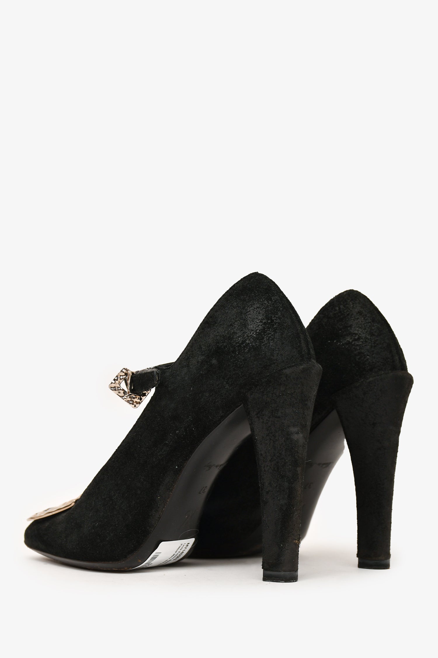 Louis Vuitton Black Suede Leather LV Plaque Mary Jane Heels Size 37