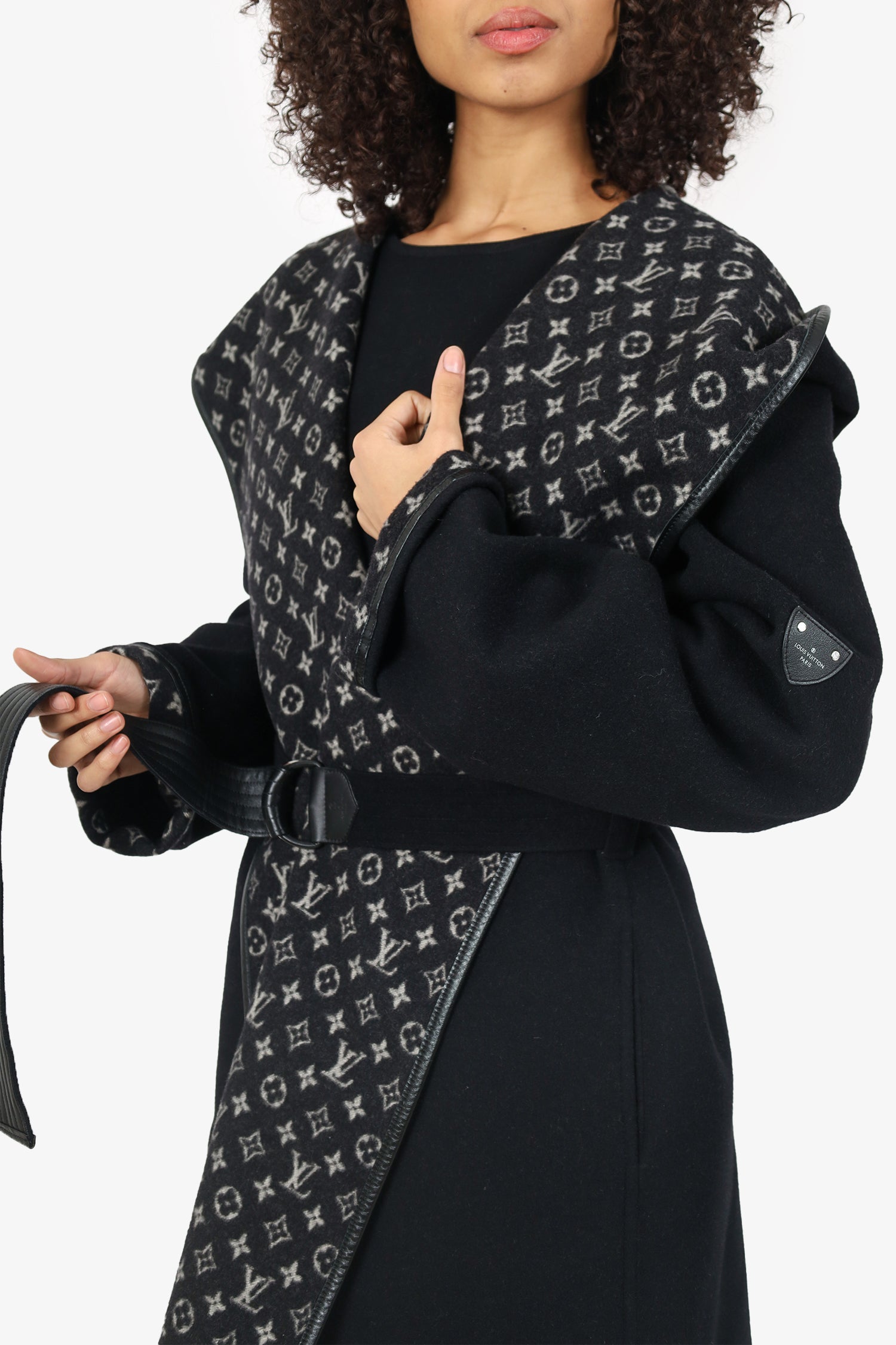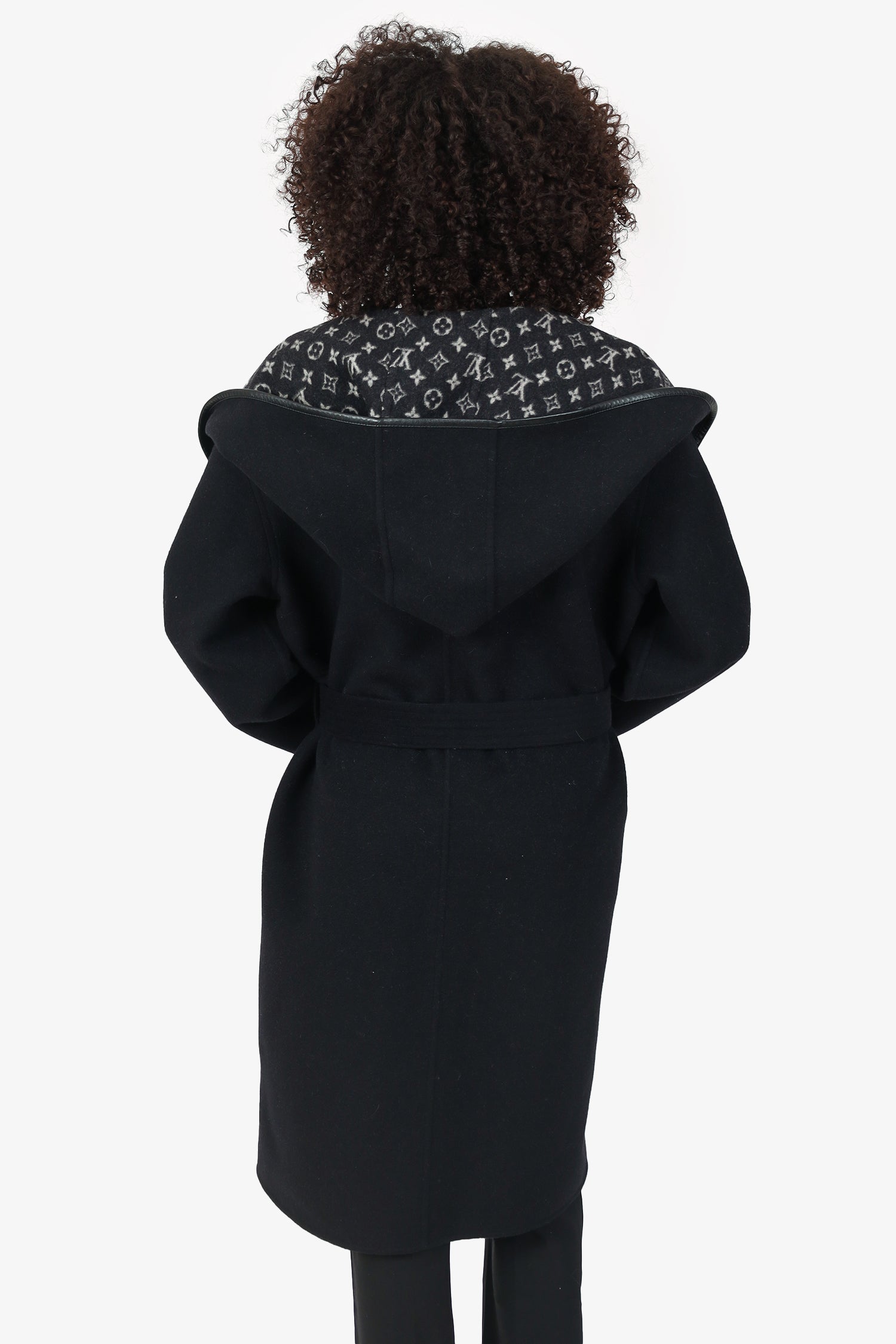 Louis Vuitton Black Wool Monogram Hooded Wrap Coat Size 44