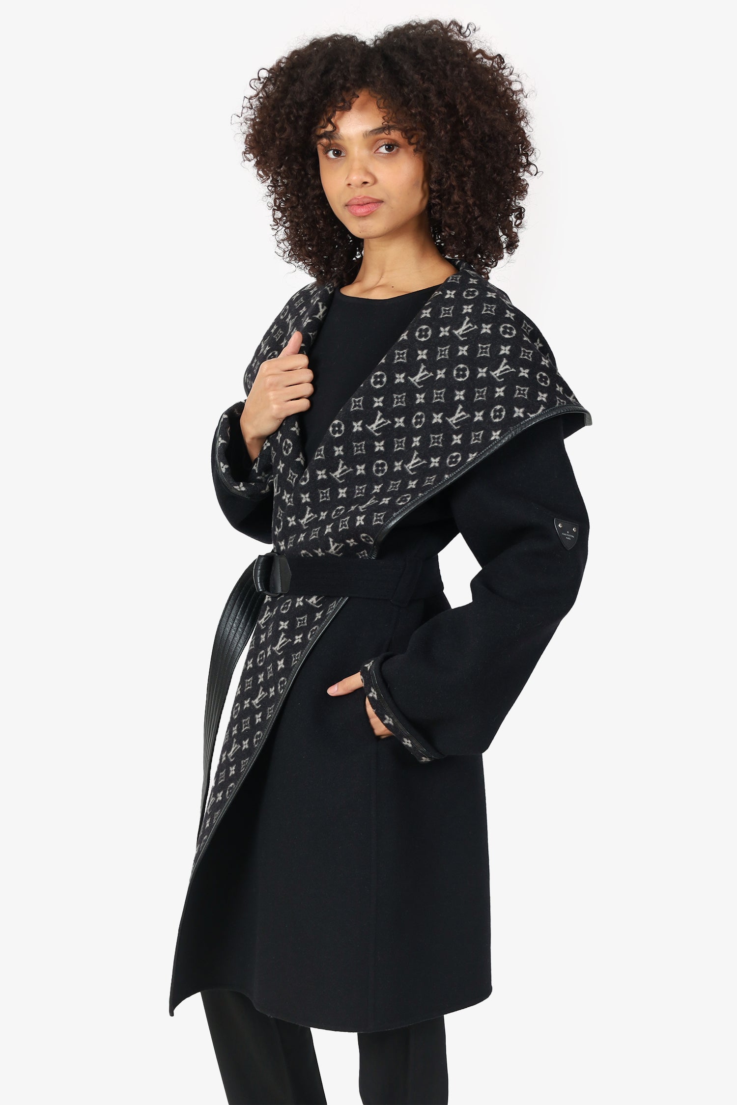 Refresh availabilityLouis Vuitton Black Wool Monogram Hooded Wrap Coat. Pull-on. V-neckline. Front adjustable belt closure. 2 exterior side slip pockets. Monogram print interior. Silver-tone hardware. Tonal stitching.