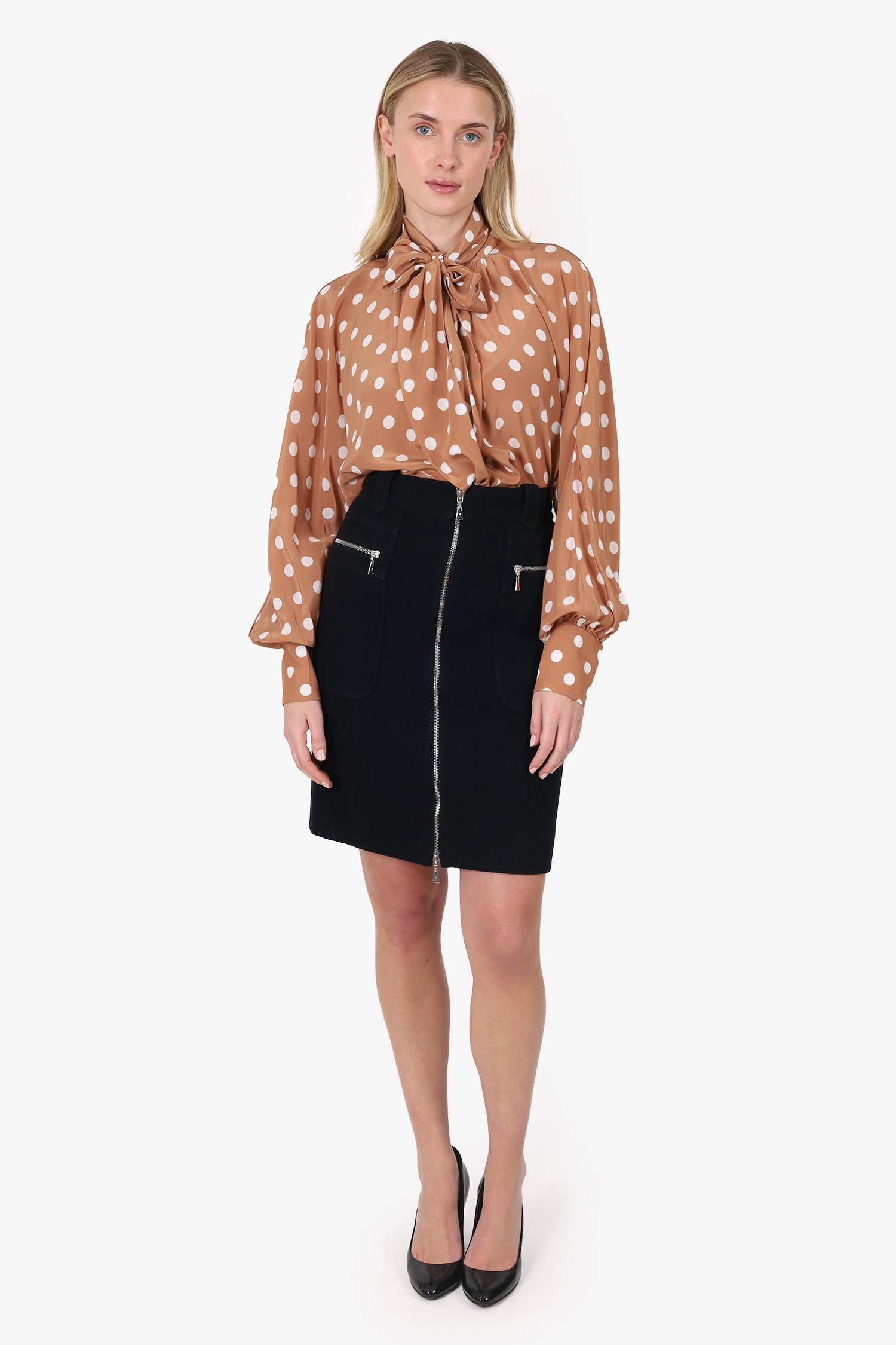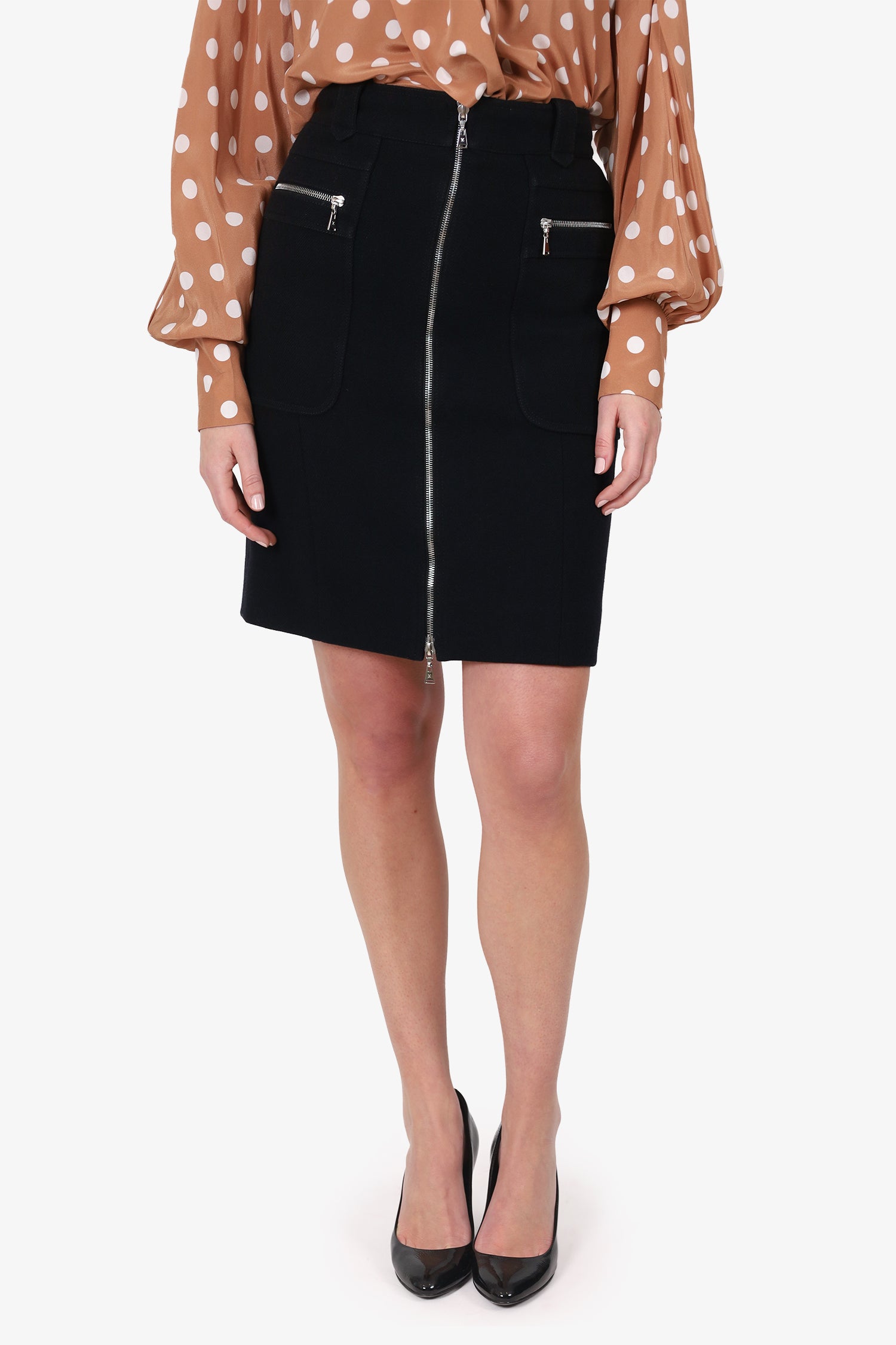 Refresh availabilityLouis Vuitton Black Wool Zip Detail Pencil Skirt. Slip-on. Front zip-up closure. Waistband belt-loops. 4 exterior zip-up pockets; 2 side, and 2 rear. Lined interior. Silver-tone hardware. Tonal stitching.