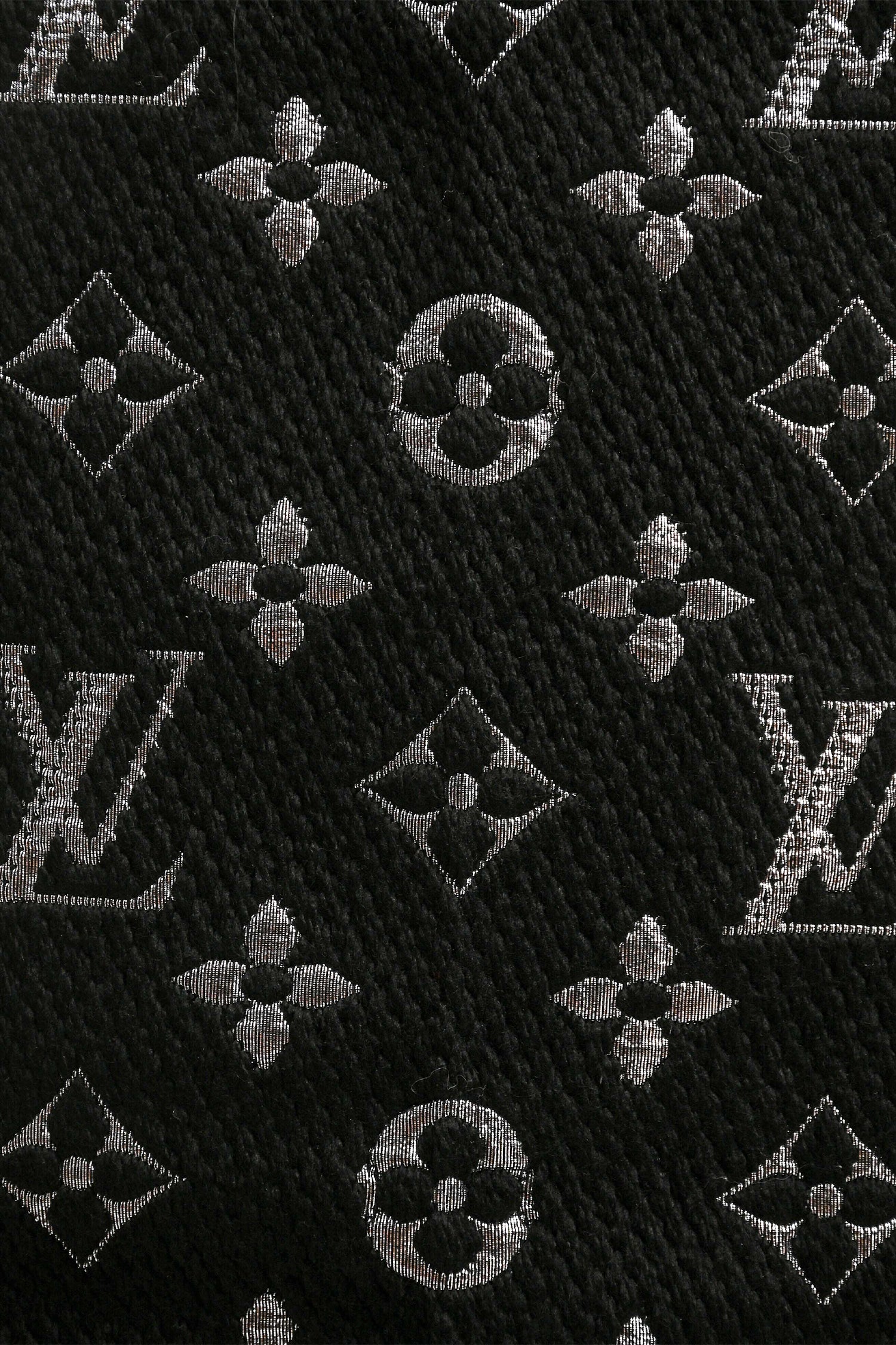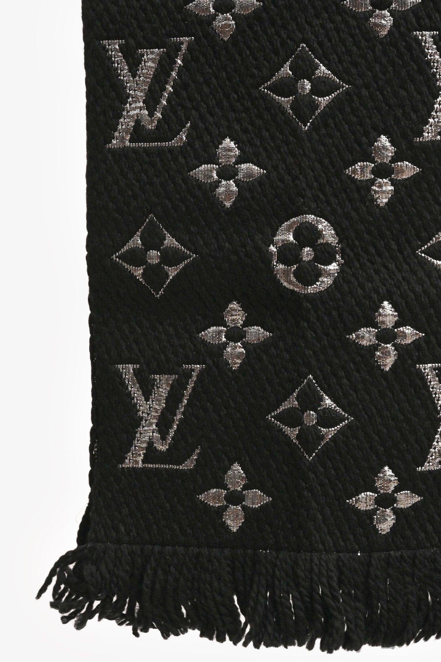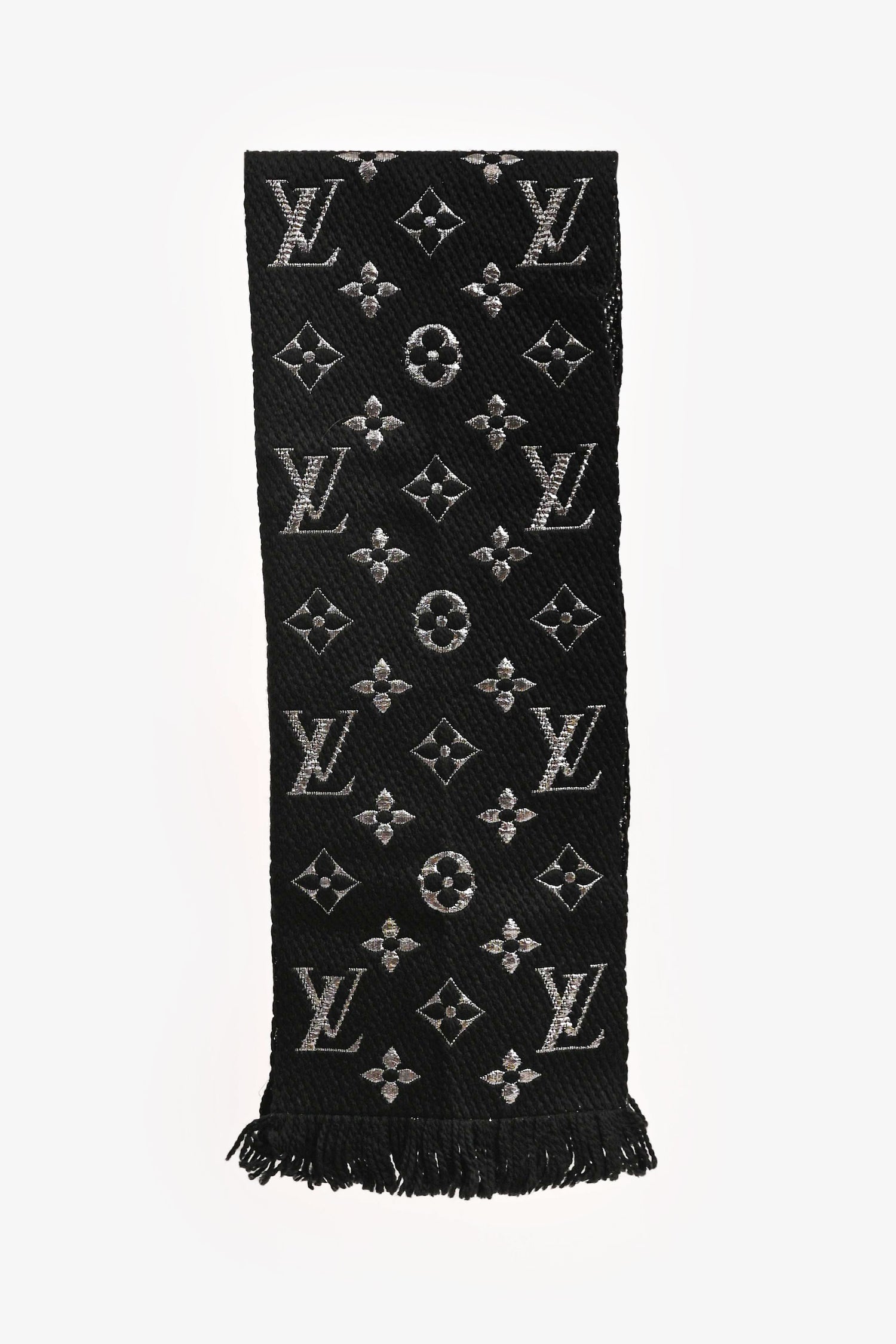 Refresh availabilityLouis Vuitton Black Wool/Silk Metallic Silver Logo Scarf. Fringe edges. Metallic interior. Tonal stitching.