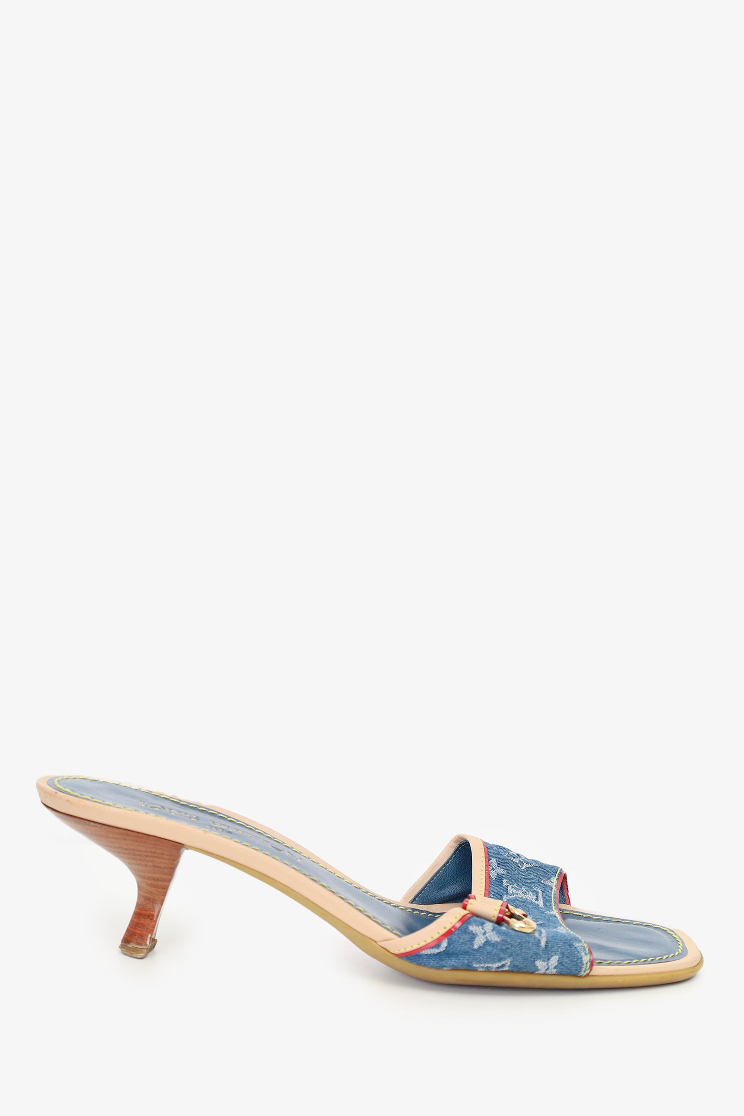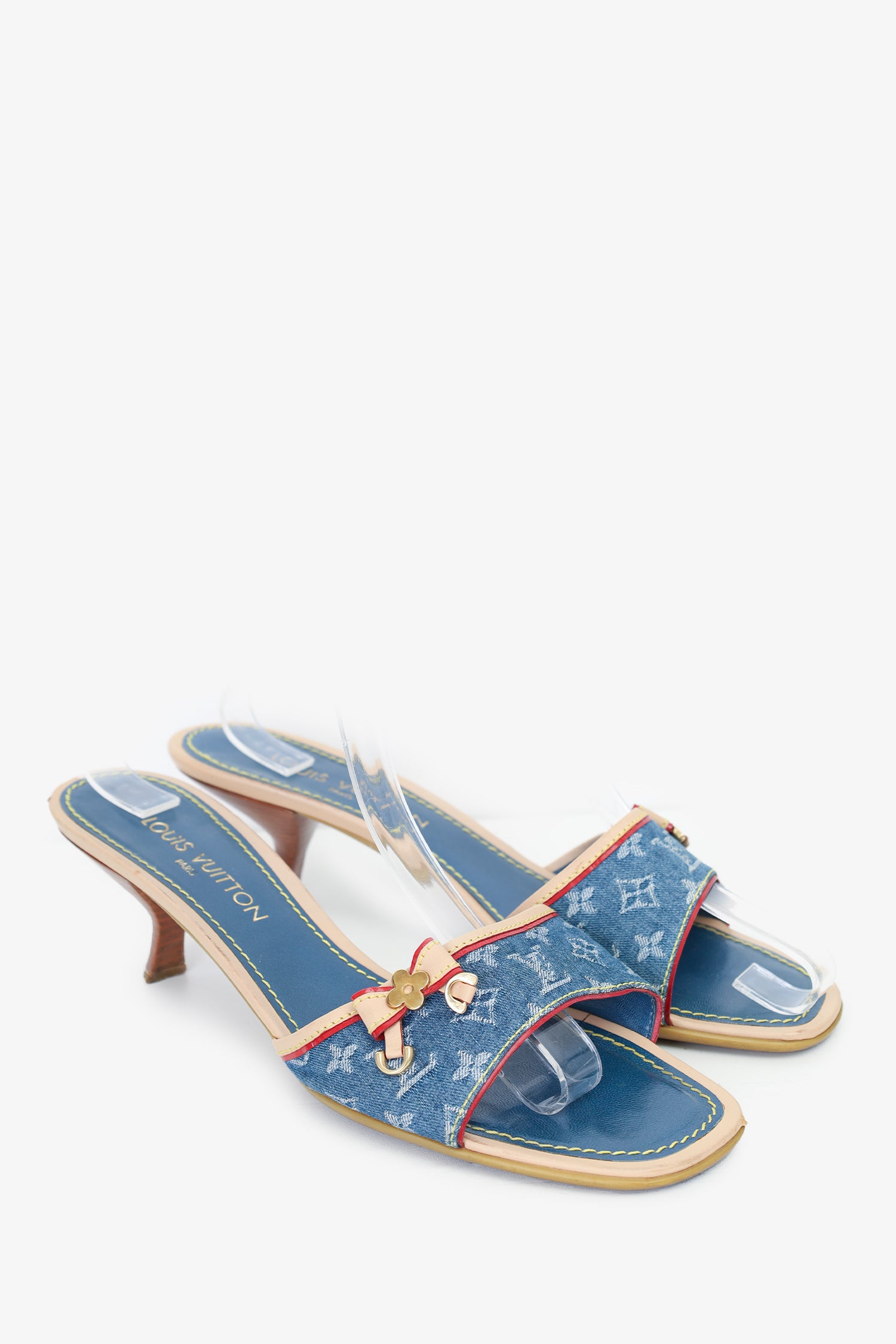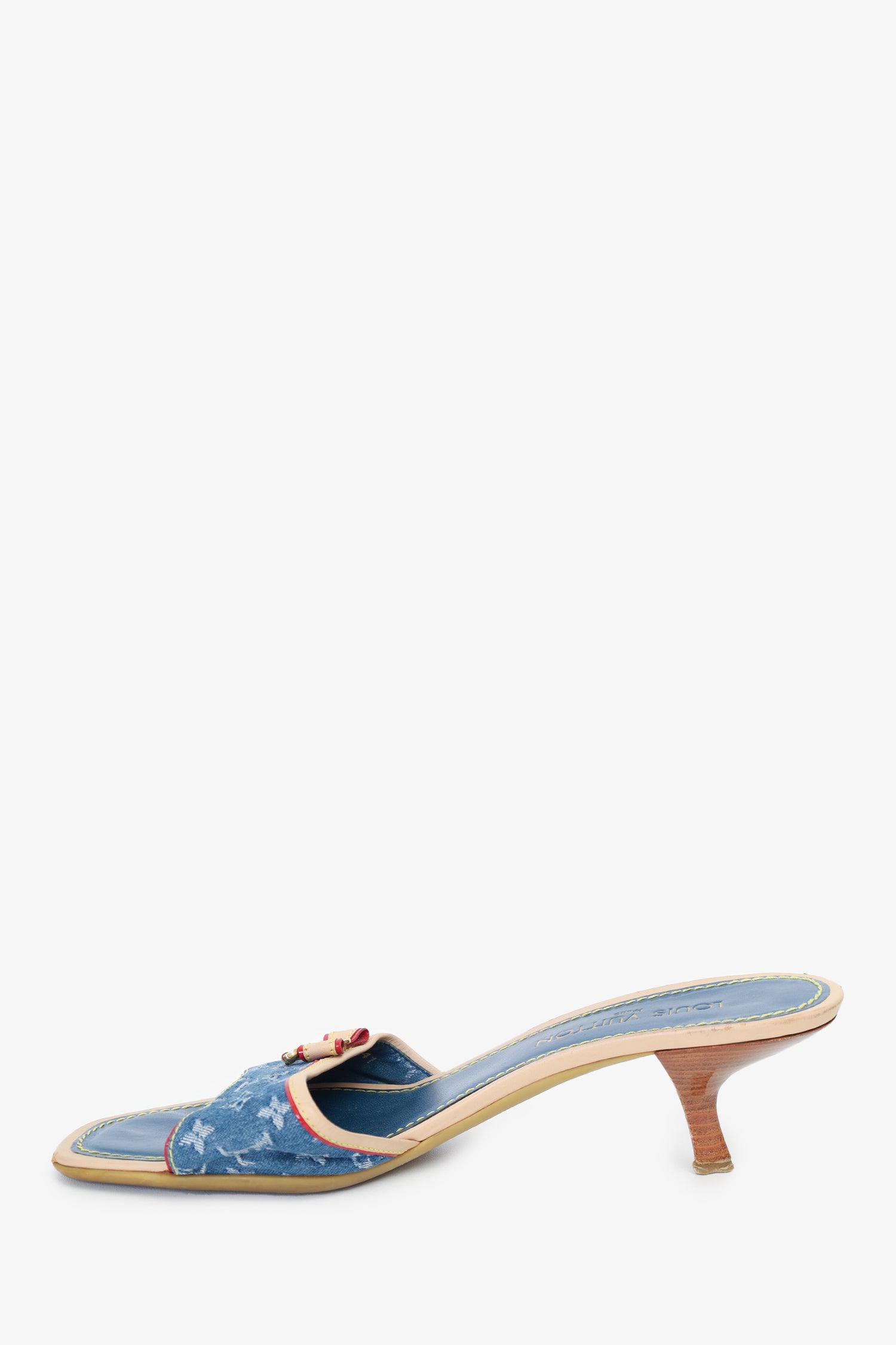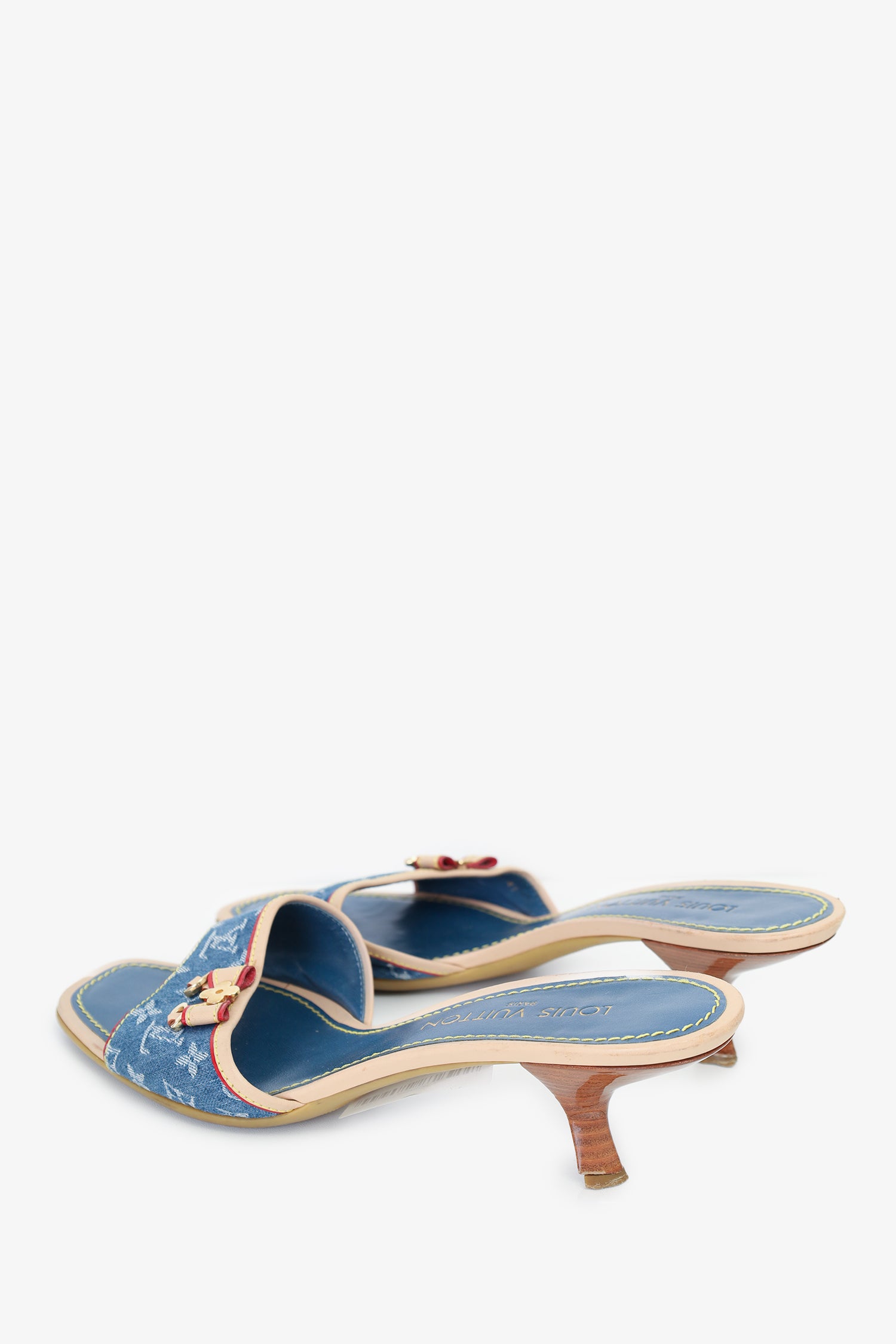 Refresh availabilityLouis Vuitton Blue Denim Monogram Bow Kitten Heels. Slip-on. Open toe. Tonal stitching.