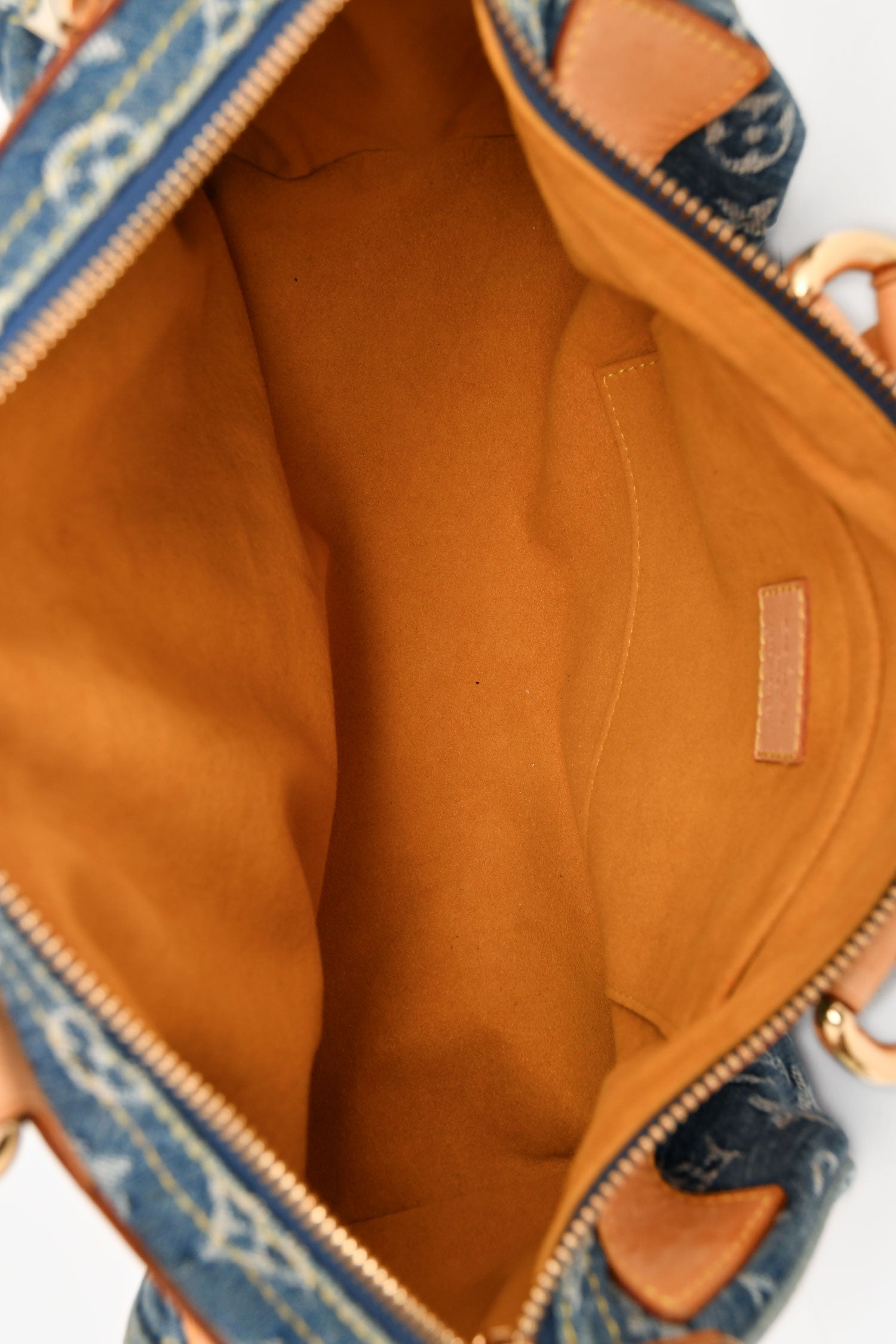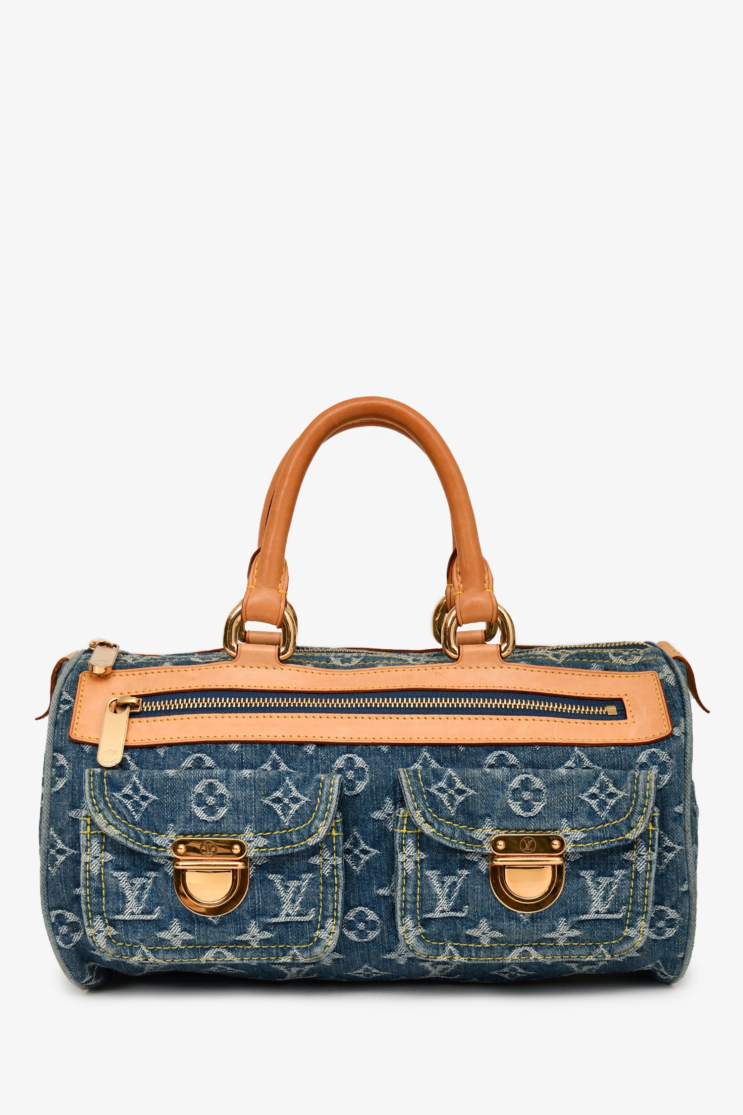 Refresh availabilityLouis Vuitton Blue Denim Neo Speedy 30. Dual rolled leather top handles. Top zip closure. Two front flap pockets with push-lock closures. One exterior zip pocket. Leather trim throughout. Lined interior with slip pocket. Gold-tone hardware. Contrast stitching.
