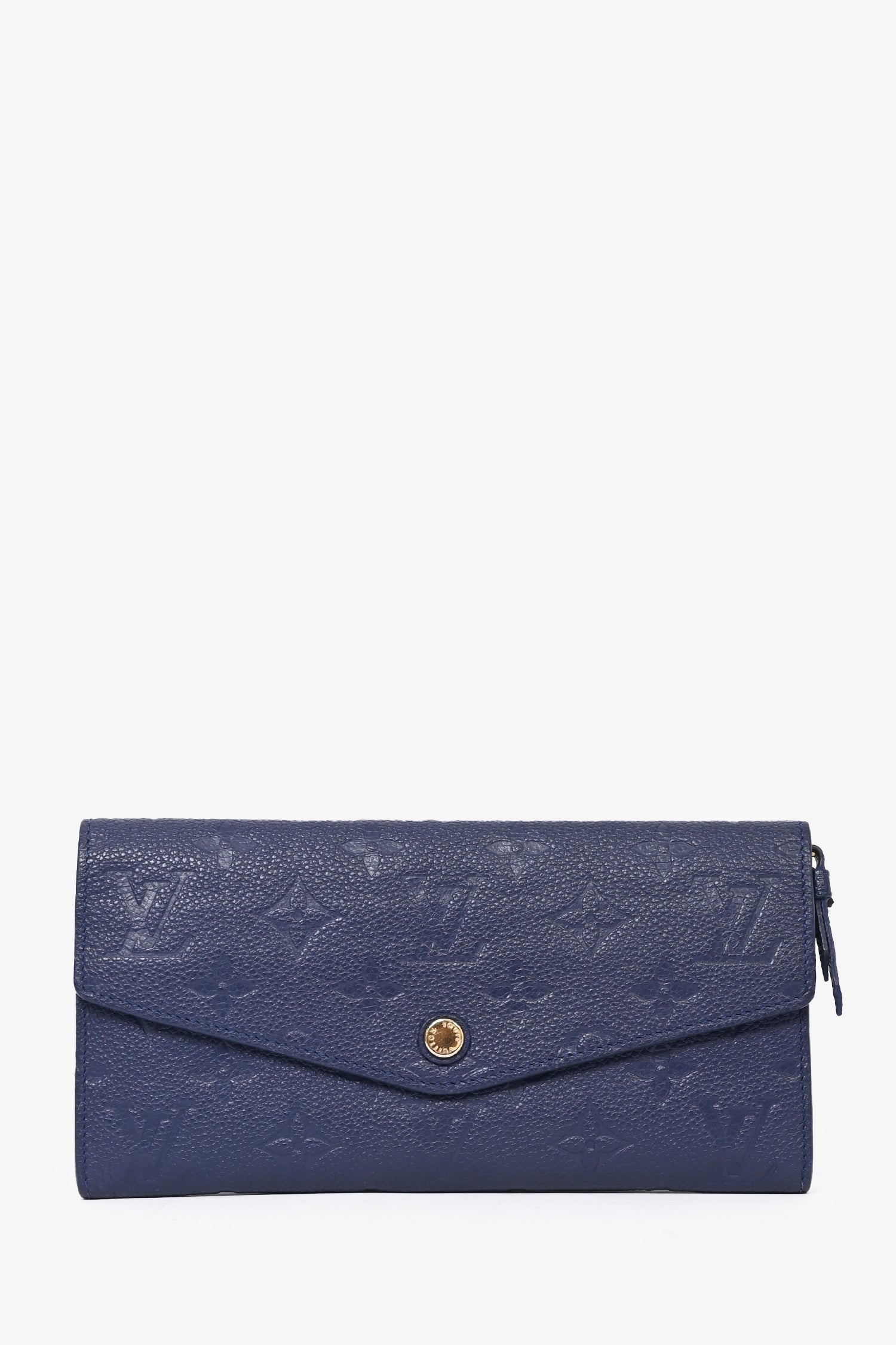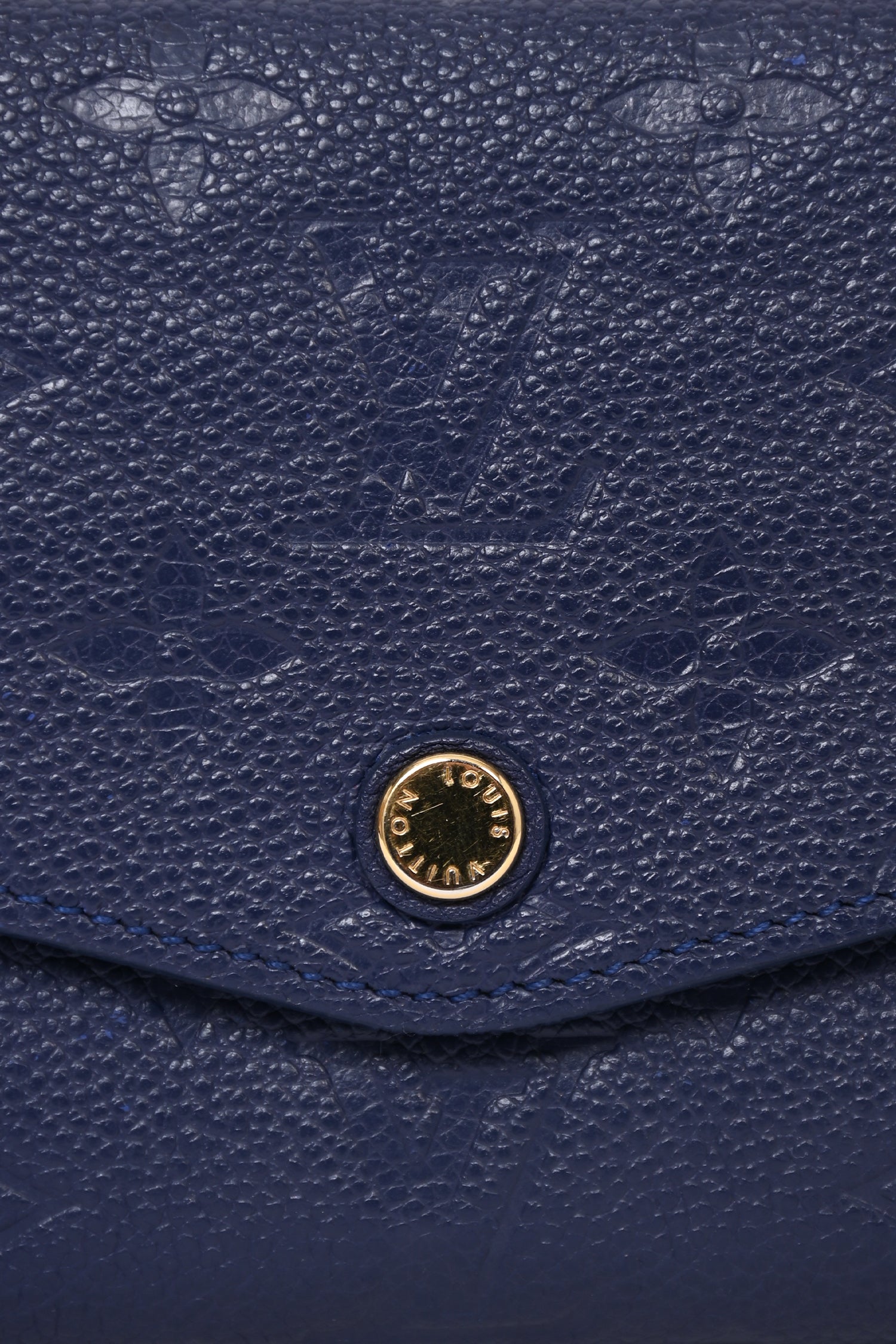 Refresh availabilityLouis Vuitton 2013 Blue Empreinte Leather Curieuse Wallet. 6 interior card slip pockets. Fold-over flap with button closure. 2 interior compartments. 1 interior removable pouch with zip closure. Gold-tone hardware. Tonal stitching.