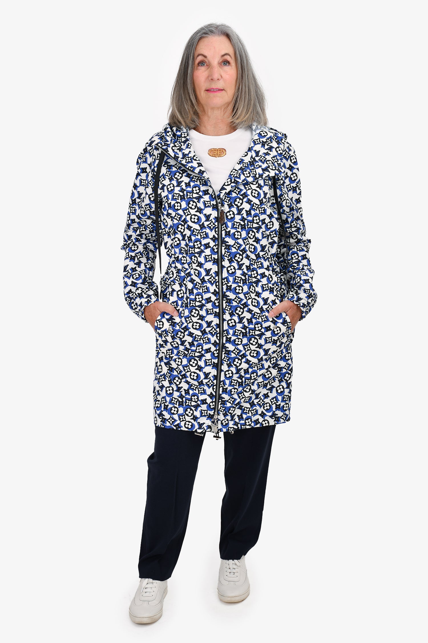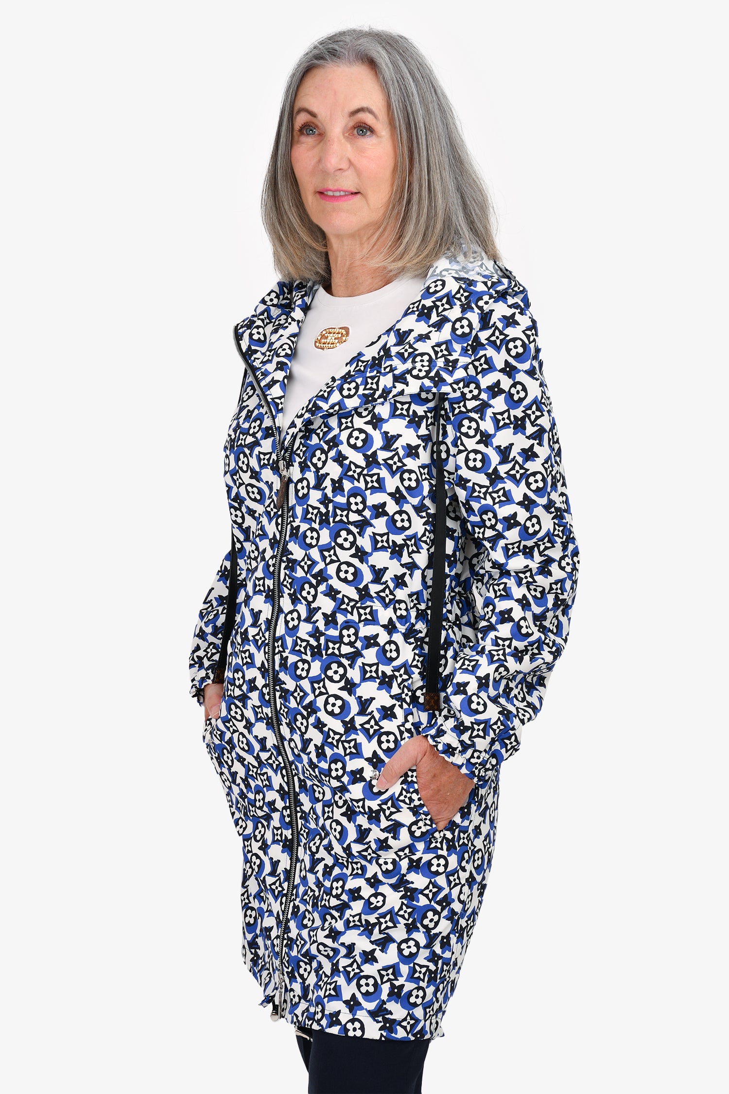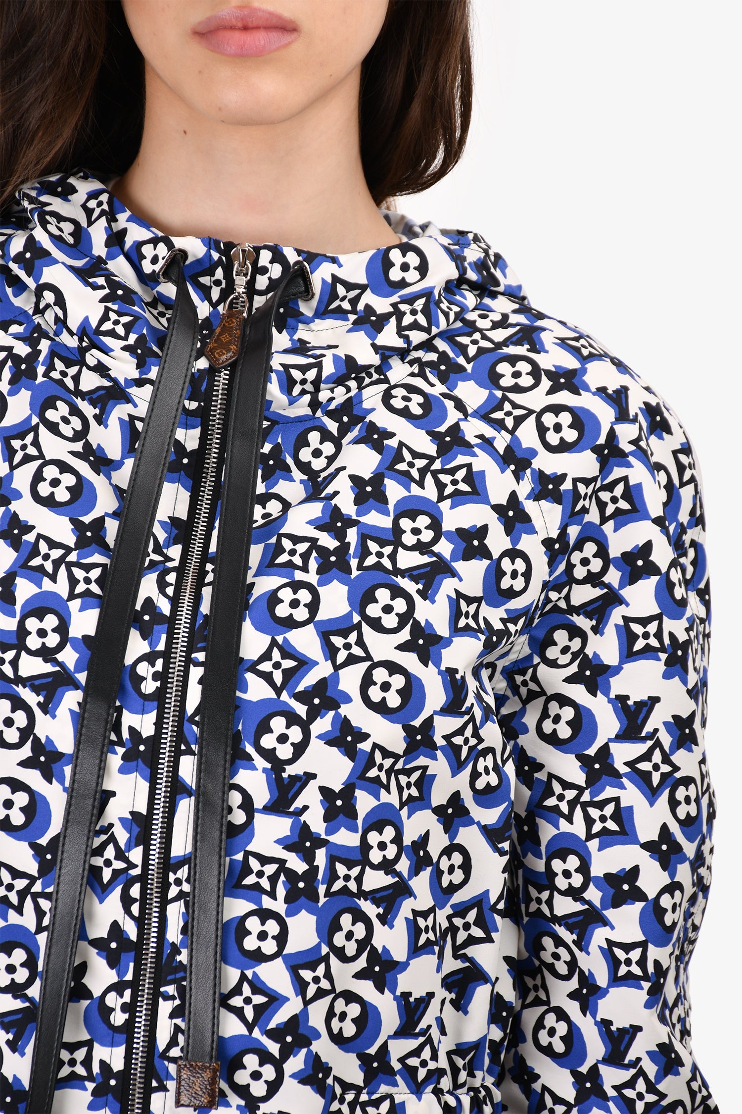 Refresh availabilityLouis Vuitton Blue/White Monogram Zip-up Rain Coat. Front zip closure. Front pockets. Leather drawstrings with hood. Elastic bands around waist and bottom. Two interior pockets. Unlined. Tonal stitching.